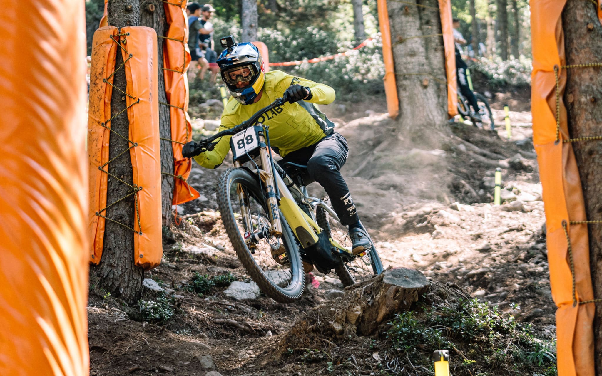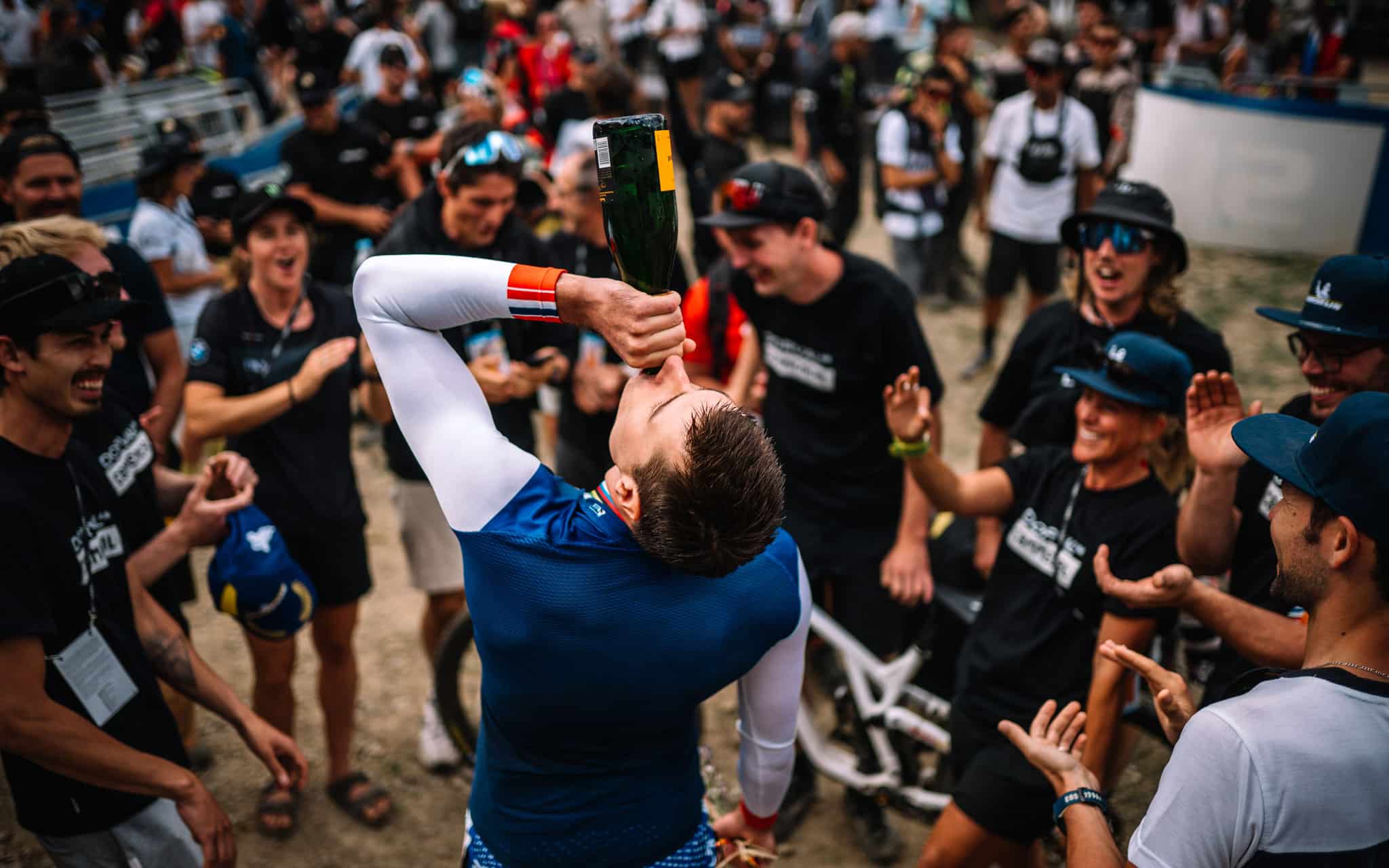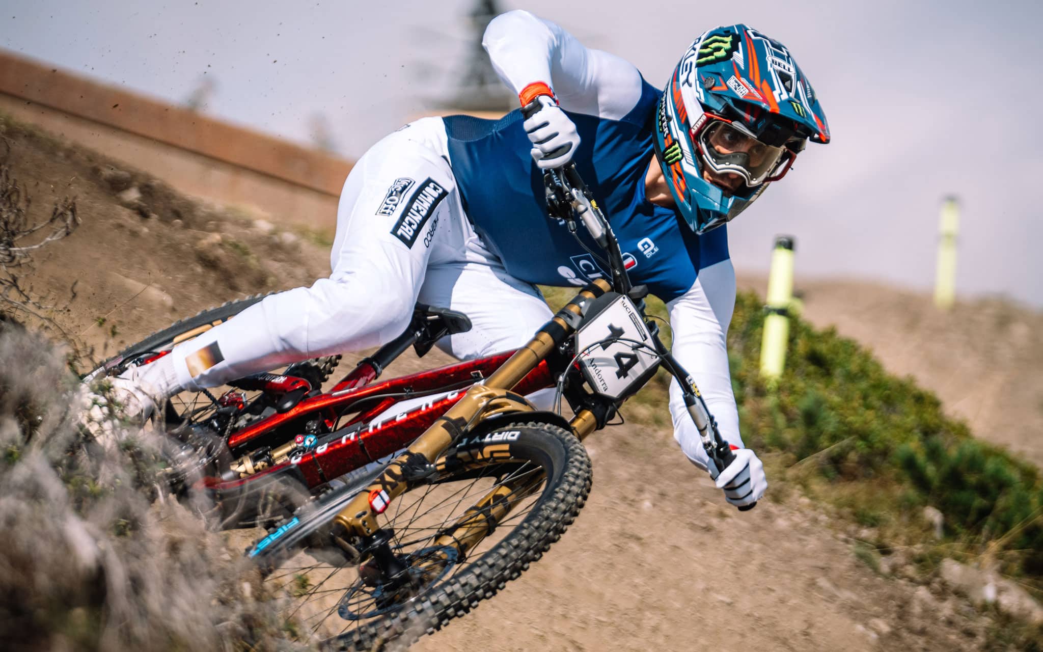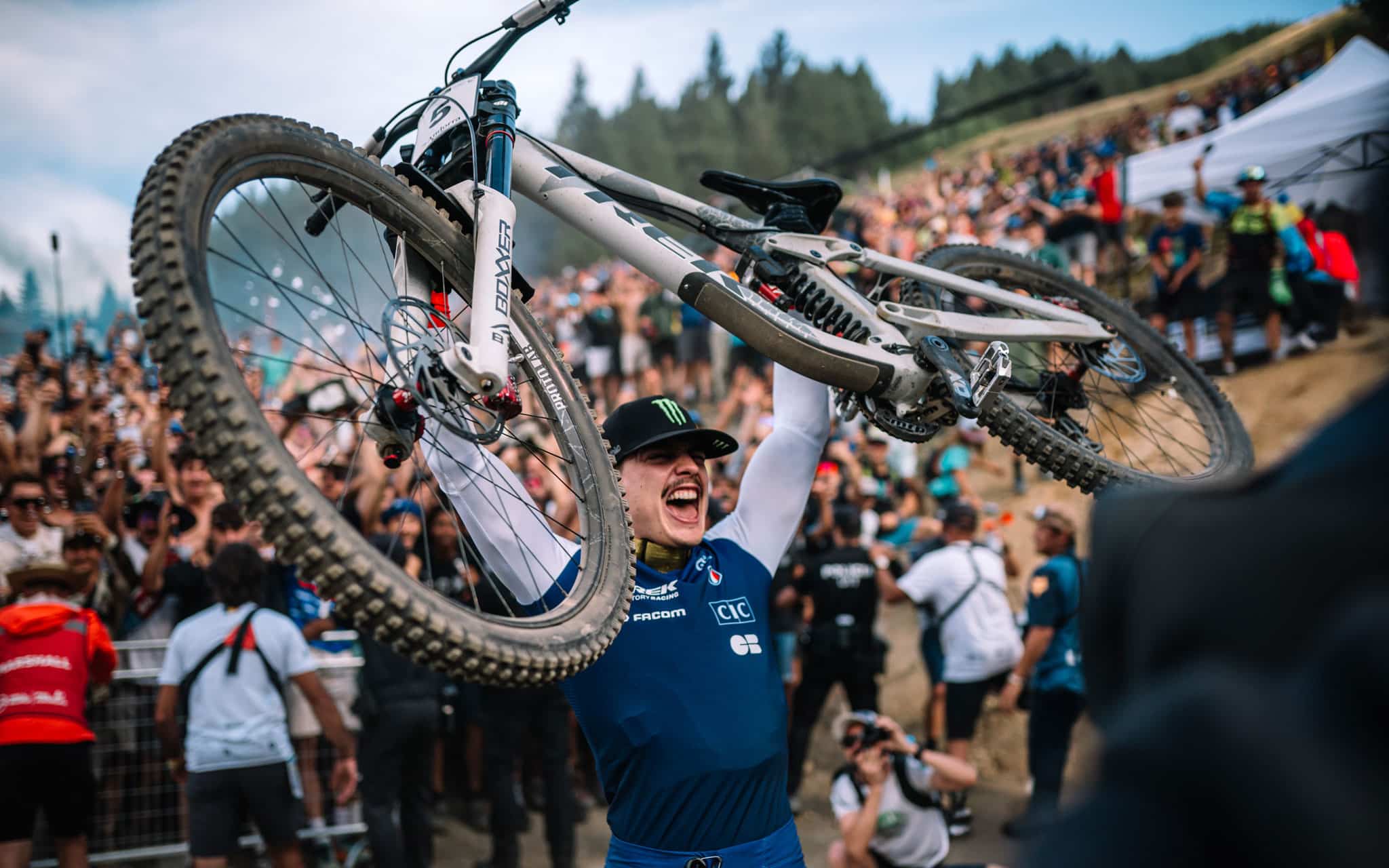 S’il y a bien un pilote qui sait comment sortir LE run le jour J, c’est Loïc Bruni. Déjà cinq fois champion du monde Elite, le Français se verrait bien ajouter un 6e maillot arc-en-ciel à sa collection et s’approcher un peu plus du record de 7 titres de Nicolas Vouilloz. Très impressionnant, SuperBruni semble appliquer son plan habituel à la perfection puisqu’il compte pratiquement 2 secondes d’avance au 3e intermédiaire. Et puis vient ce dévers très rapide, la roue avant qui décroche, le pilote et le vélo qui s’envolent, et avec eux les espoirs d’un nouveau titre historique…