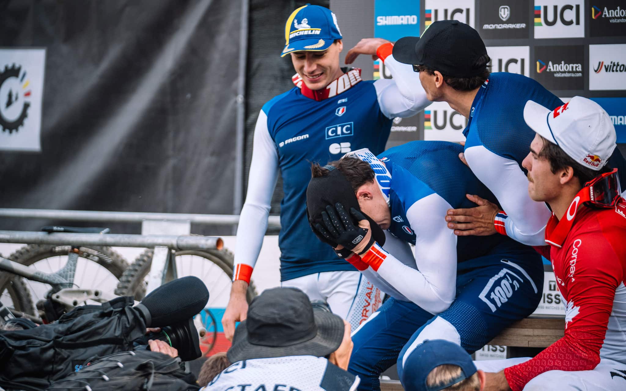 Loris Vergier se couvre le visage avec les mains puis baisse la tête et fond en larmes, comprenant ce que ça signifie : il est champion du monde Elite de descente pour la première fois, 10 ans tout juste après son titre chez les Juniors !