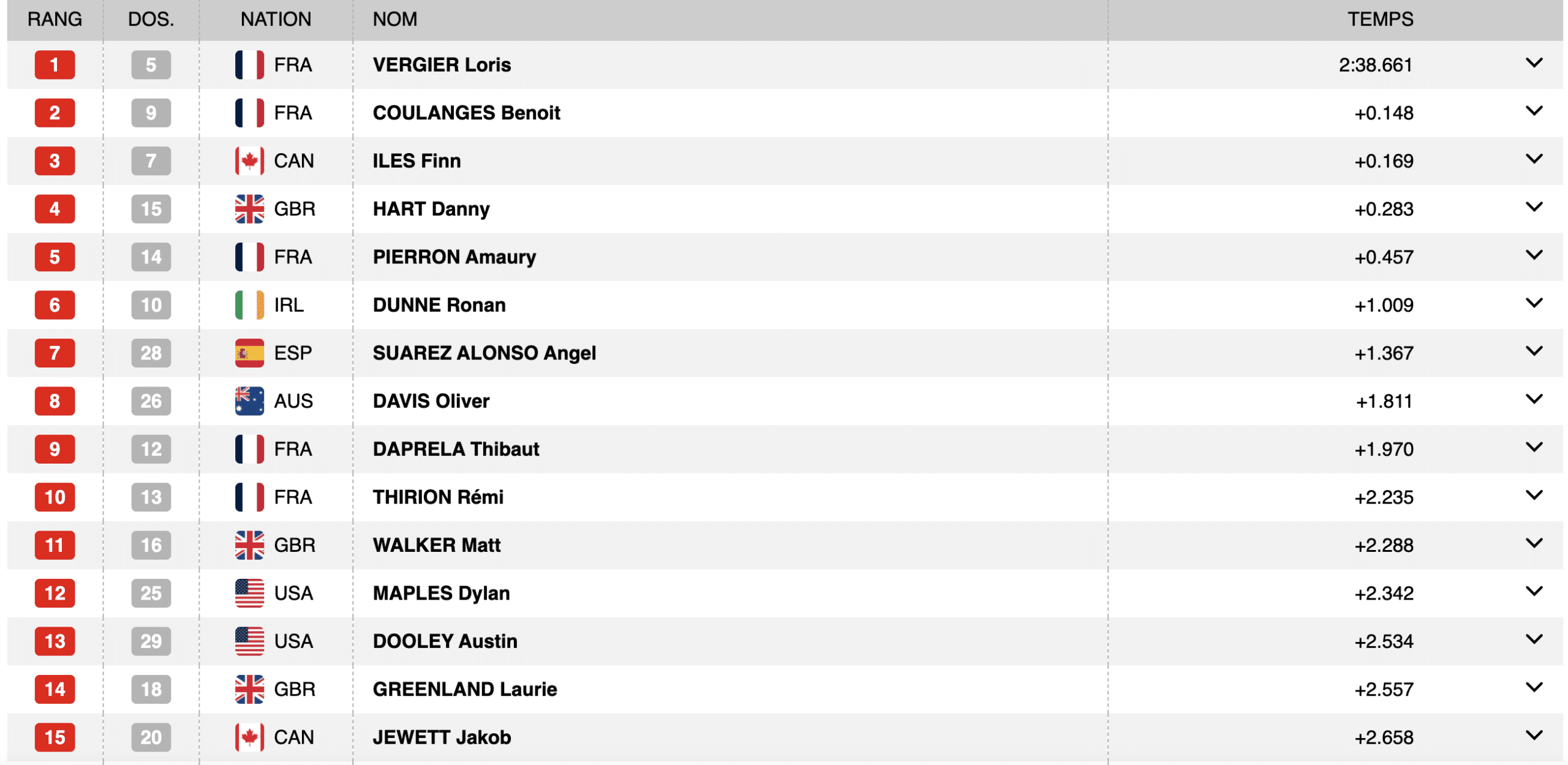 C’est le moment que choisit Loris Vergier pour venir se mêler à la fête. Et comme si ce n’était pas déjà assez serré, le Français vient se placer 0,148 s devant son compatriote Benoît Coulanges. Incroyable !