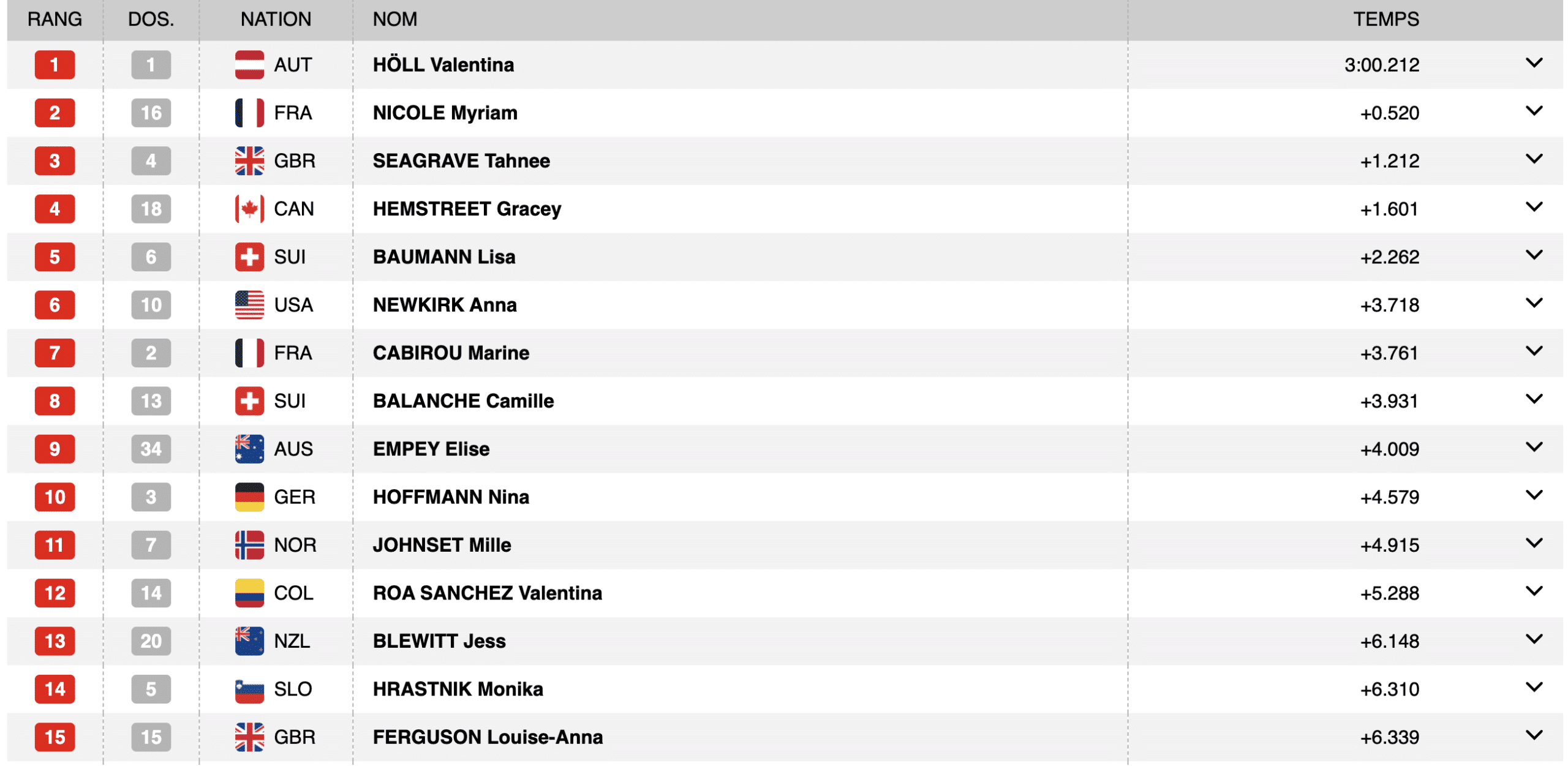 Myriam Nicole s’élance tôt dans cette finale malgré son meilleur temps en qualifications. Et grosse surprise, elle ne bat le temps de référence réalisé juste avant par Gracey Hemstreet que d’une seconde ! Ça risque d’être court pour le titre vu les grands noms qui sont encore au départ…