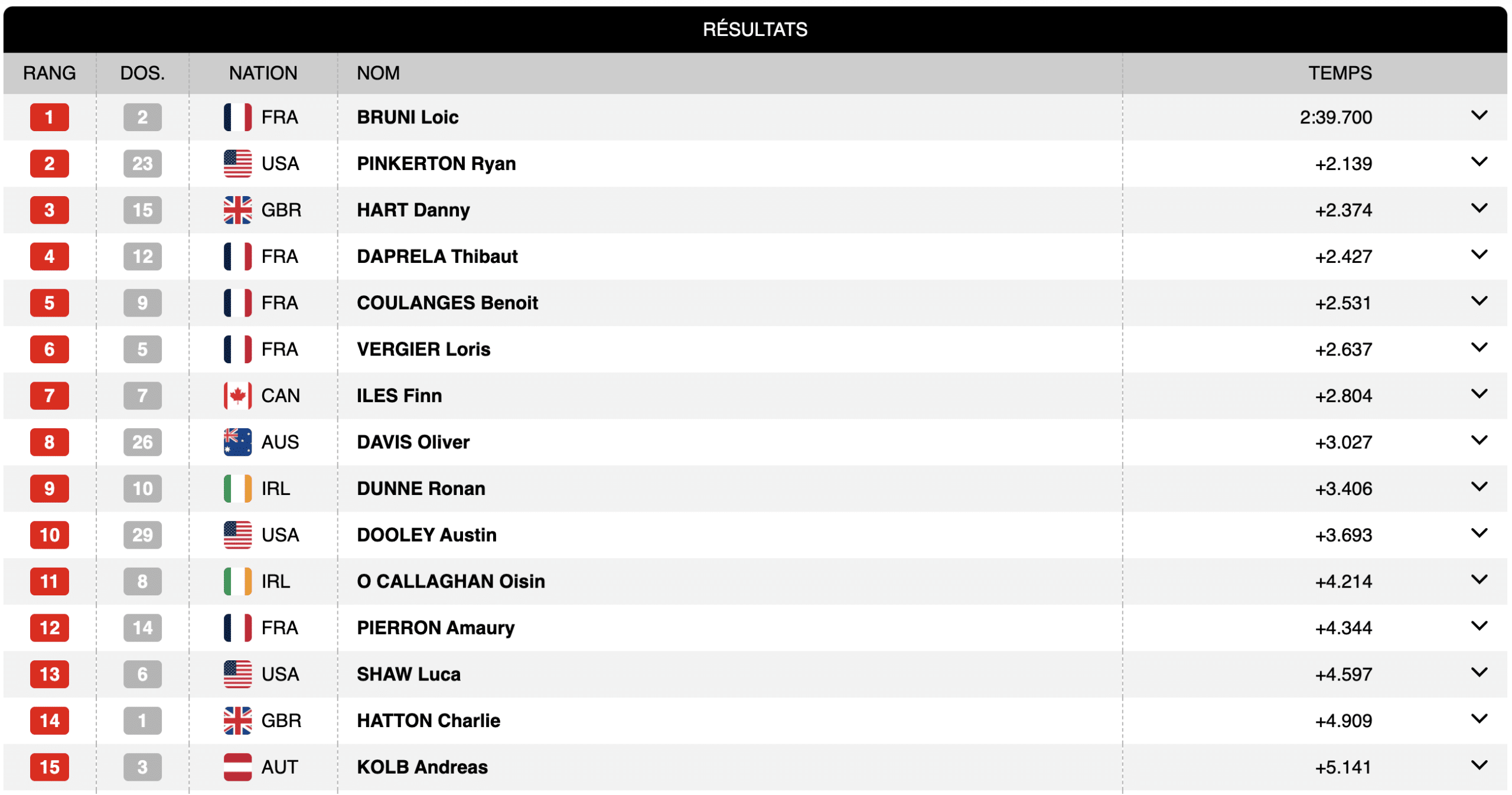 Pointons également la 14e place du champion du monde sortant sortant Charlie Hatton, la 15e d’Andreas Kolb, la 22e de Bernard Kerr, la 28e de Martin Maes, la 30e de Laurie Greenland et la 34e de Greg Minnaar qui participe à ses derniers championnats du monde