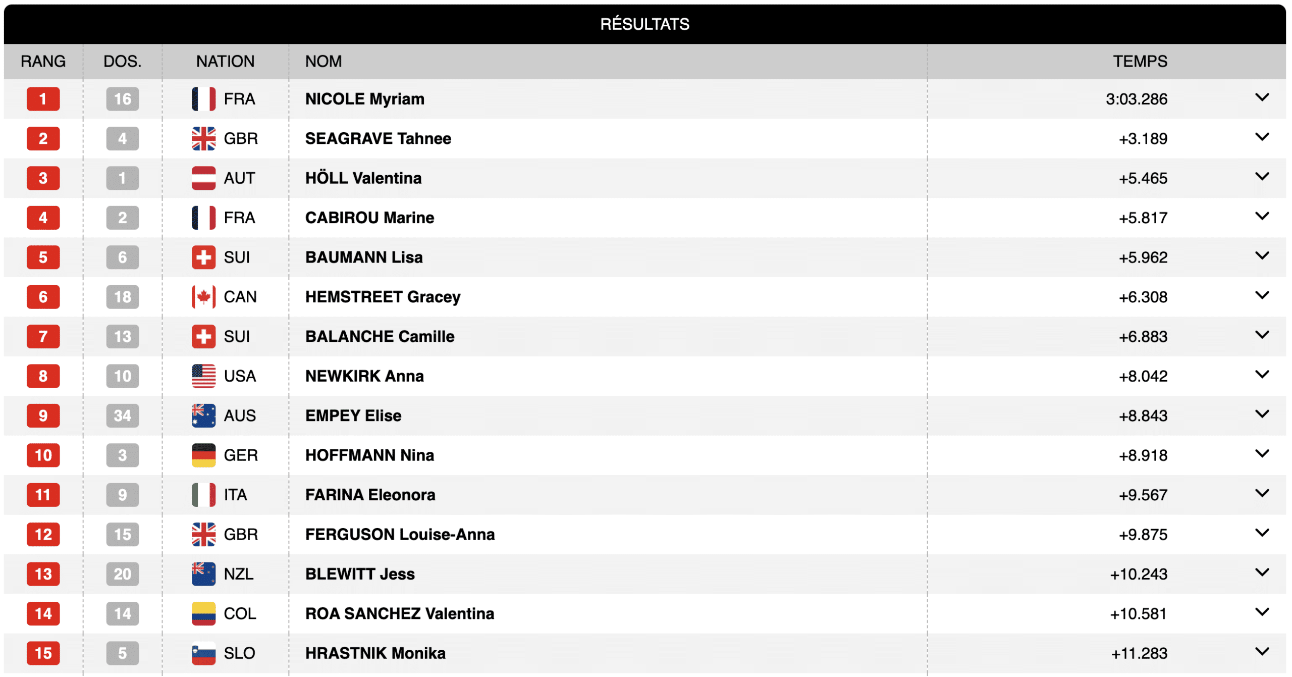 On notera aussi la 7e place de Camille Balanche, la 10e de Nina Hoffmann ou encore la 16e de l’enduriste Harriet Harnden. Toute fraiche championne de France, Lisa Bouladou signe le 20e temps.