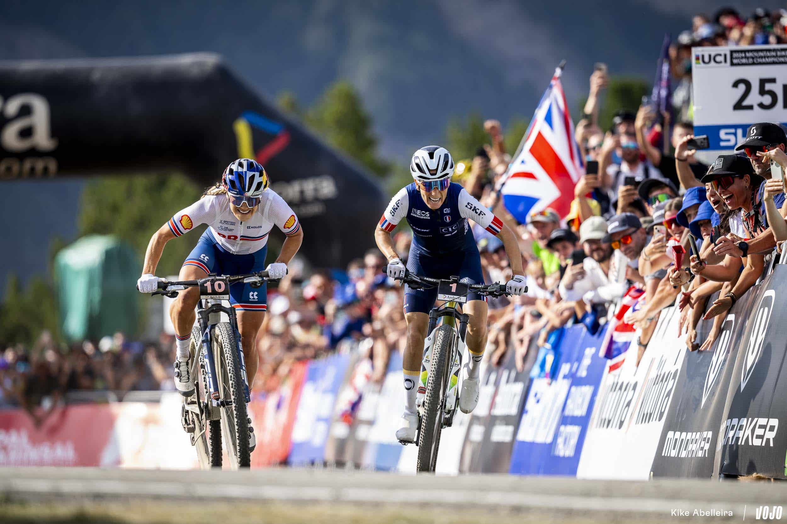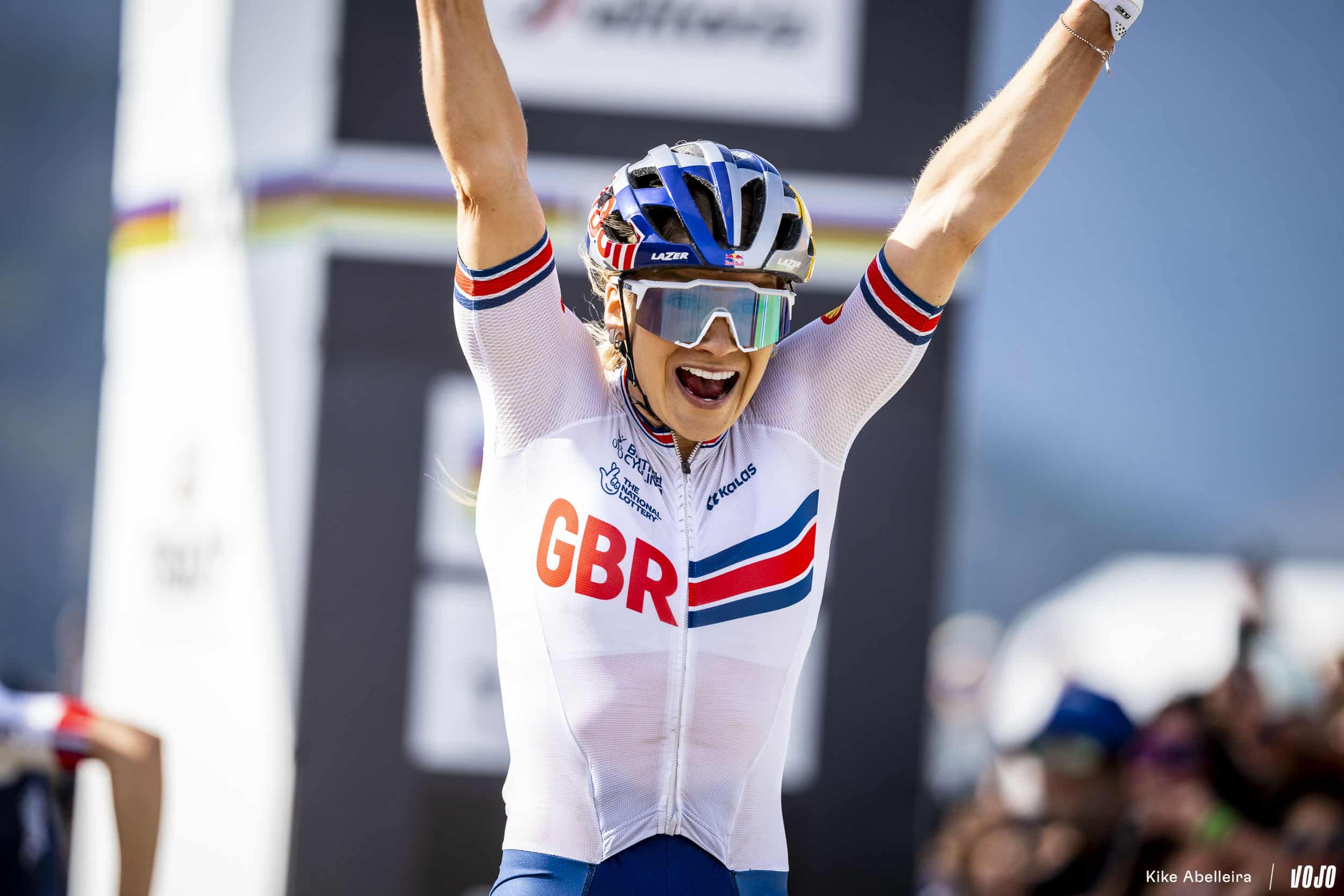 Evie Richards, championne du monde XCO en 2021 à Val Di Sole, ajoute un deuxième maillot arc-en-ciel à sa garde-robe, cette fois en format Short Track. Et avec la manière en plus, puisqu’elle a battu la championne olympique et championne du monde XCC sortante, Pauline Ferrand-Prévot.