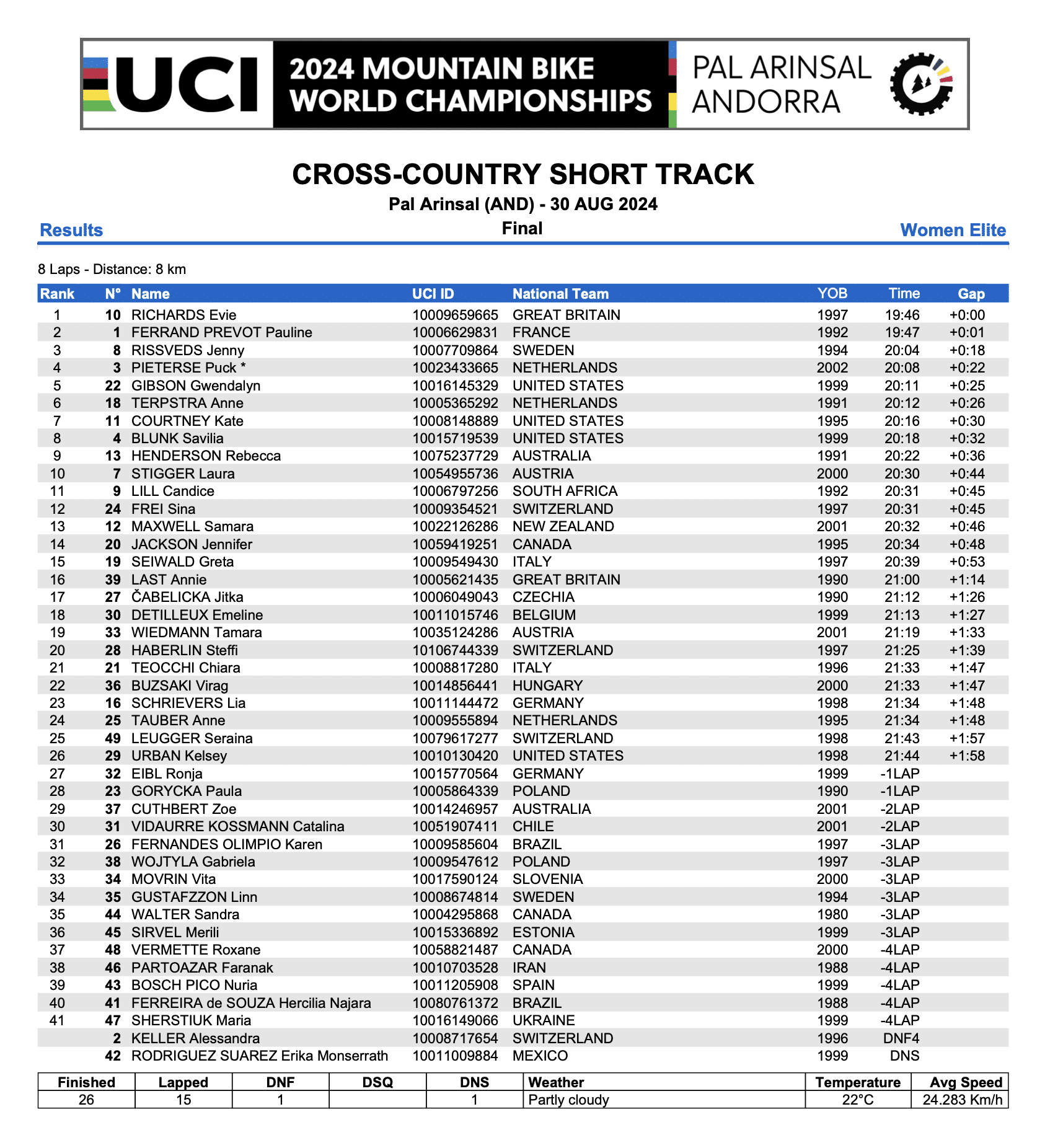 On l’a dit, Jenny Rissveds complète le podium, devant Puck Pieterse et l’Américaine Gwendalyn Gibson. Anne Terpstra, qui devrait mettre fin à sa carrière en fin de saison, est 6e devant Kate Courtney. Savilia Blunk, Rebecca Henderson et Laura Stigger complètent le top 10. Côté Belges, Emeline Detilleux est 18e. On notera l’abandon d’une des grandes favorites, Alessandra Keller, qui n’a jamais été dans le coup sur cette course alors qu’elle est leader de la coupe du monde XCC.
