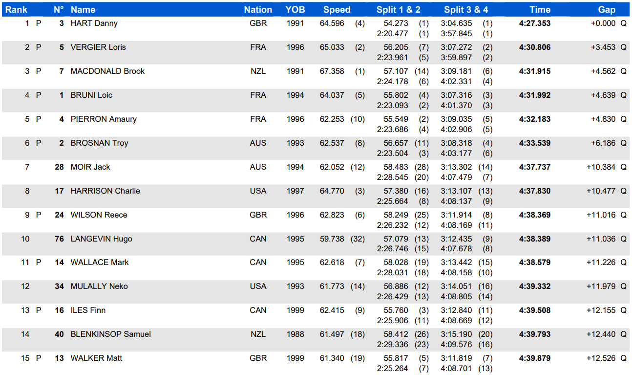 Ces qualifications n’en ont en réalité que le nom, ou presque : dans chaque catégorie, il y avait en effet moins de concurrents que de places en finale, à l’exception des hommes Elites où on retrouvait 81 partants pour… 80 pilotes qualifiés ! Mais l’exercice permet de se faire une première idée des forces en présence et offre aux pilotes la possibilité de faire un run complet en conditions de course avant les grandes finales de dimanche.