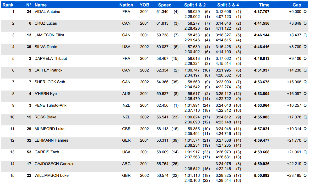 Chez les Juniors, Antoine Vidal se la joue façon Martin Maes en venant titiller les descendeurs sur leur terrain ! Le jeune enduriste français a en effet signé le meilleur chrono de cette manche en étant quasiment 4 secondes plus rapide que deux Canadiens, Lucas Cruz et Eliott Jamieson. Plus loin encore, on retrouve les hommes forts de la saison de coupe du monde que sont Thibaut Daprela, 5e à plus de 9 secondes, et le trio Seth Sherlock / Kye A’hern / Tuhoto-Ariki Pene, respectivement 7e, 8e et 9e à 16 secondes de Vidal…