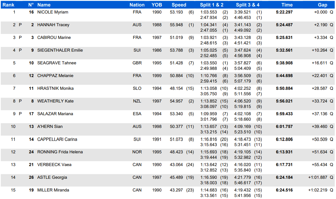 Pour un retour, c’est un sacré retour ! Alors que Myriam Nicole n’a pas disputé une seule manche de coupe du monde cette année pour cause de blessure, la voilà qui signe le meilleur temps de ces qualifications ! La Française relègue Tracey Hannah à 2.190s et Marine Cabirou – qui sort de deux victoires en coupe du monde coup sur coup – à 3.334s. Sur une piste si longue, ce n’est finalement pas grand chose et la finale s’annonce disputée dimanche… Derrière le top 3, les écarts sont par contre plus importants : Emilie Siegenthaler prend une prometteuse 4e place mais est à plus de 10 secondes alors que Tahnée Seagrave, elle aussi de retour de blessure, est 5e à 16 secondes et demie de Nicole. On notera aussi la belle 6e position de Mélanie Chappaz, c’est par contre plus décevant pour Veronika Widmann, 18e, et Camille Balanche, 19e.