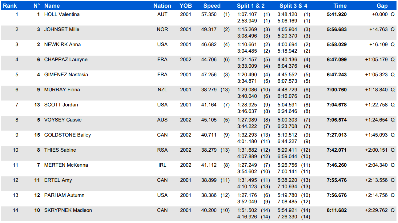 Du côté des Dames Juniors enfin, c’est nettement moins surprenant puisqu’on retrouve le trio de tête habituel, dans l’ordre habituel : Vali Höll en tête, devant Mille Johnset (+14.763s) et Anna Newkirk (+16.109s).