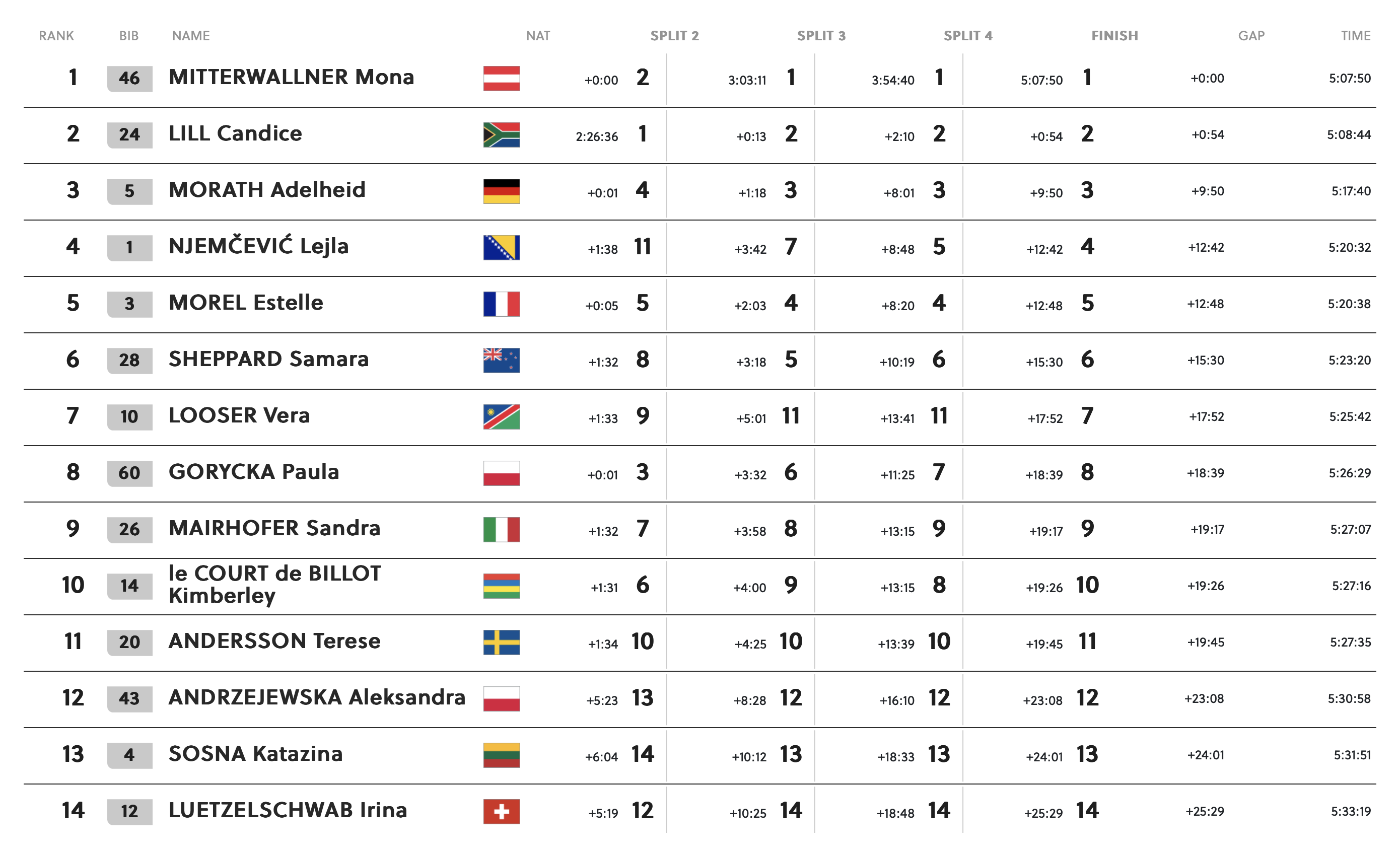 En tête durant une bonne moitié de la course, la Sud-Africaine Candice Lill a dû se résigner à laisser partir l’Autrichienne seule en tête dans les derniers kilomètres et termine sur la 2e marche du podium. Un podium complété par Adelheid Morath, qui à l’arrivée accusait un retard de plus de 8 minutes sur la gagnante du jour.