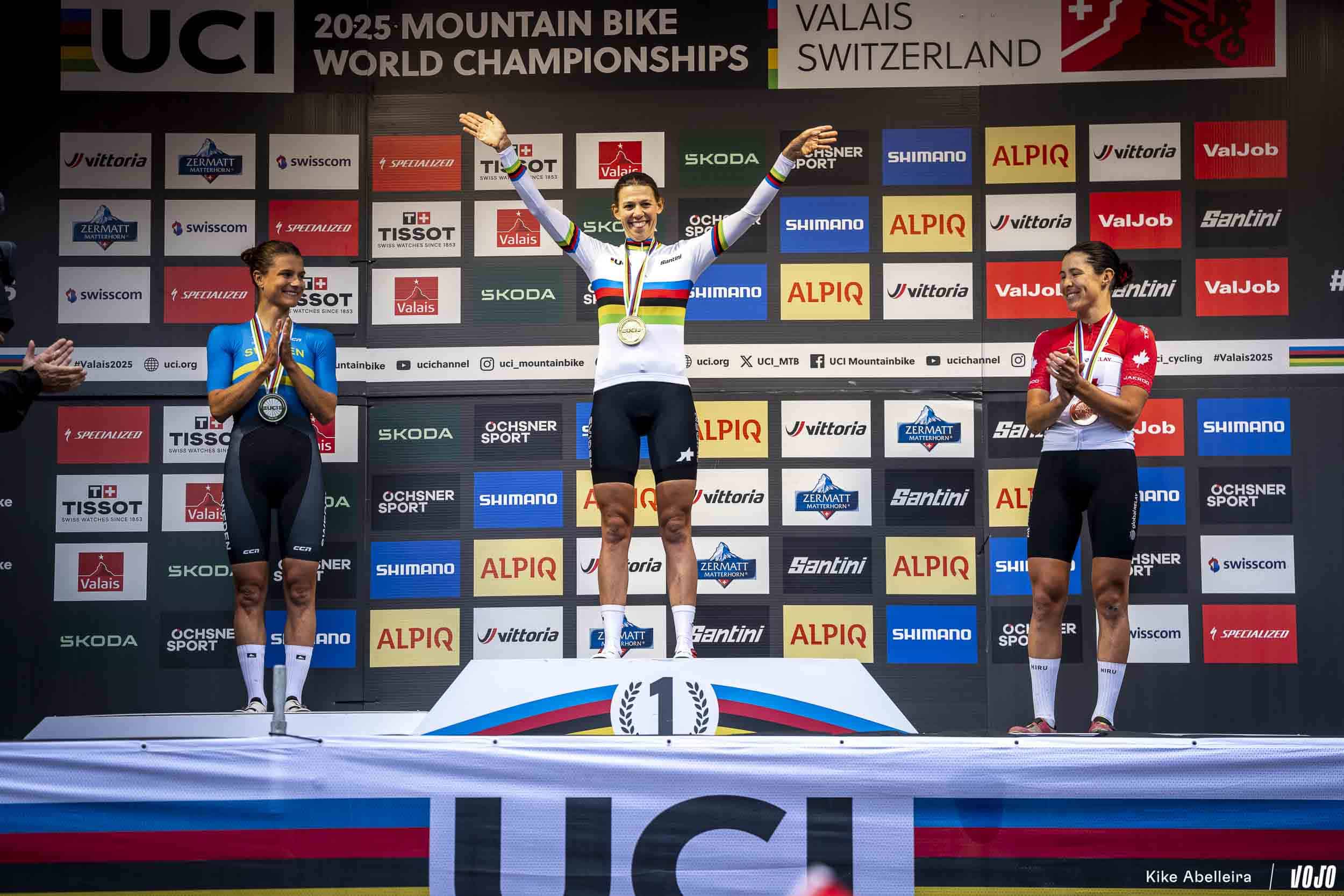 « Championne du monde à domicile, c’est fou. La dernière fois, c’était à Lenzerheide en 2018 chez les Espoirs. C’était vraiment mon objectif cette saison. Je n’étais pas au courant que Evie Richards avait crevé, je voulais juste rouler le plus vite possible pour moi. Je savais que Jenny Rissveds était en forme, on l’a vu la semaine dernière aux Gets. J’étais forte en montée aujourd’hui, l’objectif c’était de ne pas regarder derrière, et de tout donner ! », confie la Suissesse à son arrivée.
