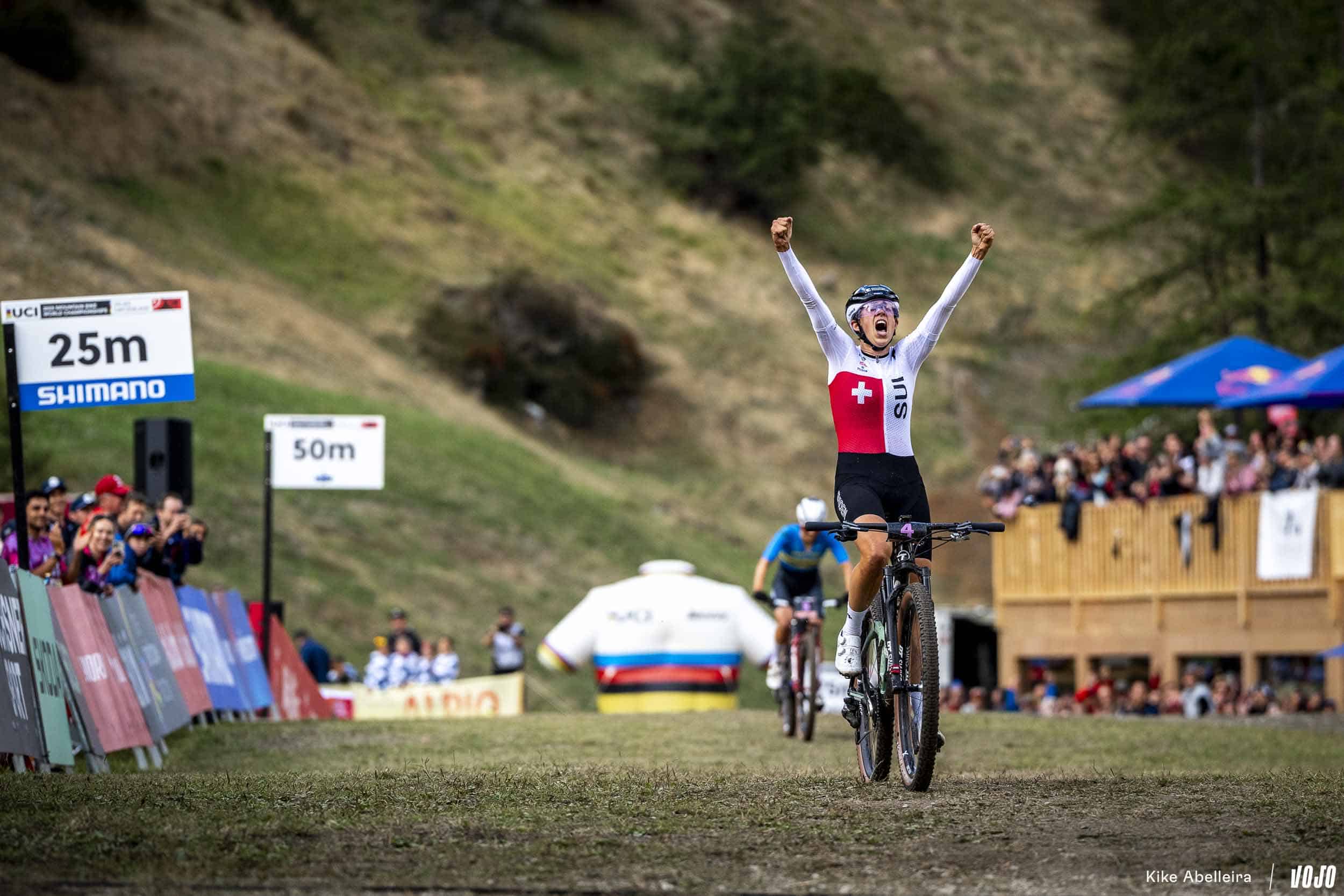 Et ça va payer ! La Suissesse est championne du monde XCC pour la première fois de sa carrière Élite (elle avait été couronnée en Espoirs et en Juniors en XCO). Elle s’alignera sur la prochaine manche de coupe du monde, à Lenzerheide en Suisse, avec le maillot arc-en-ciel !