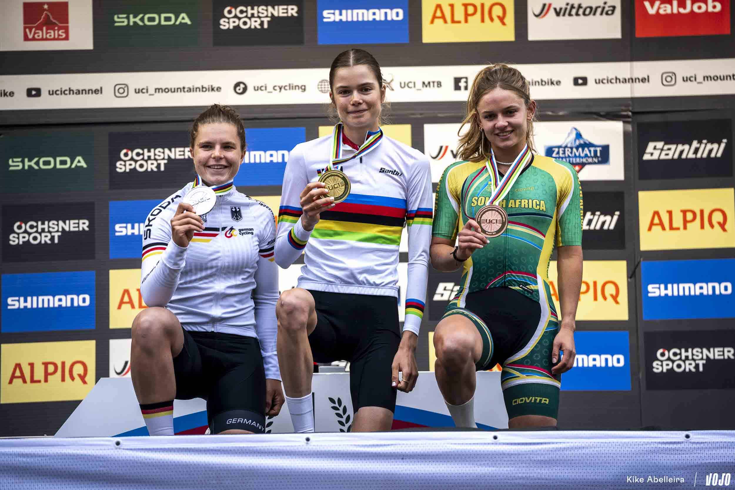 « Championne du monde à domicile, c’est fou. La dernière fois, c’était à Lenzerheide en 2018 chez les Espoirs. C’était vraiment mon objectif cette saison. Je n’étais pas au courant que Evie Richards avait crevé, je voulais juste rouler le plus vite possible pour moi. Je savais que Jenny Rissveds était en forme, on l’a vu la semaine dernière aux Gets. J’étais forte en montée aujourd’hui, l’objectif c’était de ne pas regarder derrière, et de tout donner ! », confie la Suissesse à son arrivée.