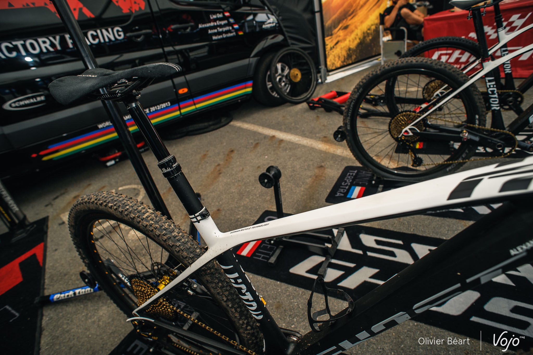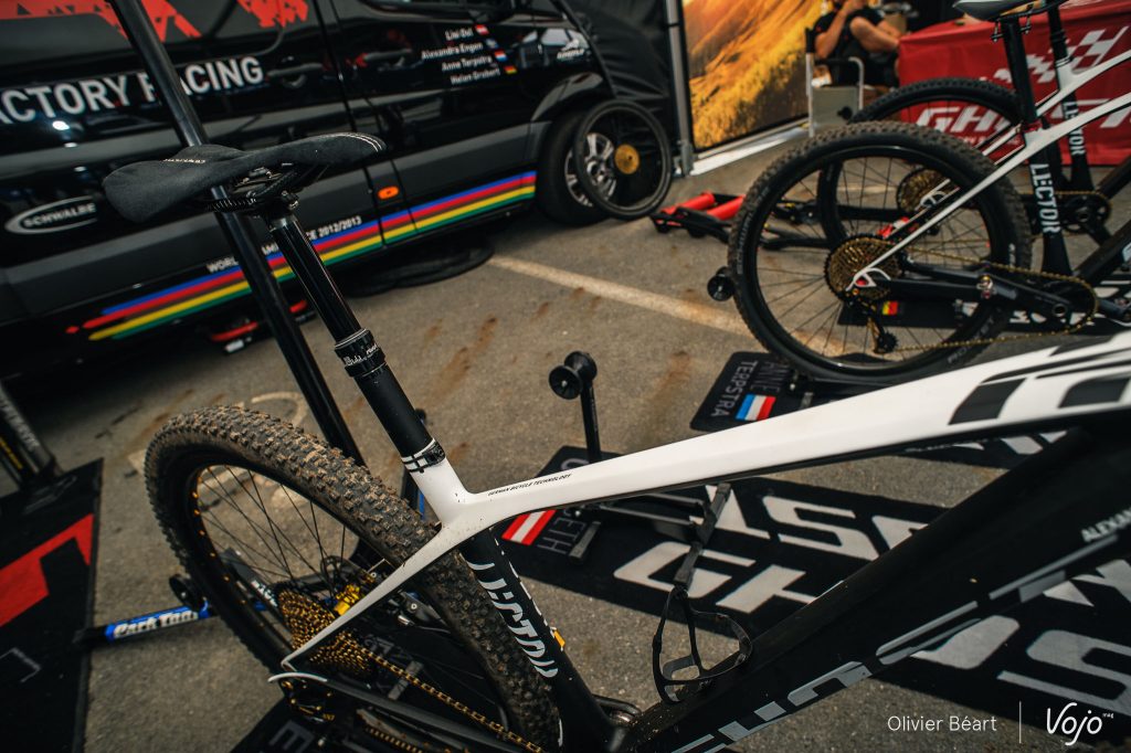 Plus que jamais, nous avons vu un très grand nombre de tiges de selle télescopiques, qui commencent à faire fureur chez les pros. Il faut dire que le parcours de Nove Mesto, très technique et raide pas endroits (comme le tracé des Jeux Olympiques), s’y prête particulièrement bien. Ici, les vélos de Raphaël Gay et du team Ghost… pourtant un de ceux où on chasse le plus le moindre gramme superflu.