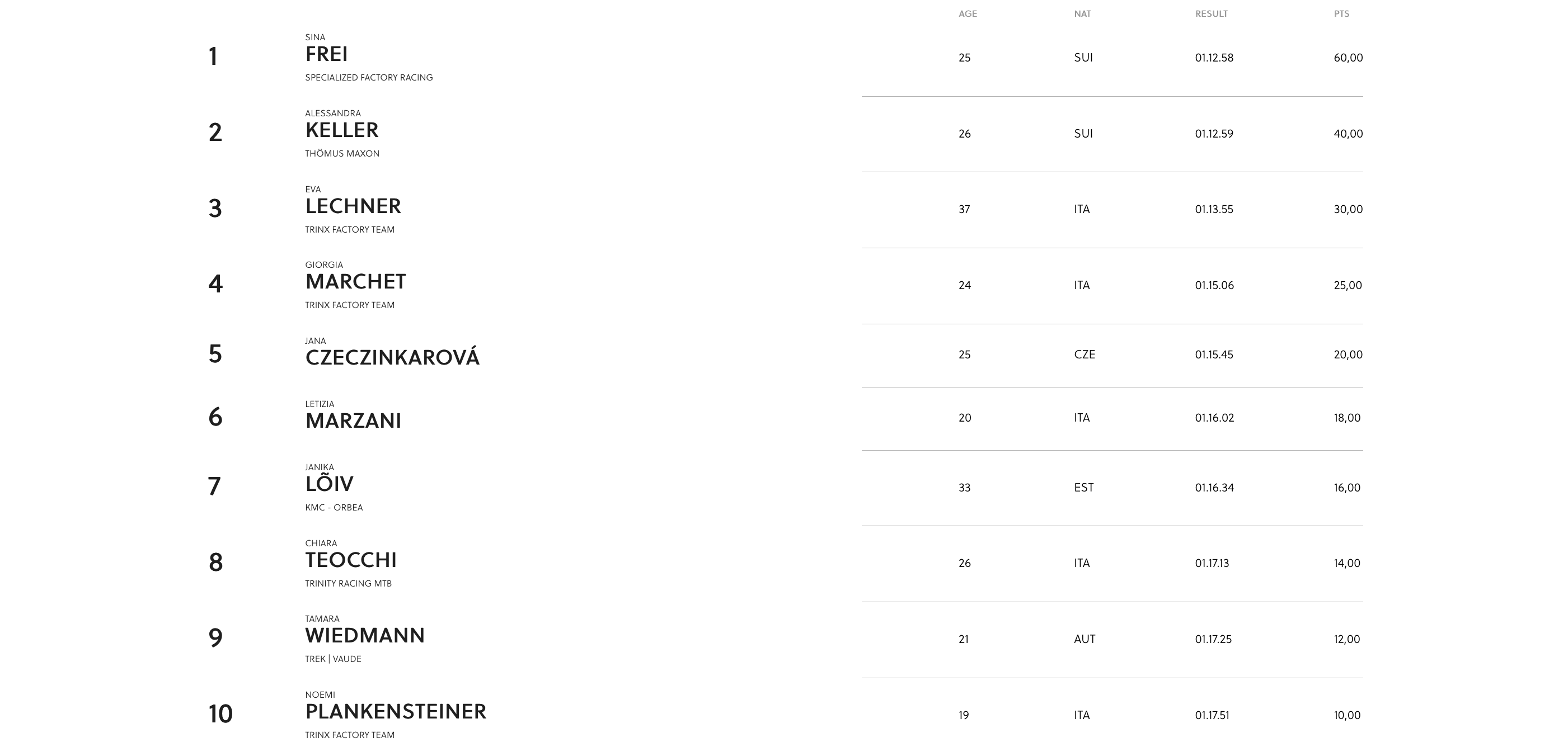 Le triomphe du Specialized Factory Racing sur l’épreuve est complet puisque Sina Frei l’avait emporté un peu plus tôt sur la course femmes au terme d’un beau duel avec Alessandra Keller (Thömus Maxon). Suivent l’inoxydable Eva Lechner à la 3e place, sa jeune coéquipière du Trinx Factory Team Giorgia Marchet à la 4e et Jana Czeczinkarovà (Liv Mistral Cycling) à la 5e.