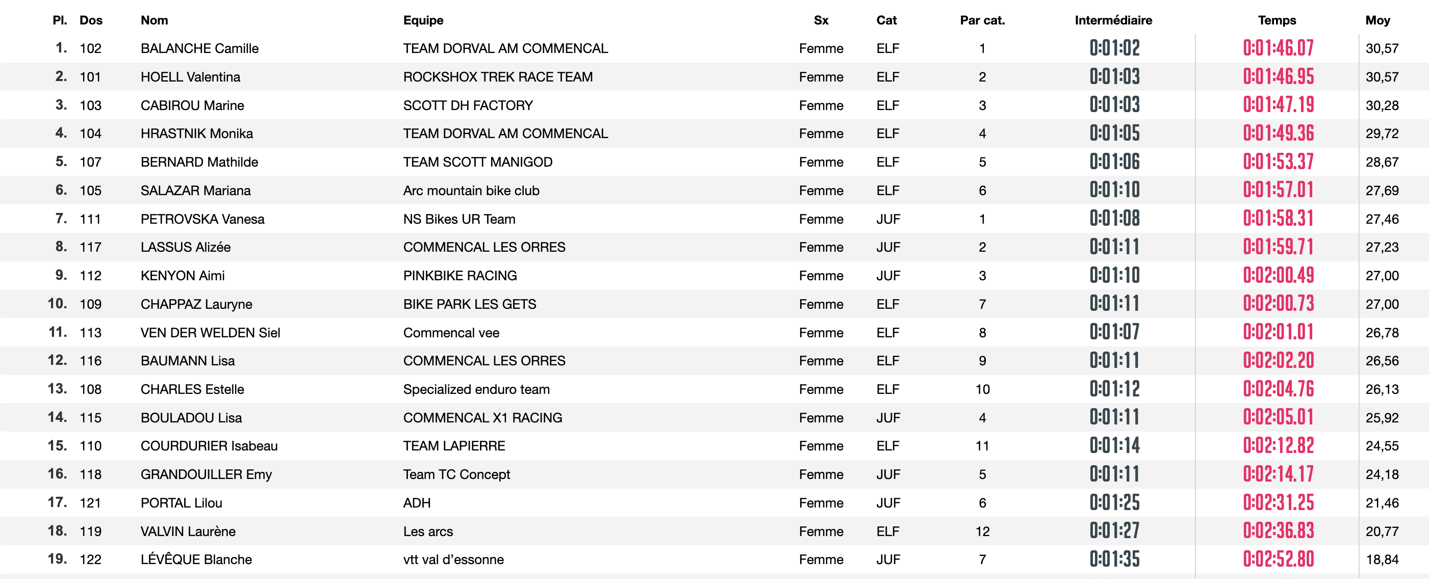 Chez les femmes, c’est Camille Balanche qui remporte l’épreuve pour moins d’une seconde devant Vali Höll, victime selon ses mots « d’un petit incident mécanique » en finale. Marine Cabirou suit à la 3e place (+1″12) puis viennent Monika Hrastnik et Mathilde Bernard.