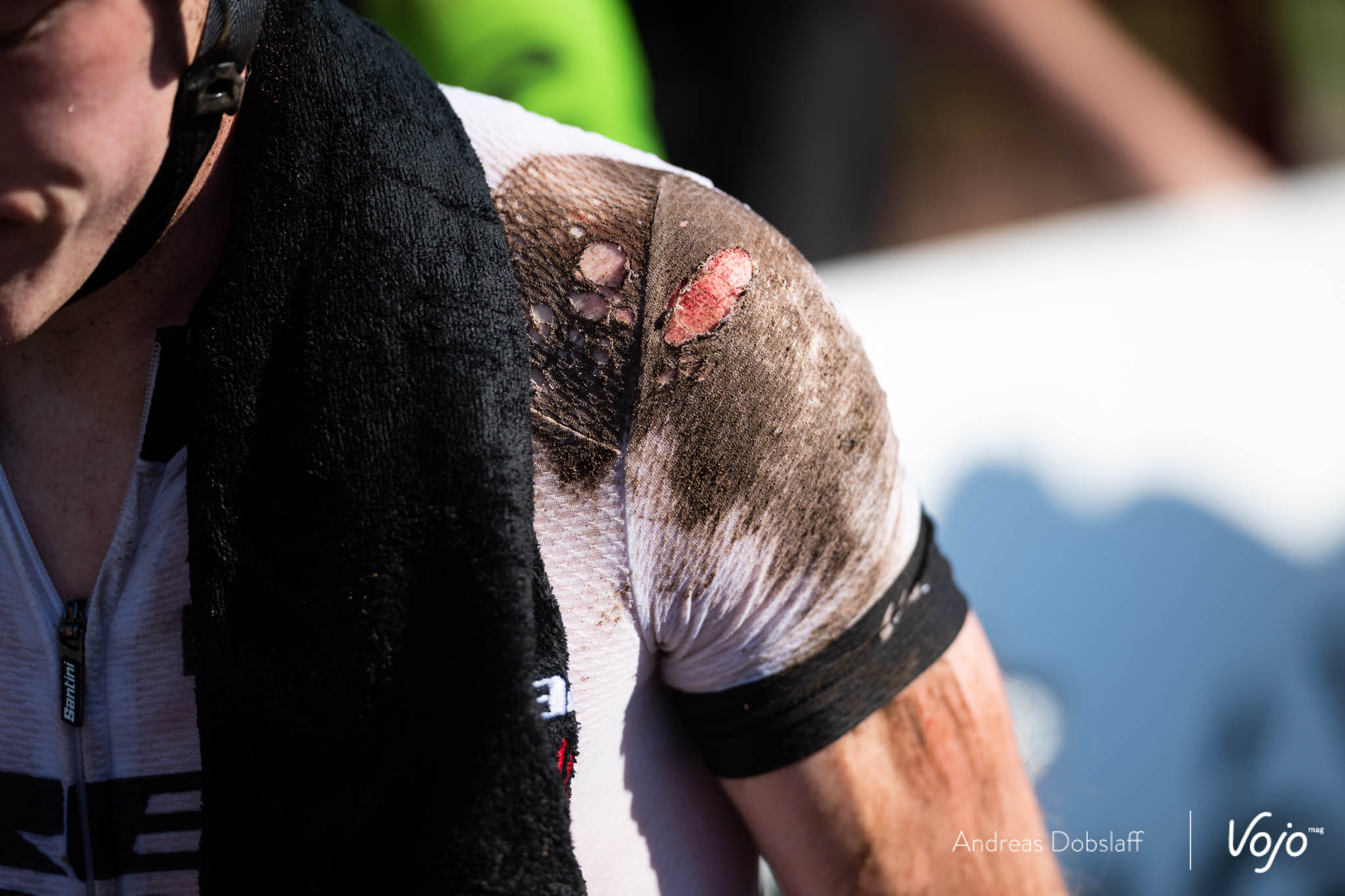 Second et valeureux guerrier, Gerhard Kerschbaumer décroche la médaille l’argent à l’issue d’une puissante remontée. L’Italien plante sa roue avant entre deux rochers, passe par l’avant de son vélo et est visiblement sonné après avoir touché le visage au sol. Il entame ensuite une énorme remontée, passe devant Titouan Carrod pour terminer à quelques secondes de la victoire.