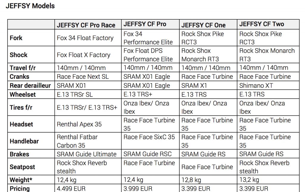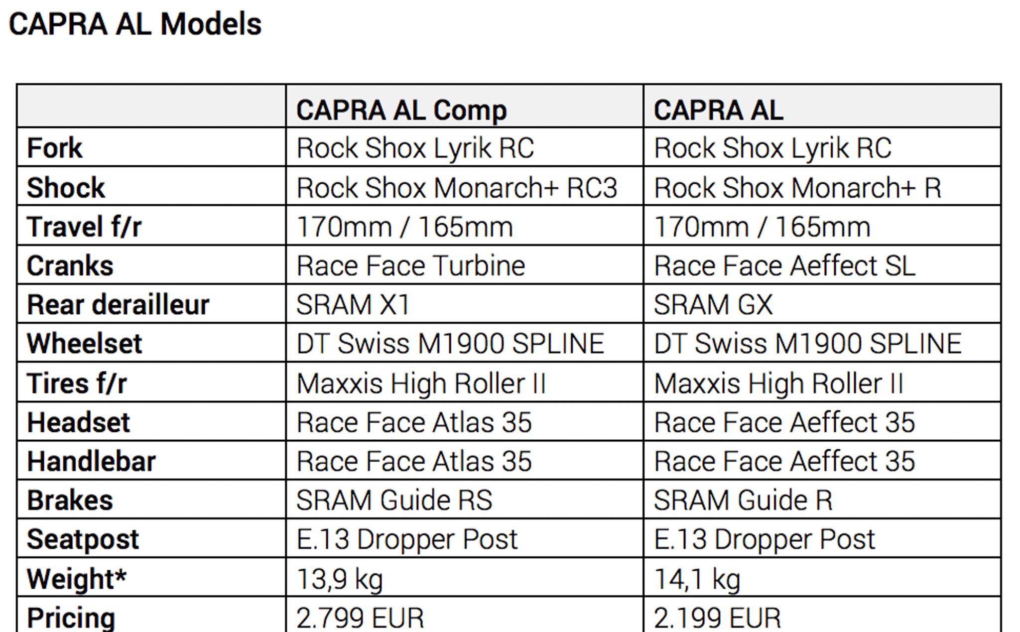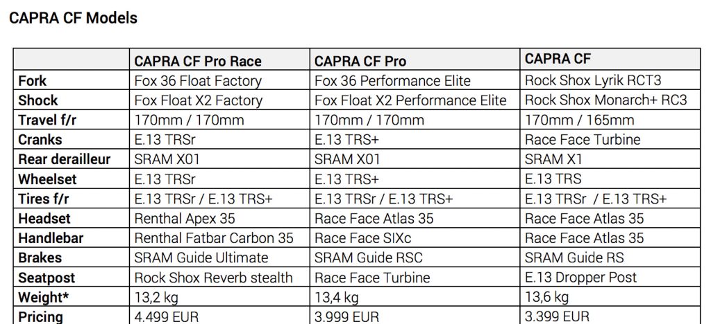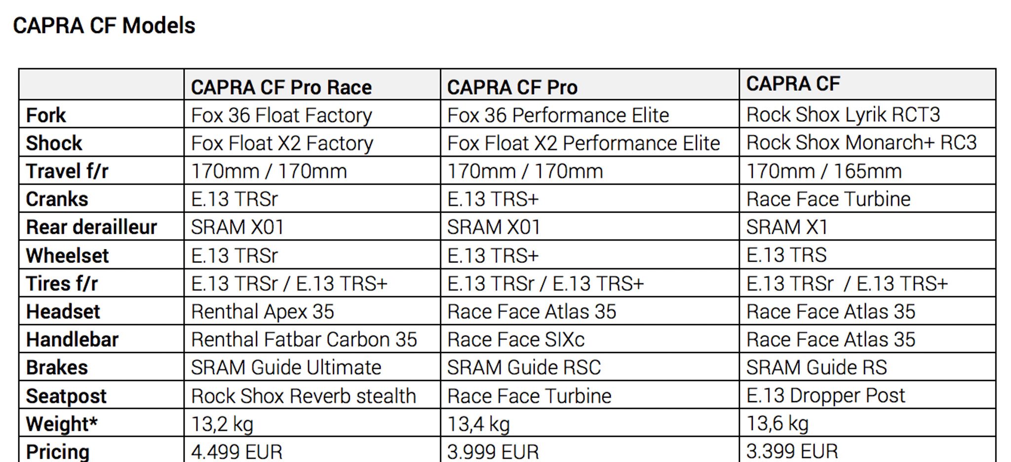 La gamme des Capra en carbone comptera trois montages avec l’arrivée du nouveau CF Pro Race. On notera l’apparition des roues en carbone E-Thirteen sur le modèle haut de gamme ainsi que de la tige de selle télescopique, des pneus et de la cassette de la marque. On retrouve la tige de selle RaceFace sur le montage CF Pro, un choix décevant compte tenu du résultat de notre test : dev.vojomag.com/test-tige-de-selle-telescopique-race-face-turbine/