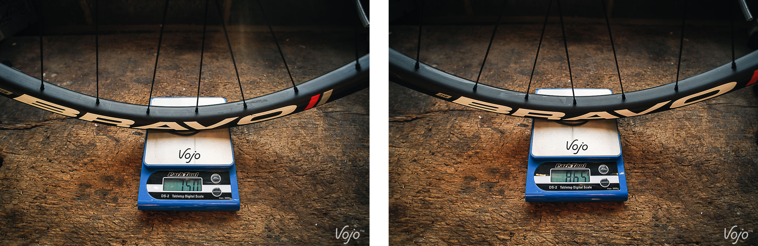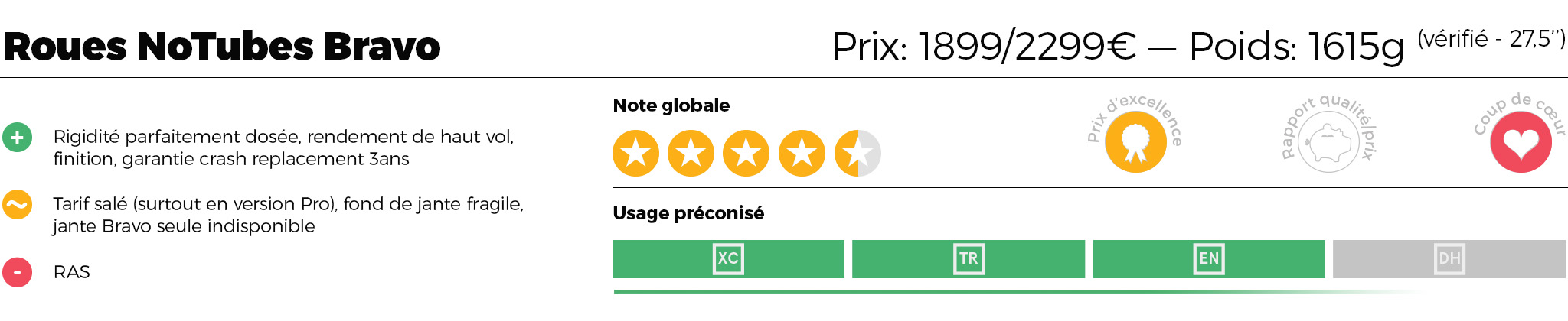 Avant de partir rouler, un petit passage sur la balance nous montre que les poids annoncés sont parfaitement respectés (on est même un peu en-dessous), avec 1615g la paire en version Pro 27,5″ (15×100 et 142×12, body Sram XD) avec le fameux fond de jante Yellowtape installé, ainsi que les jolies valves aluminium anodisées rouge livrées de série. Un dernier mot pour signaler que les Bravo sont disponibles en diamètre 27,5 », mais aussi 29 » et, fait plus rare, en 26 » ! Les amateurs de cet « ancien » format de roues apprécieront et on salue la volonté de NoTubes de ne pas les oublier. Reste la question du tarif, qui est plutôt salé : 1899€ en version Team et 2299€ en version Pro. On est dans des tarifs inférieurs à ceux des roues Sram Roam 60 (2500€) ou des Enve M70, mais même la version d’accès est au-dessus des roues carbone enduro les plus accessibles comme les Roval Traverse (1599€) ou encore les Duke (entre 1500 et 1800€ selon le moyeu) et autre Asterion (entre 1100 et 1600€ selon la jante carbone et les moyeux choisis). Mais voyons ce que cela raconte sur les sentiers.