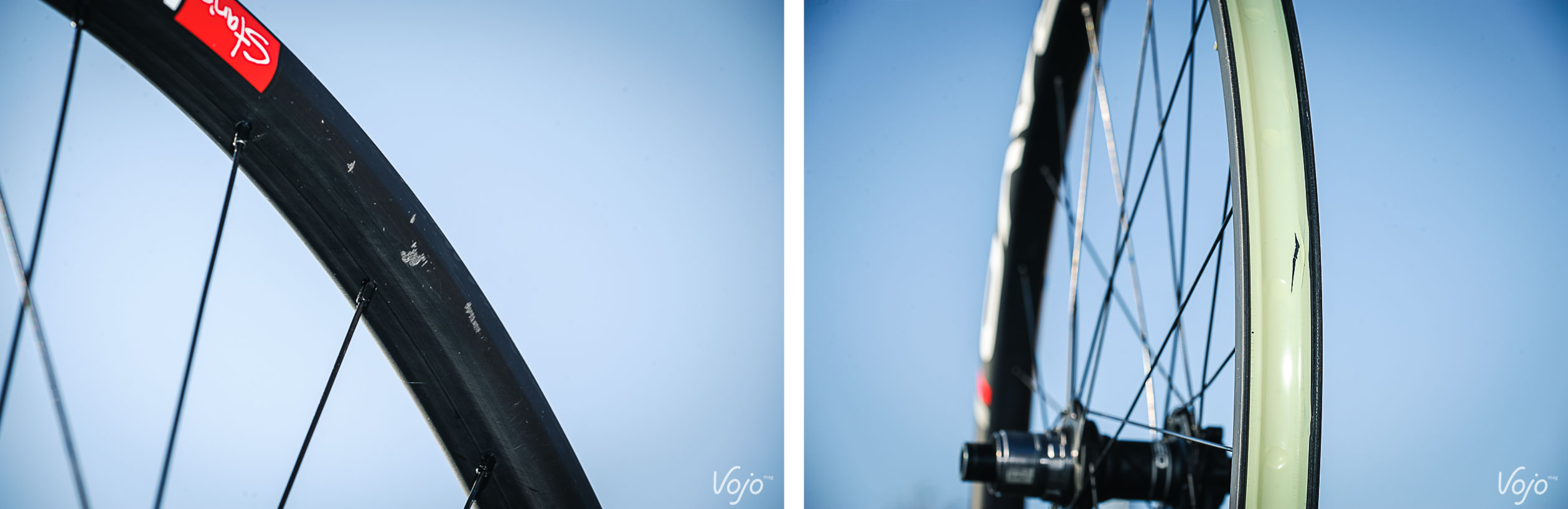 Signalons aussi qu’en près de 3 mois de test intensif, nous n’avons pas eu une seule crevaison à déplorer malgré des sorties à très basses pressions et des contacts assez nombreux avec la jante. Le profil des NoTubes Bravo, ainsi que la souplesse de la jante sont sans aucun doute, dans une certaine mesure, à saluer. Côté fiabilité, notre paire de roues « définitive » s’est montrée d’une solidité sans faille et, mis à part quelques griffes très localisées (photo), les jantes sont encore comme neuves. Les marquages peints sont aussi très solides. Nous avons par contre remarqué que le fond de jante Yellowtape était légèrement abîmé. Même s’il est léger et facile à mettre en place, ce n’est pas la première fois que cela nous arrive et nous pensons que NoTubes devrait revoir son mythique fond de jante pour le remettre au niveau de la concurrence. Même si, soyons honnêtes, la petite déchirure que vous voyez à l’image n’a pas entraîné la moindre perte d’air.