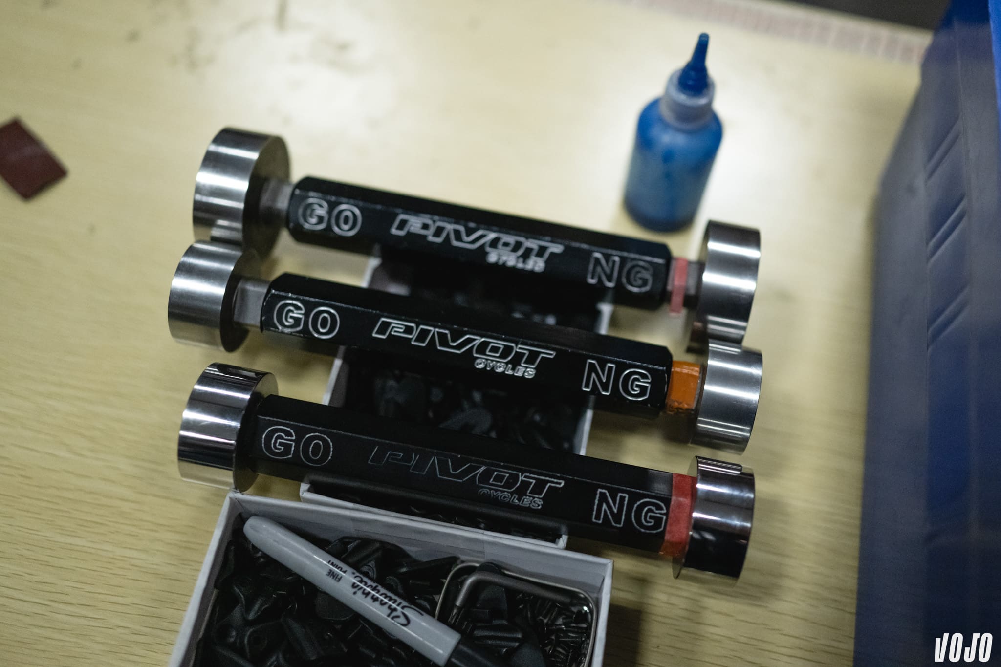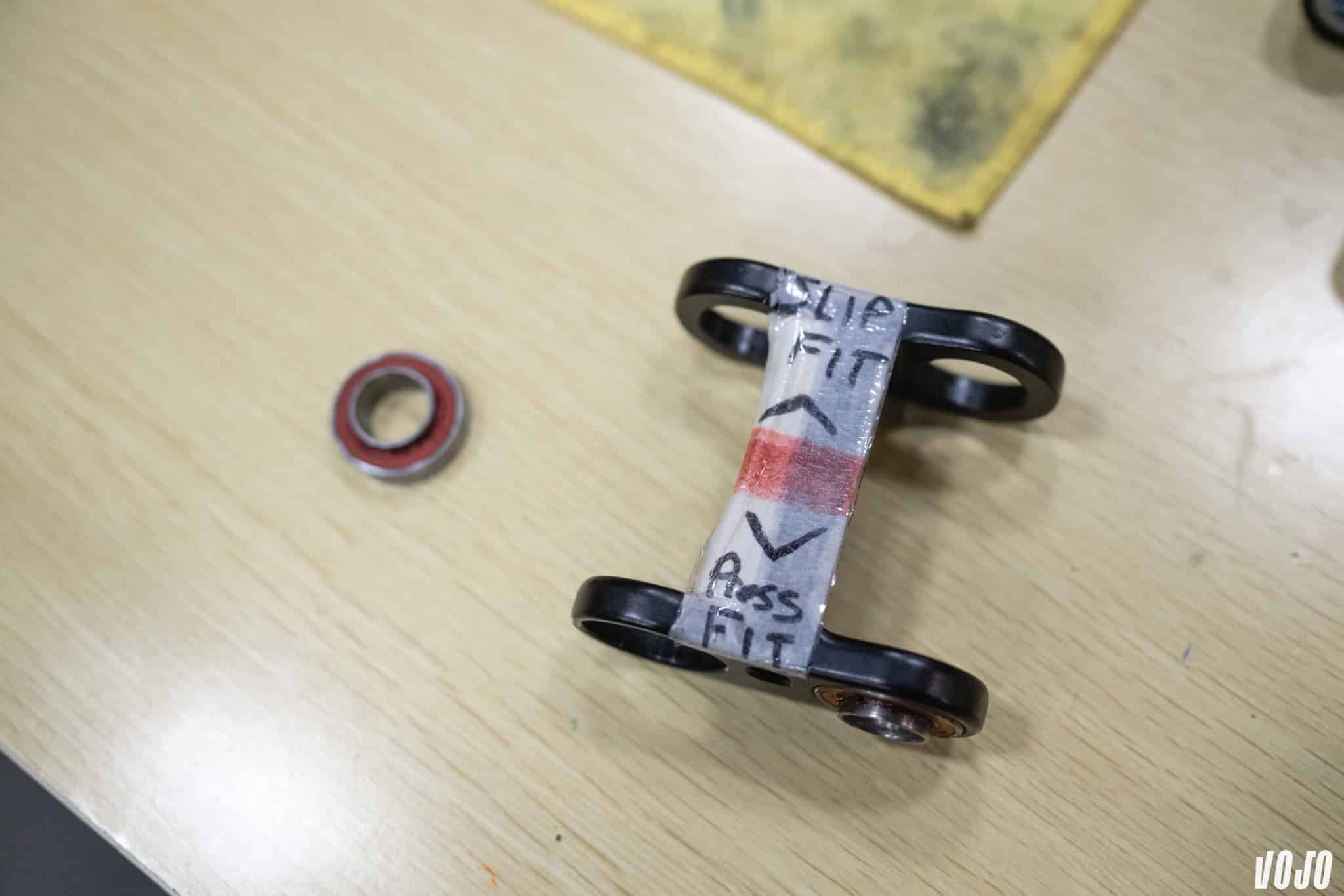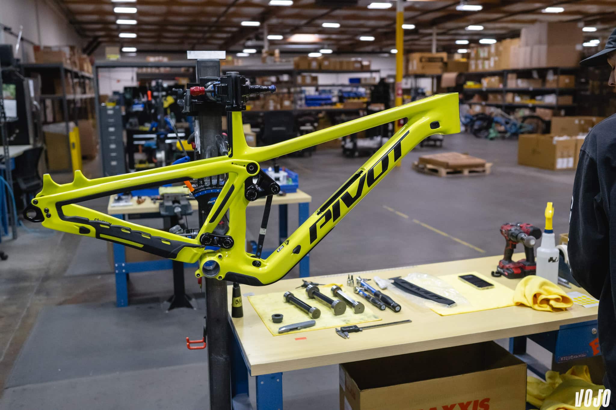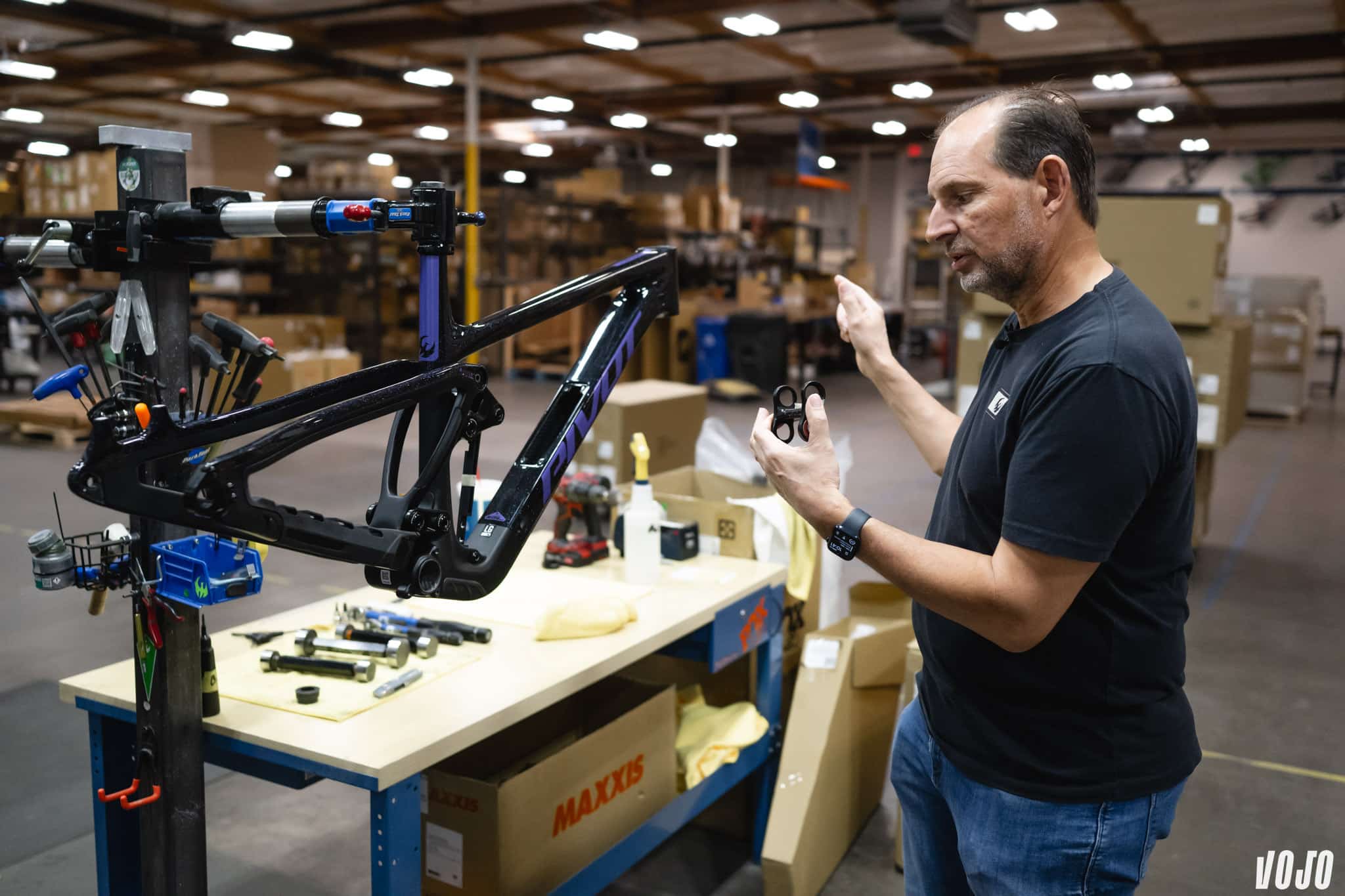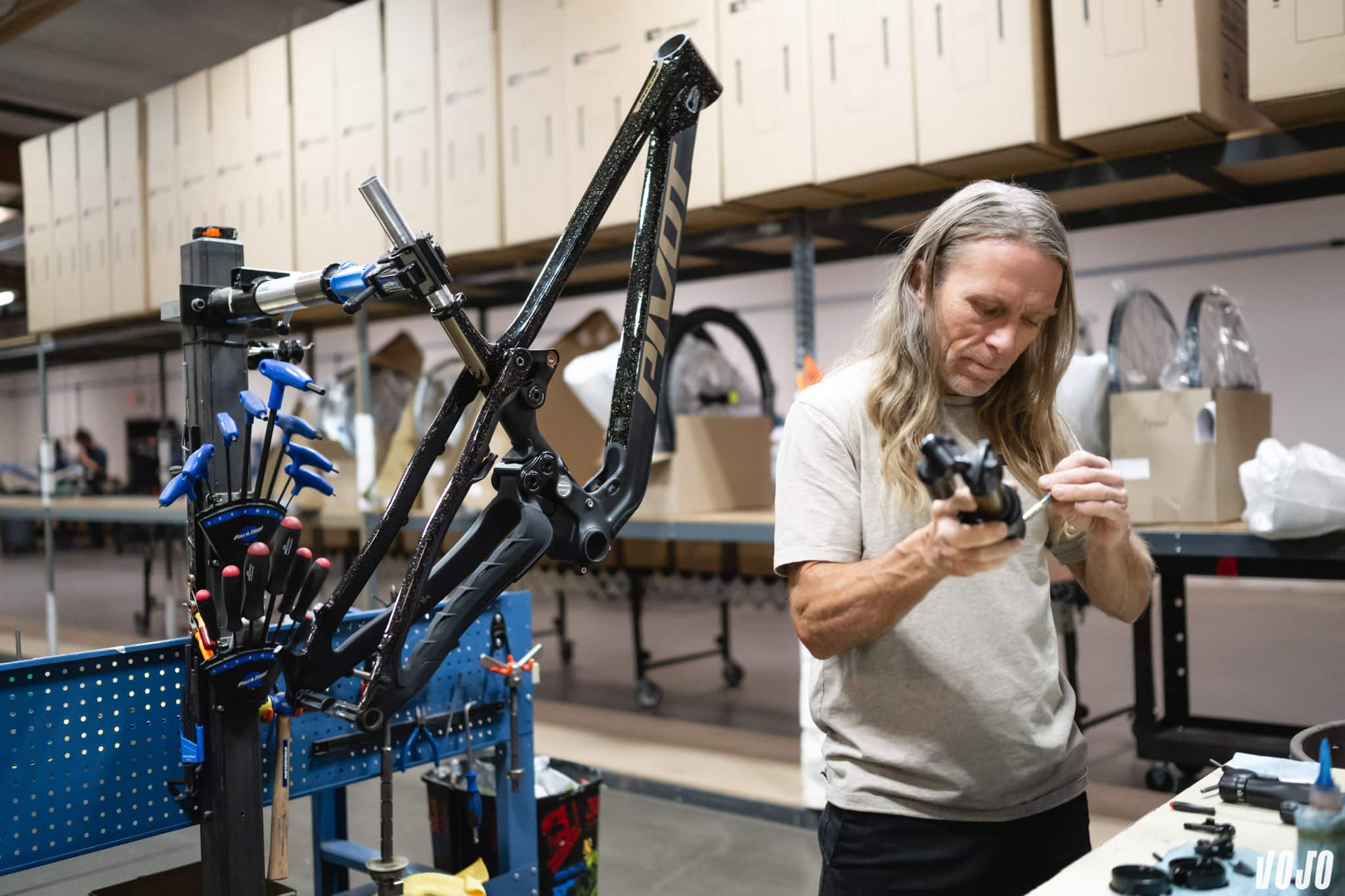C’est le seul point que nous n’avons pas pu filmer/photographier : Pivot utilise un montage pour un contrôle au laser de l’alignement de ses pièces. Chris Cocalis l’explique. Il fait des choix qui peuvent exposer ses pièces à des contraintes : le montage des roulements, l’utilisation de boitiers pressfit, les amortisseurs en montage Trunnion. Seul le contrôle de l’alignement permet de garantir la durée de vie de ses produits, et c’est également ce qui explique, du moins en partie, le tarif haut de gamme des vélos Pivot.