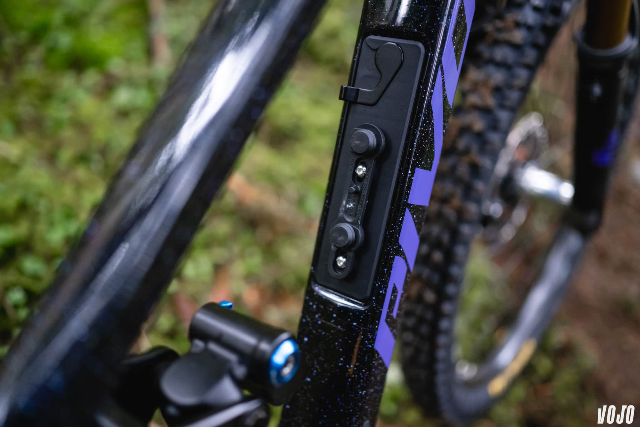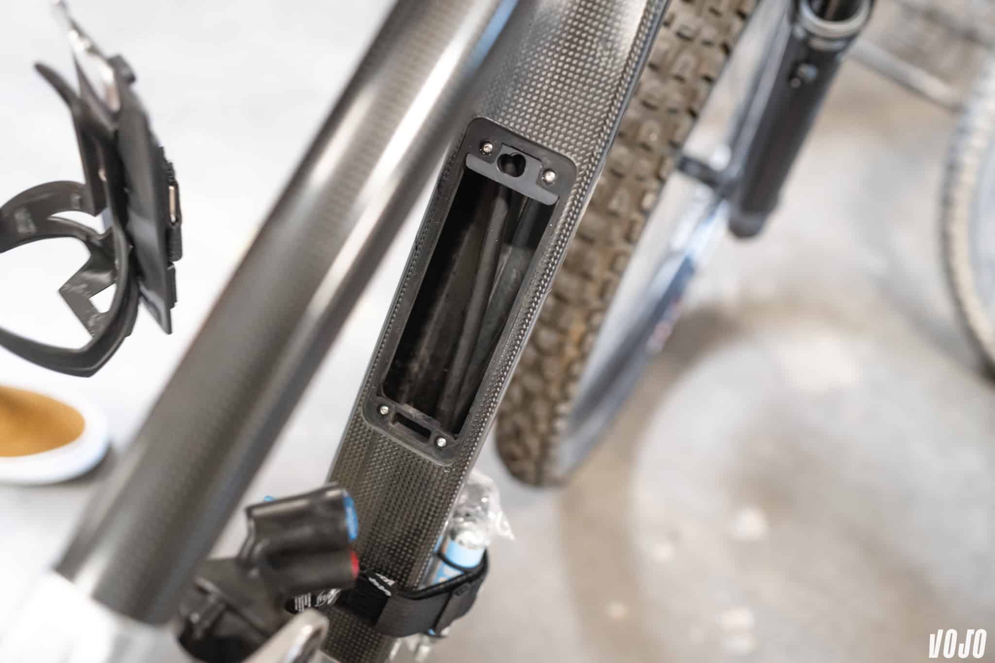 La contrainte est de taille pour les ingénieurs. Une ouverture dans un cadre, c’est de la rigidité en moins, compensée par plus de carbone, et donc plus de poids, ainsi qu’une nécessité de revoir ses passages en interne et de créer un système de porte qui fonctionne. Mais du côté du rider, c’est une addition très appréciée pour partir le dos et l’esprit légers. Deux petits sacs permettent de glisser son matériel de réparation (ou ce que vous voulez) dans le cadre.