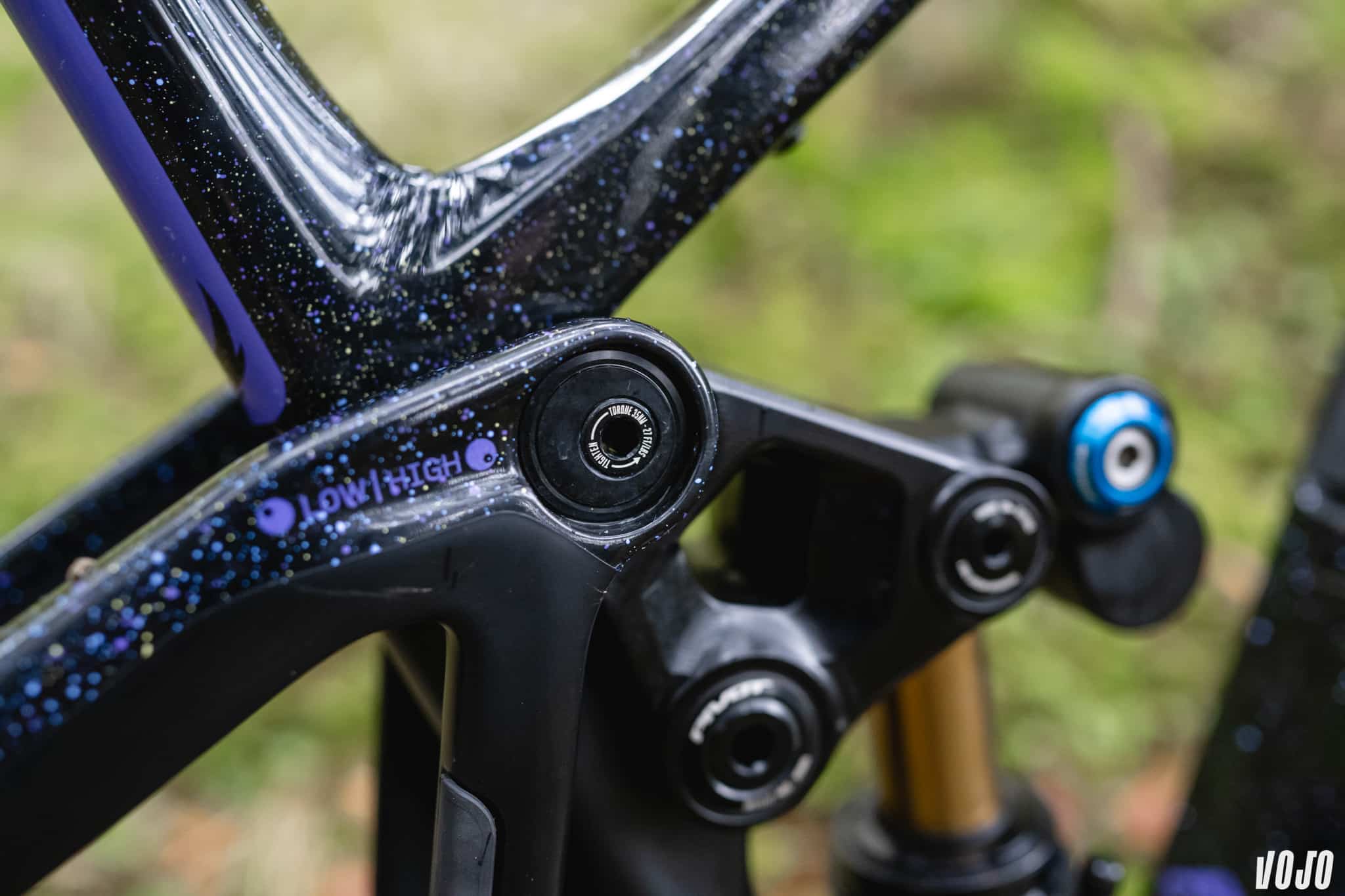 Au-dessus de l’amortisseur, on retrouve le flip-chip du précédent Firedbird, qui permet une évolution légère de la géométrie (plus droite et facile ou plus basse et posée). Cette pièce conserve la même utilité, et si avant un montage mulet (roue de 27,5 derrière, 29 devant) était possible, il est aujourd’hui commercialisé en se reposant sur cette pièce qui permet, en position haute, d’équilibrer la géométrie avec une petite roue arrière.