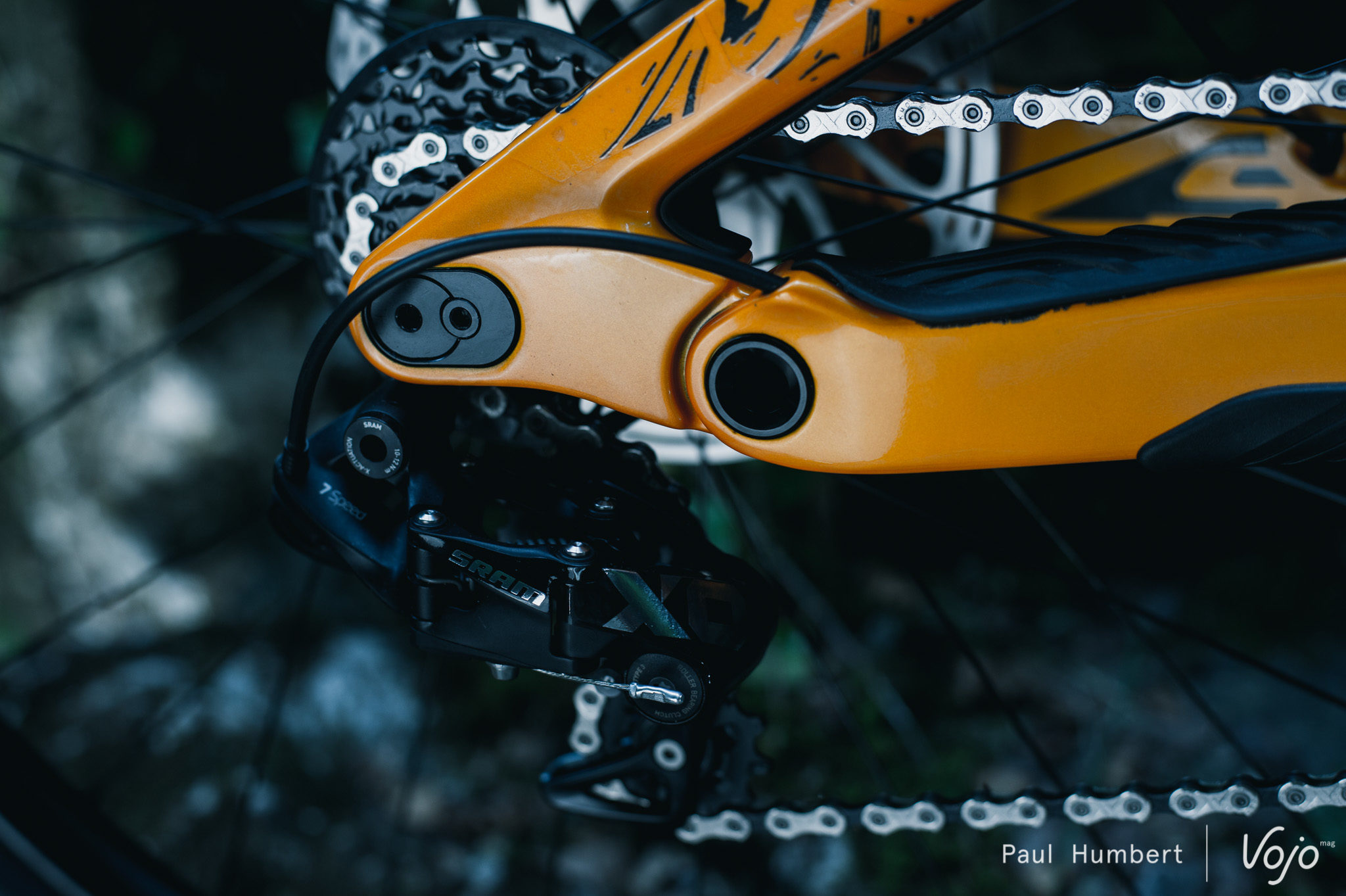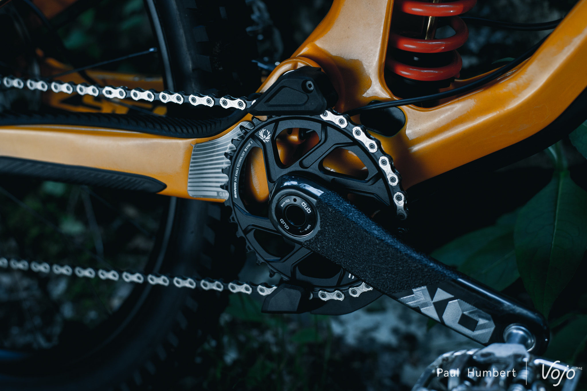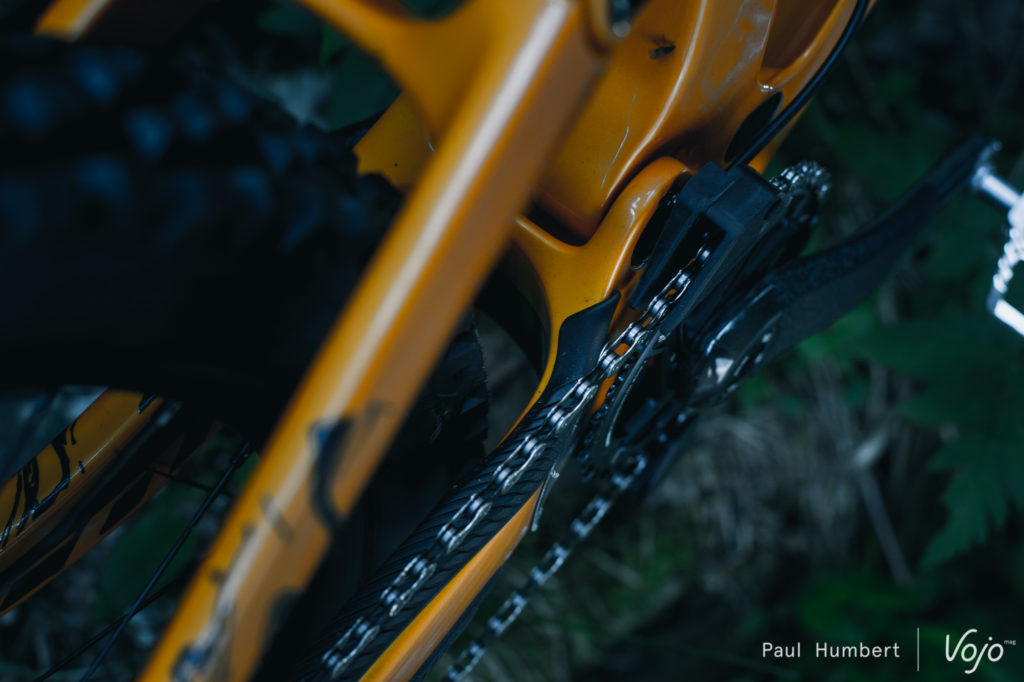 Dernière spécificité, le guide-chaîne utilise un standard propriétaire à la place des traditionnels plots ISCG05. D’après Scott, cela leur a permis de concevoir le cadre plus facilement (pas besoin d’inserts en aluminium dans le carbone, plus de liberté pour la conception des bases, du boîtier de pédalier et de la suspension), de gagner du poids et d’avoir un guide-chaîne plus efficace.