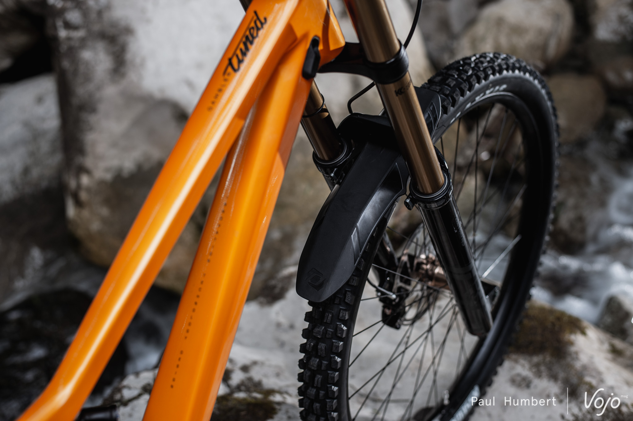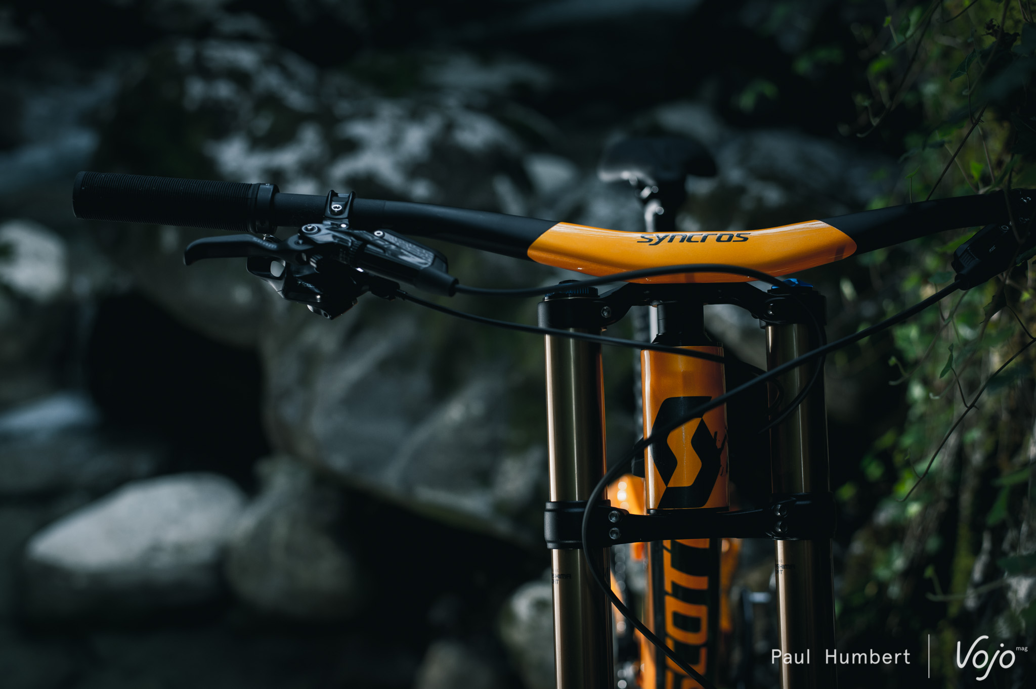 Enfin, Scott a aussi accordé une importance particulière à l’intégration et c’est surtout visible au travers des équipements du vélo. Cela peut être sur des petits détails, comme les butées de fourches intégrées aux entrées de câbles dans le cadre et le garde-boue Syncros intégré à la fourche, ou sur des points plus visibles comme le combo cintre-potence Syncros Hixon IC DH en une seule pièce.