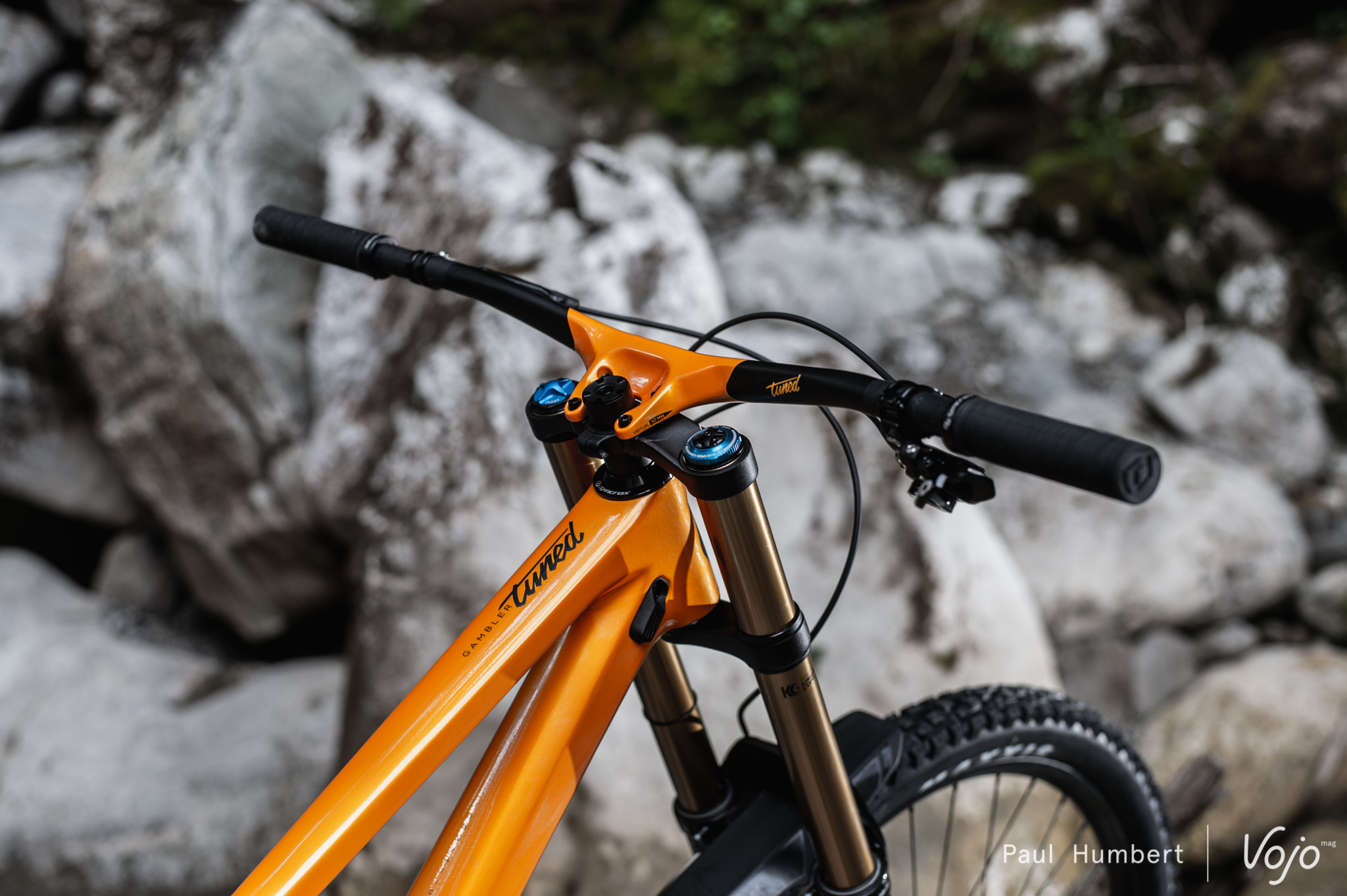 On retrouve ce combo cintre-potence sur tous les vélos haut de gamme de Scott, dans des versions adaptées à la discipline et on comprend donc la volonté de la marque d’en avoir également sur son vélo de DH, comme une signature. Cependant, cela vient un peu prendre le contre-pied de l’adaptabilité prônée par ailleurs pour ce nouveau Gambler, au niveau de la géométrie et de la suspension. Voici ce qu’en pense Clément Martin : « On a essayé de trouver une géométrie qui correspond au maximum à ce qu’on estime être le bon positionnement sur le vélo mais on conçoit que certains n’apprécient pas. »