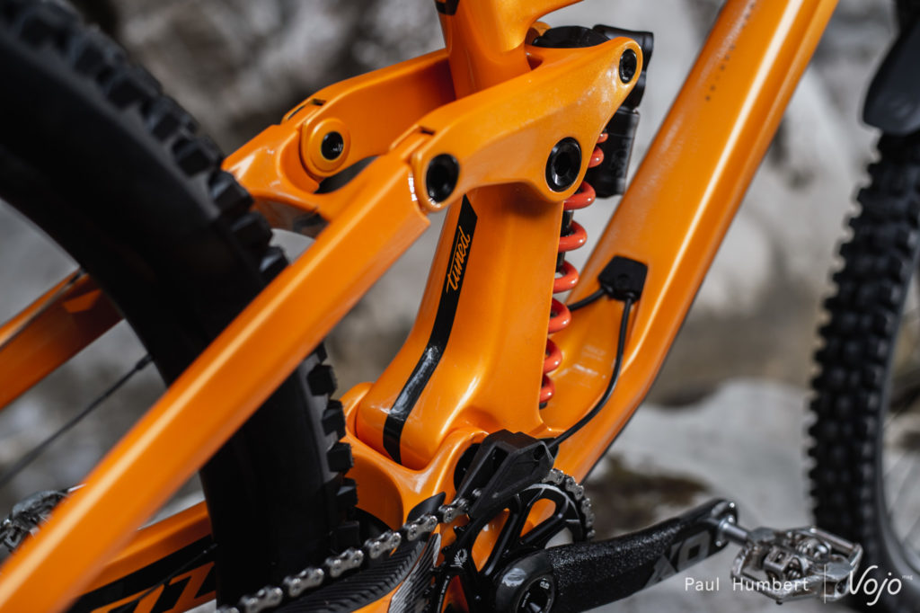 Sur ce tout nouveau Gambler, Scott a notamment mis l’accent sur l’adaptabilité et la personnalisation du vélo. La pièce d’ancrage inférieur de l’amortisseur peut ainsi être placée dans 4 positions différentes tandis que l’axe arrière est ajustable sur 2 positions.