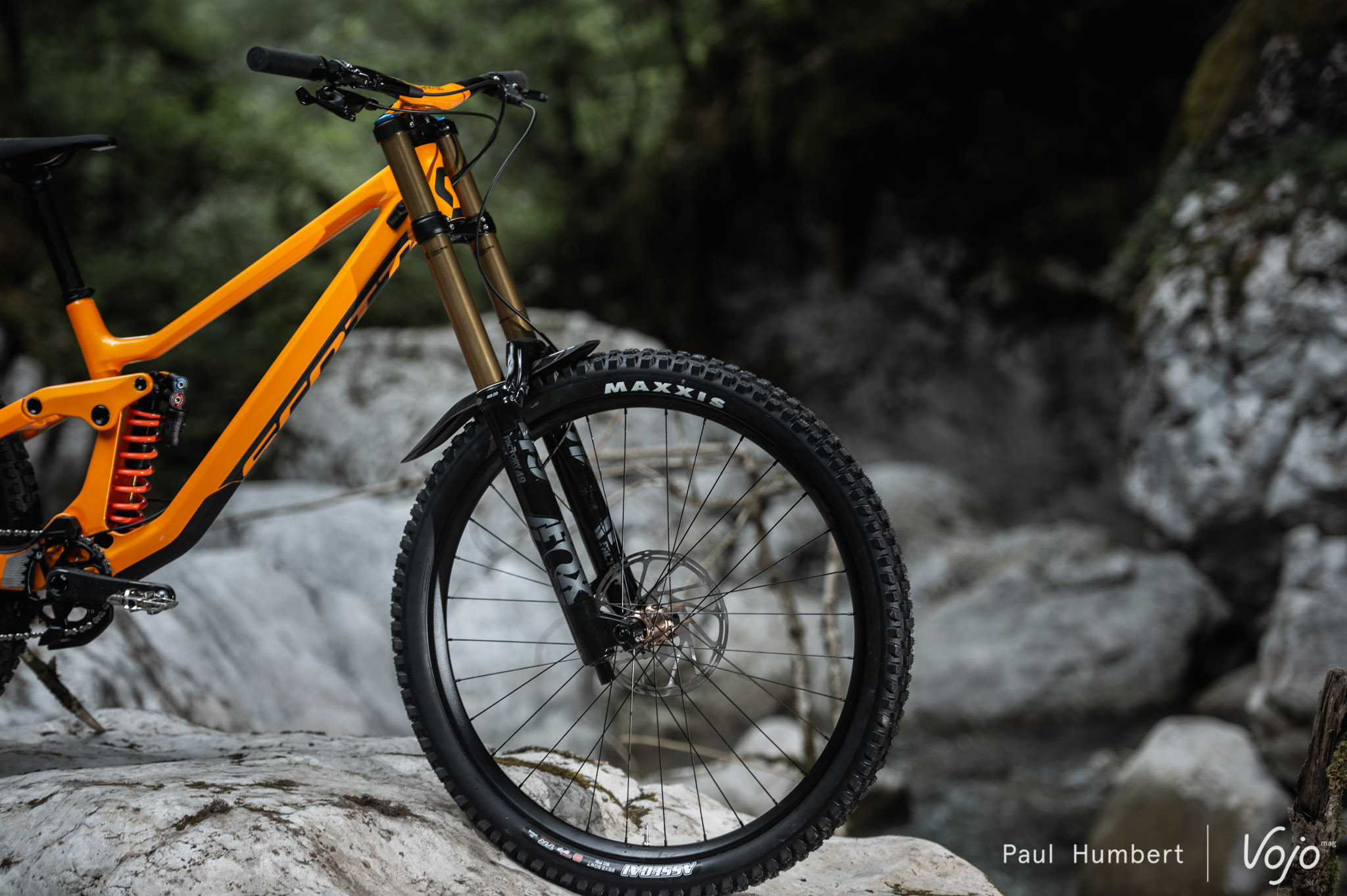 Dans le team Scott DH Factory, les 3 garçons roulent en 29″ tandis que Marine Cabirou préfère le vélo avec une roue de 27,5″ à l’arrière. L’avis de Clément Martin sur cette question : « On est 100 % ouvert à ce type de montage. La géométrie est optimisée pour des roues de 29″, c’est dans cette taille qu’on pourra vraiment exploiter toutes les possibilités de réglages. Pour rouler en 27,5″, il faut forcément passer en boîtier haut, c’est trop bas sinon. Même chose avec seulement la roue arrière en 27,5″ mais ça reste tout à fait possible de rouler le vélo comme ça. »