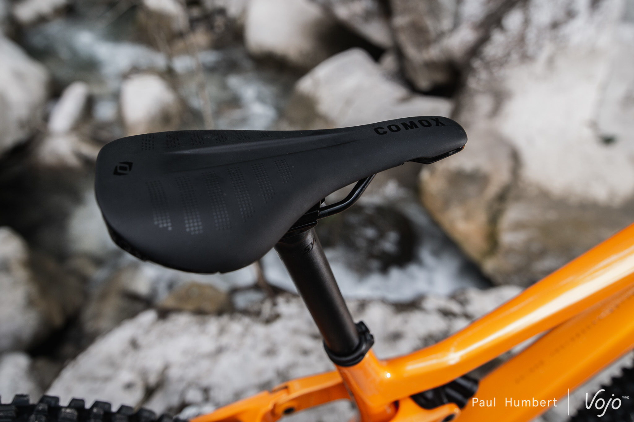 Côté géométrie, en taille M, 29″ avec le flip-chip en position « boîtier bas » et l’axe en position « bases courtes », on retrouve les valeurs suivantes : bases à 438.7 mm, angle de direction à 62.9° , angle de selle à 66.8°, reach à 430.3 mm et stack à 636.2 mm. Petite particularité, l’angle de selle sur les tailles S et M est plus droit que sur les tailles L et XL (66.8° contre 63.8°). L’intérêt ? Permettre aux pilotes les plus petits de baisser et/ou reculer au maximum la selle sans qu’elle ne vienne interférer avec la roue arrière en fin de débattement.