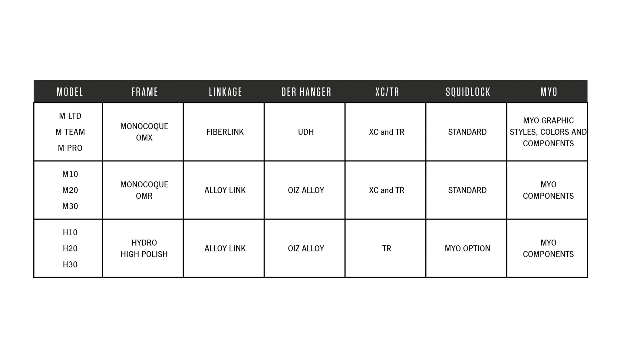 Côté tarifs pour la version 100mm, il faut compter 2399€ au minimum pour l’OIZ H30 (alu), 2699€ pour l’OIZ H20 (alu), 3599€ pour le M30 (alu), 4499€ pour le M10 (Carbone OMR), 5299€ pour le M-PRO (Carbone OMX), 6999€ pour le M-TEAM (carbone OMX) et 8599€ pour le M-LTD (carbone OMX). Côté TR, comptez 2999€ pour le H10 TR (alu), 3899€ pour le M20 TR (Carbone OMR) et 5499€ pour le M-PRO TR (carbone OMX).
