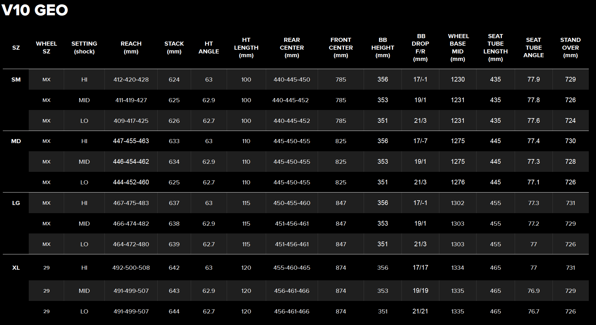 Sur la géométrie, c’est assez clair : le V10 change de format de roues (Mulet de S à L puis 29″ en XL, plus de 27,5″), le reach s’allonge (+ 18 mm en M, 454 mm en position intermédiaire) et l’angle de direction se couche (entre 62,7 et 63° selon le réglage, contre 63,3 à 63,7° auparavant). On note aussi que le boîtier de pédalier remonte de quelques millimètres.