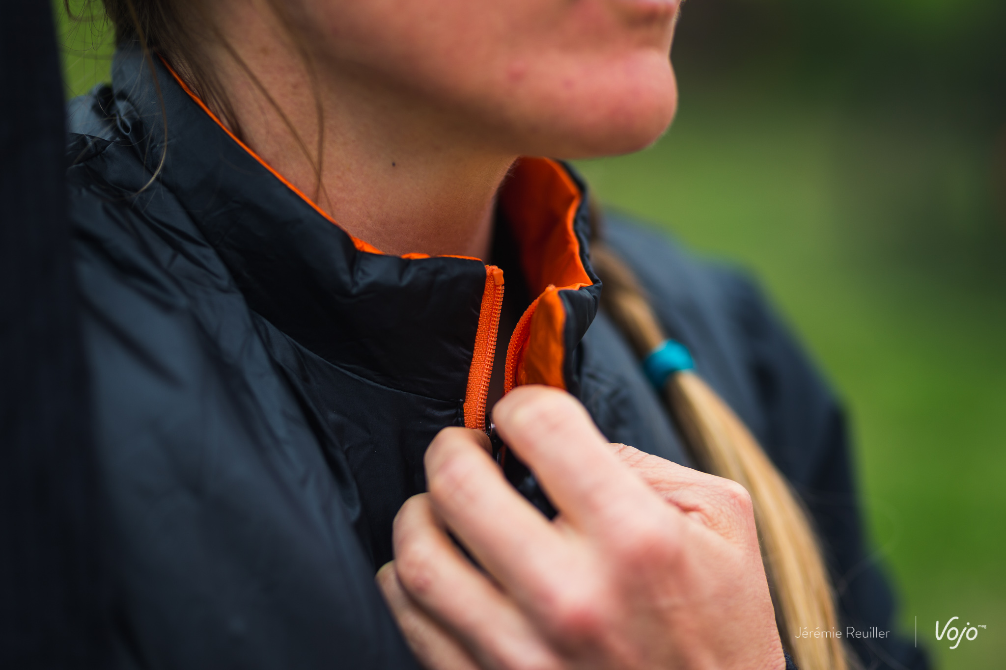 Elle abrite une poche poitrine (pour la carte bleue, toujours), on a aussi apprécié sa patte magnétique qui ferme le col et permet d’ouvrir en dessous tout en gardant le cou au chaud (on a notre petit confort, et sous le vent pyrénéen, ça n’était pas dommage de pouvoir tout combiner), sa légèreté et sa chaleur due à la bien connue fibre Primaloft utilisée et sa bande couvrante de la fermeture Éclair qui préserve du vent.