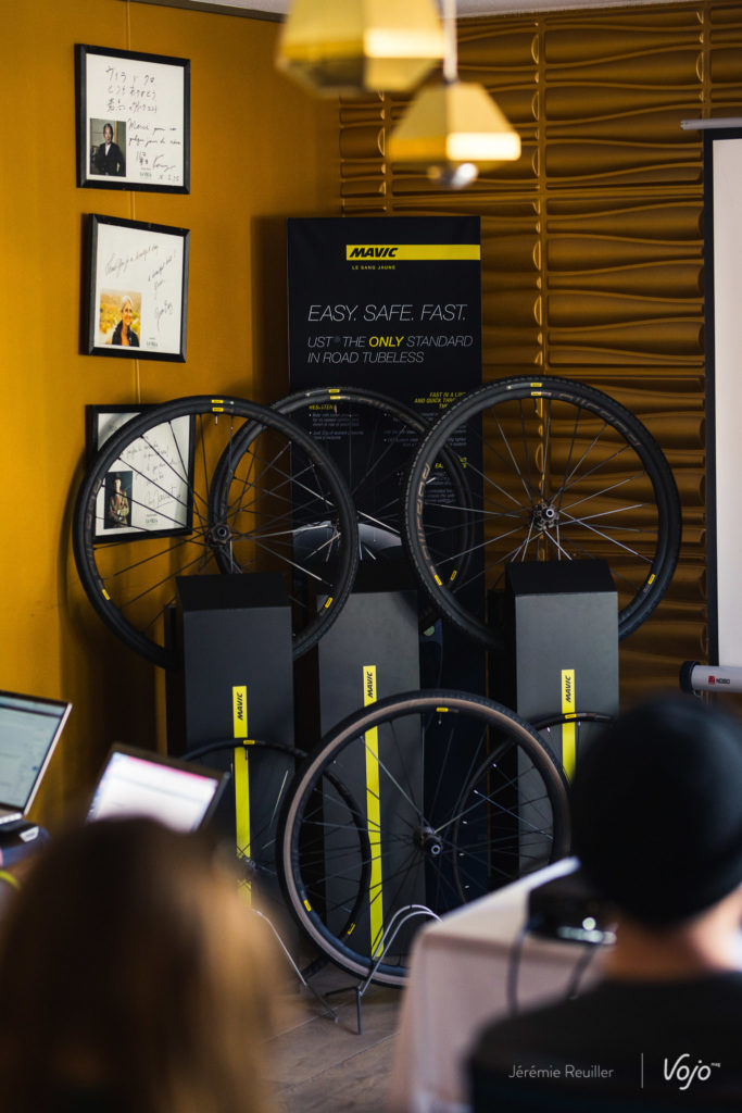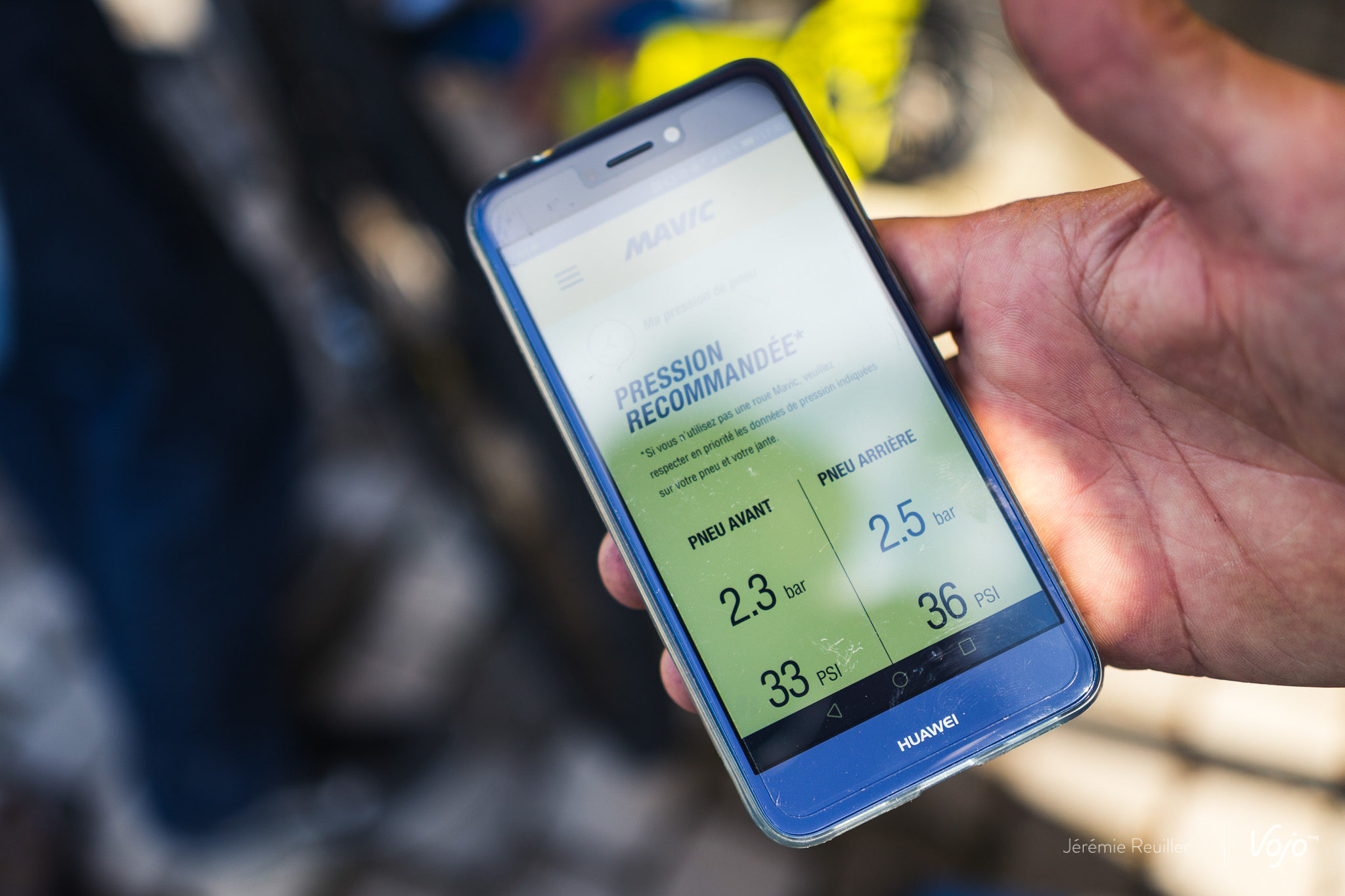 Pour permettre même aux néophytes de s’y retrouver, Mavic lançait aussi (sorte de feu d’artifice du lancement) son application MyMavic (gratuite sur AppleStore et GooglePlay), dans laquelle on rentre tout un tas d’informations (poids, météo, terrain, profil de pneus, roues, etc.) et vous disposez ensuite de la préconisation de pression adaptée (bon à savoir, Mavic inclut d’ailleurs un sag du pneu, c’est-à-dire la prise en compte de l’affaissement du pneu sous le poids du pilote en statique, dans sa mesure).