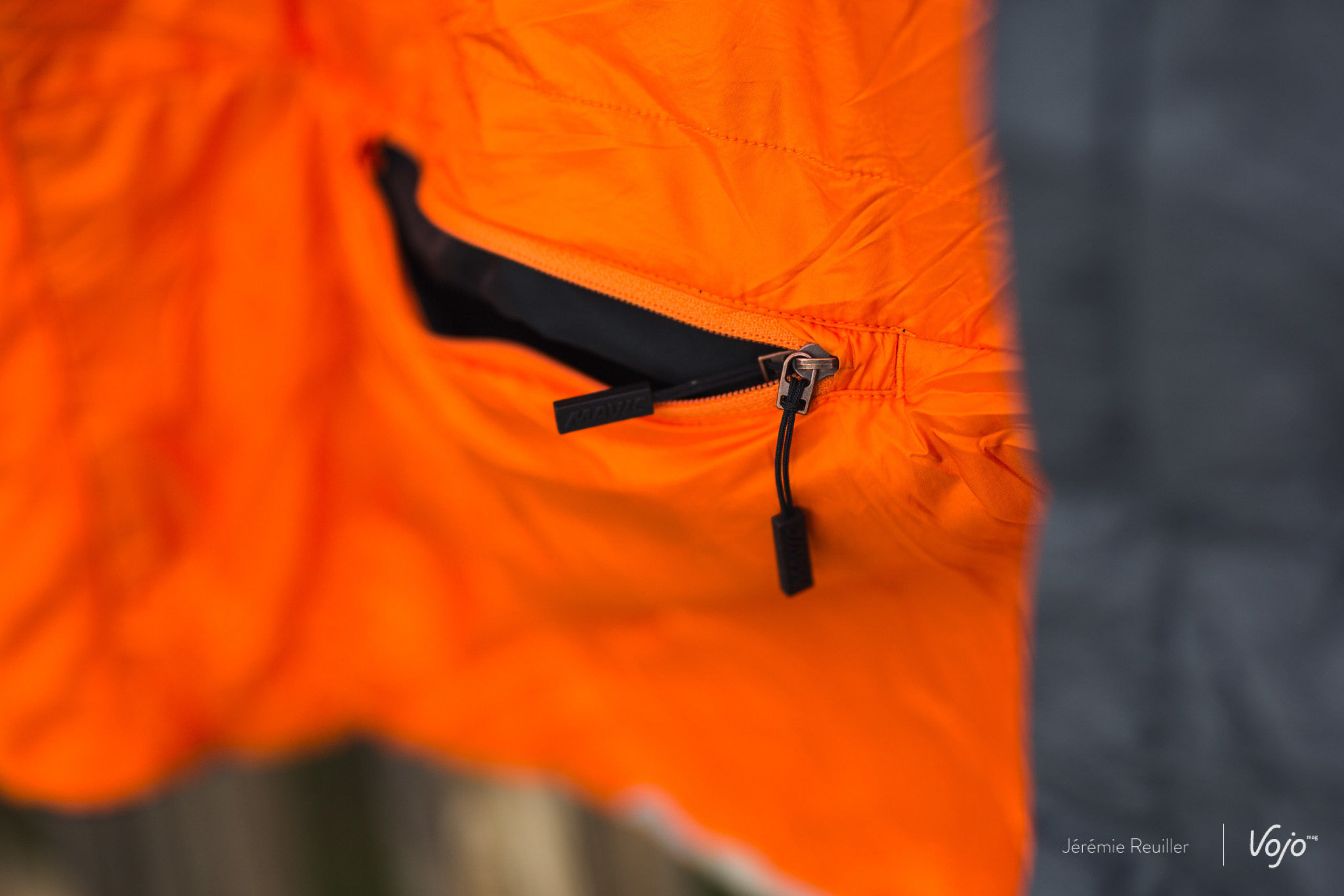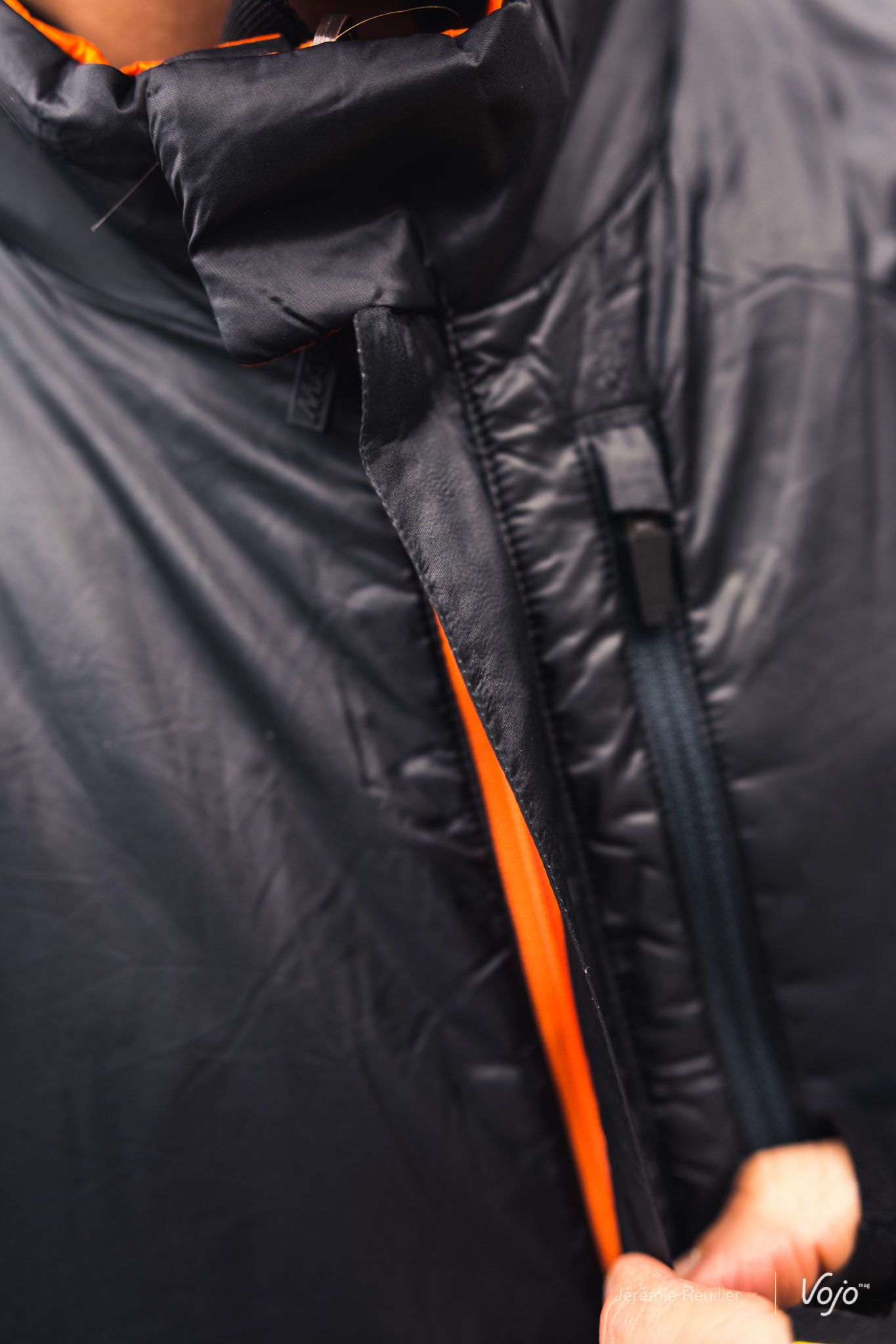 Elle abrite une poche poitrine (pour la carte bleue, toujours), on a aussi apprécié sa patte magnétique qui ferme le col et permet d’ouvrir en dessous tout en gardant le cou au chaud (on a notre petit confort, et sous le vent pyrénéen, ça n’était pas dommage de pouvoir tout combiner), sa légèreté et sa chaleur due à la bien connue fibre Primaloft utilisée et sa bande couvrante de la fermeture Éclair qui préserve du vent.