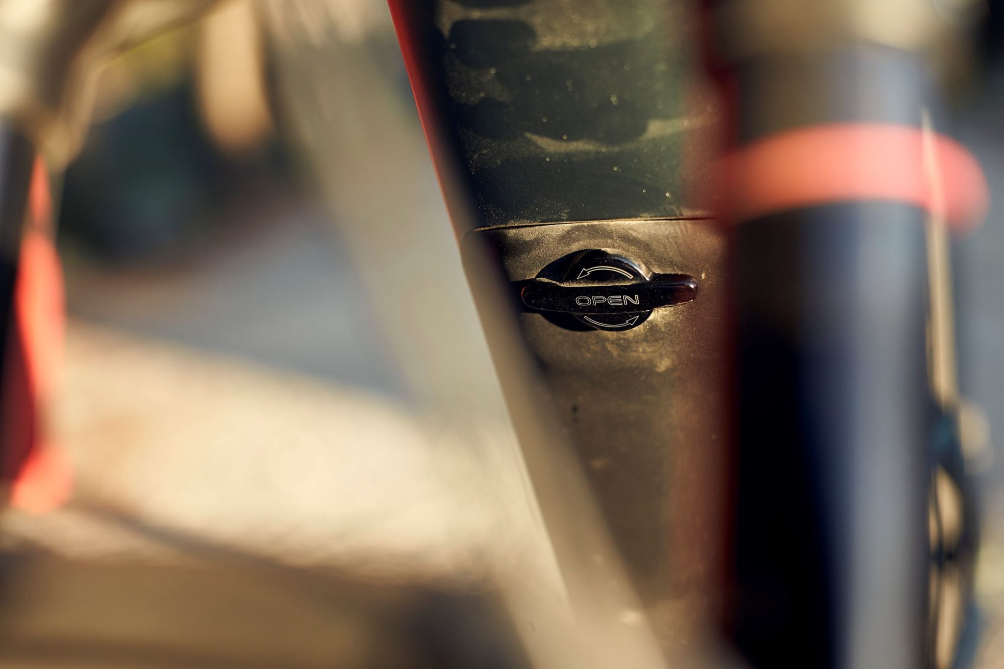 Si on apprécie le système simple et fiable qui permet d’accéder à la batterie sans clé, on regrette le positionnement du port de chargement (par ailleurs de belle facture, comme toute la finition du vélo) en haut du tube diagonal. Par rapport à un port au-dessus du boîtier de pédalier, cela complique un peu les choses lorsqu’on souhaite recharger sa batterie sans la démonter du vélo.