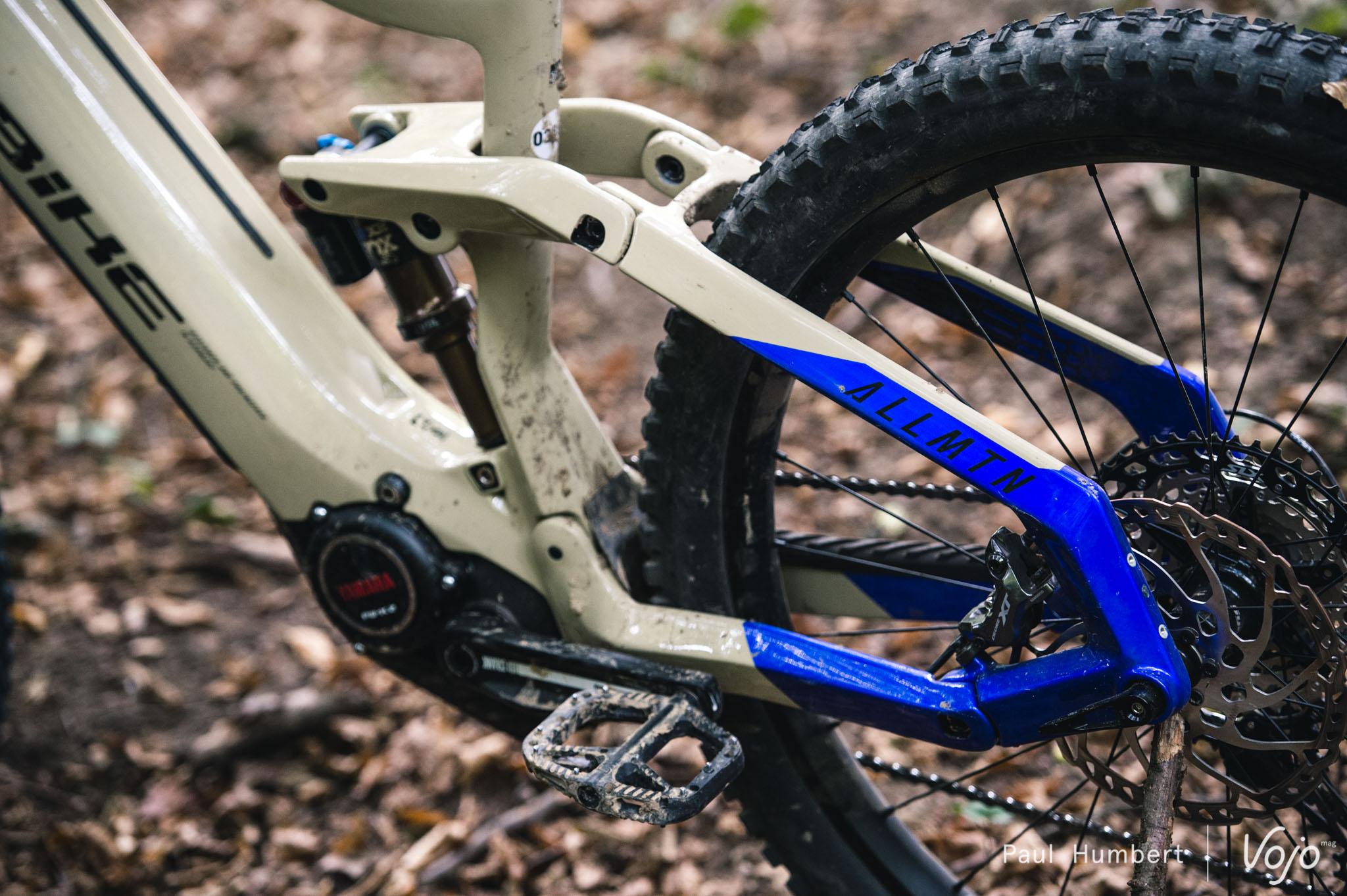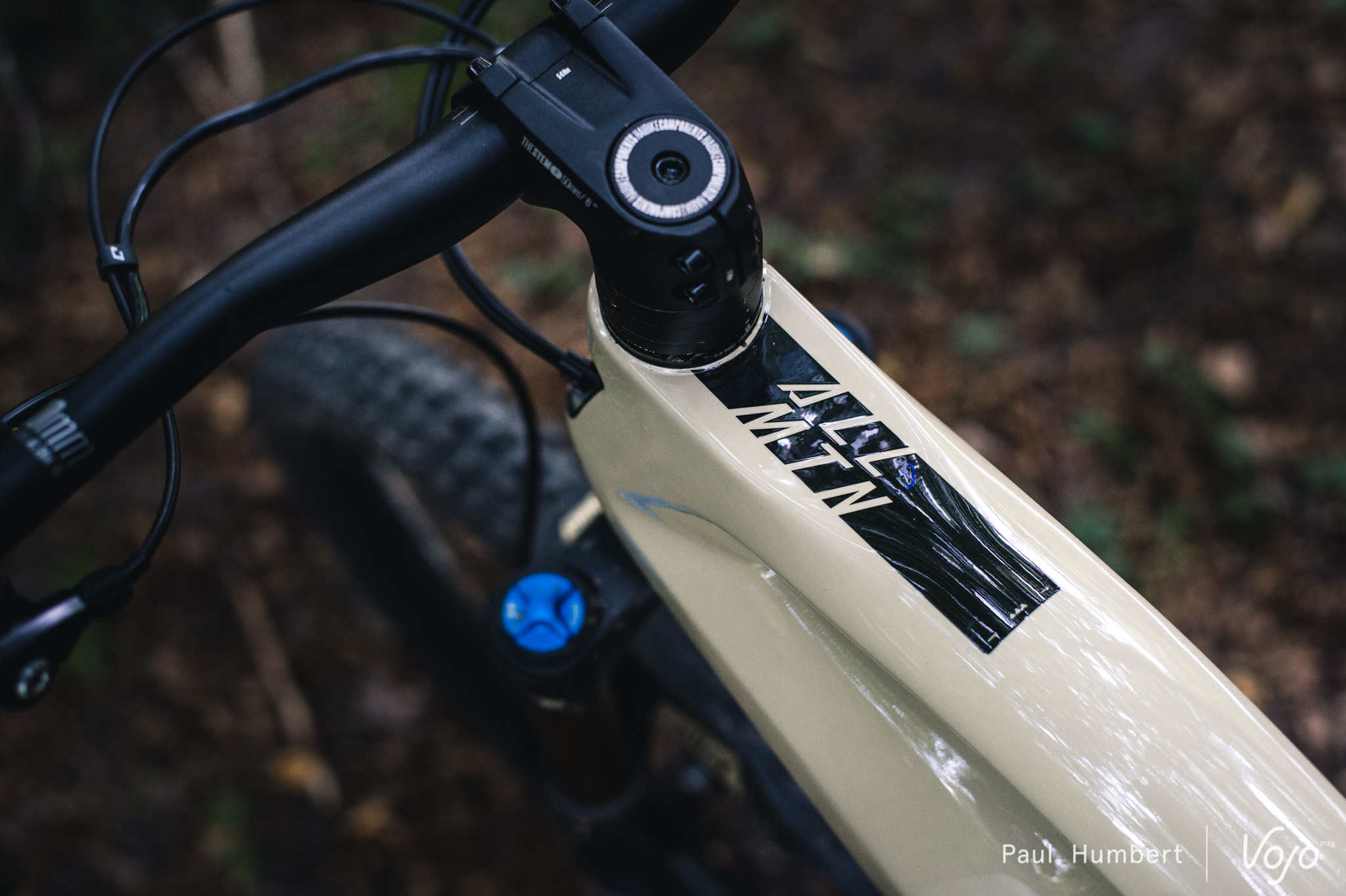 Autre point important à signaler, l’AllMtn adopte un montage « mullet », ou moto wheel size mix comme se plaît à l’appeler la marque. On retrouve donc sur le vélo une roue avant en 29″ et une roue arrière en 27,5″, une recette souvent utilisée en VTTAE pour conserver une maniabilité correcte et un comportement vivant en descente malgré le poids de la monture. Côté sections de pneu, on est sur du 2,5″ à l’avant et du 2,8″ à l’arrière, pour apporter un supplément de confort et d’adhérence malgré la « petite » roue arrière.