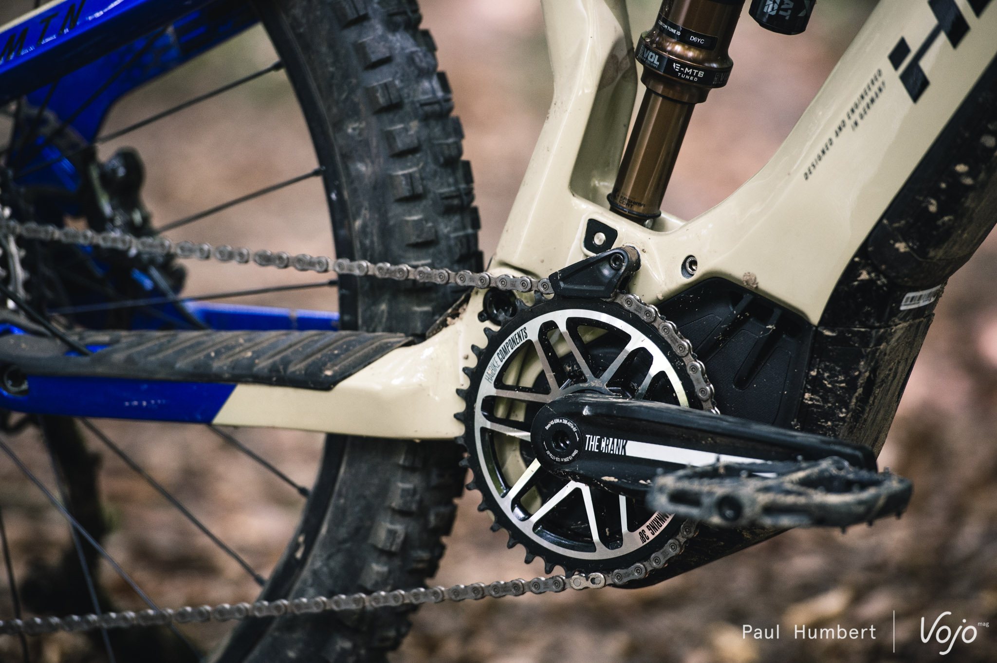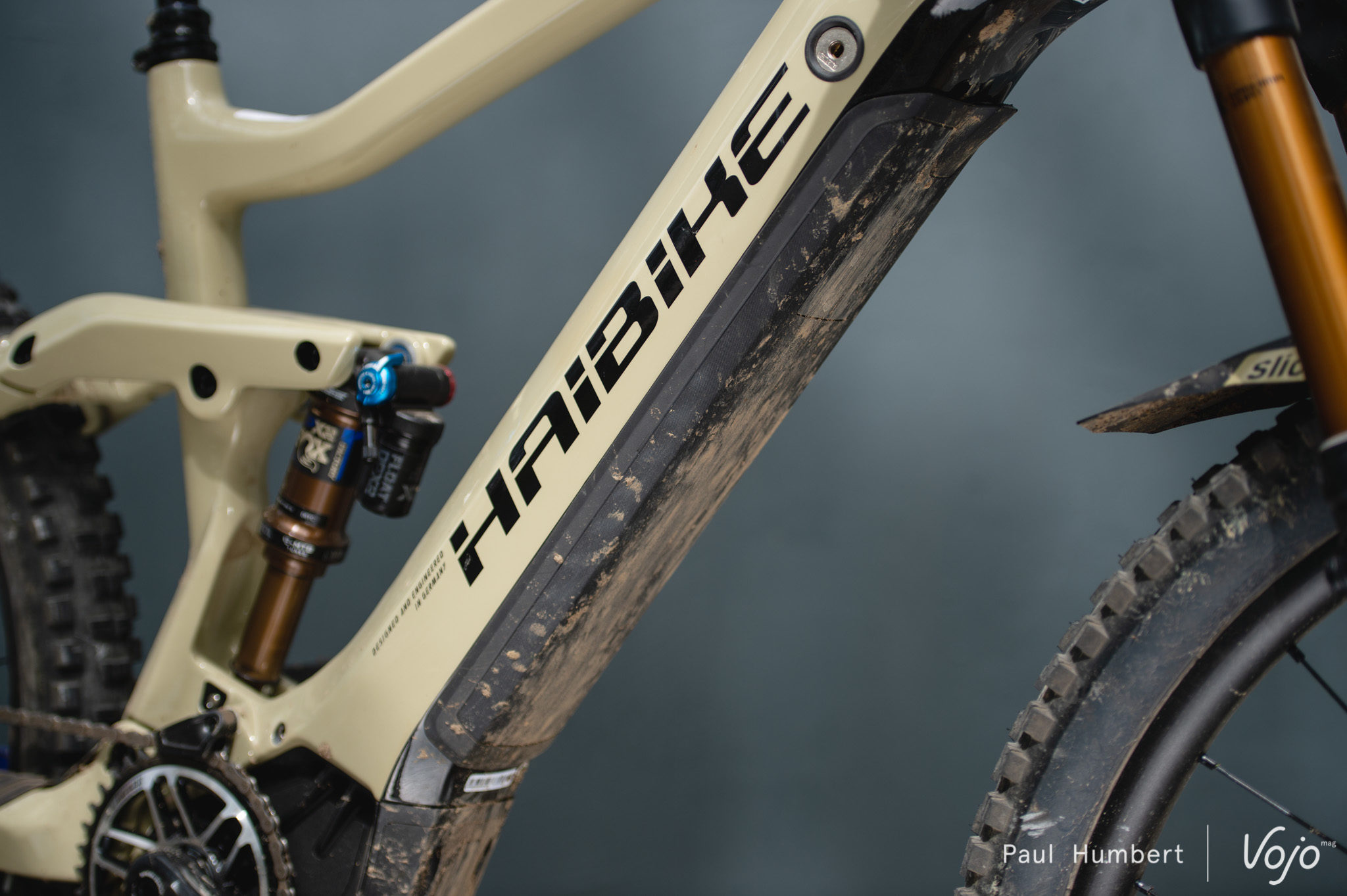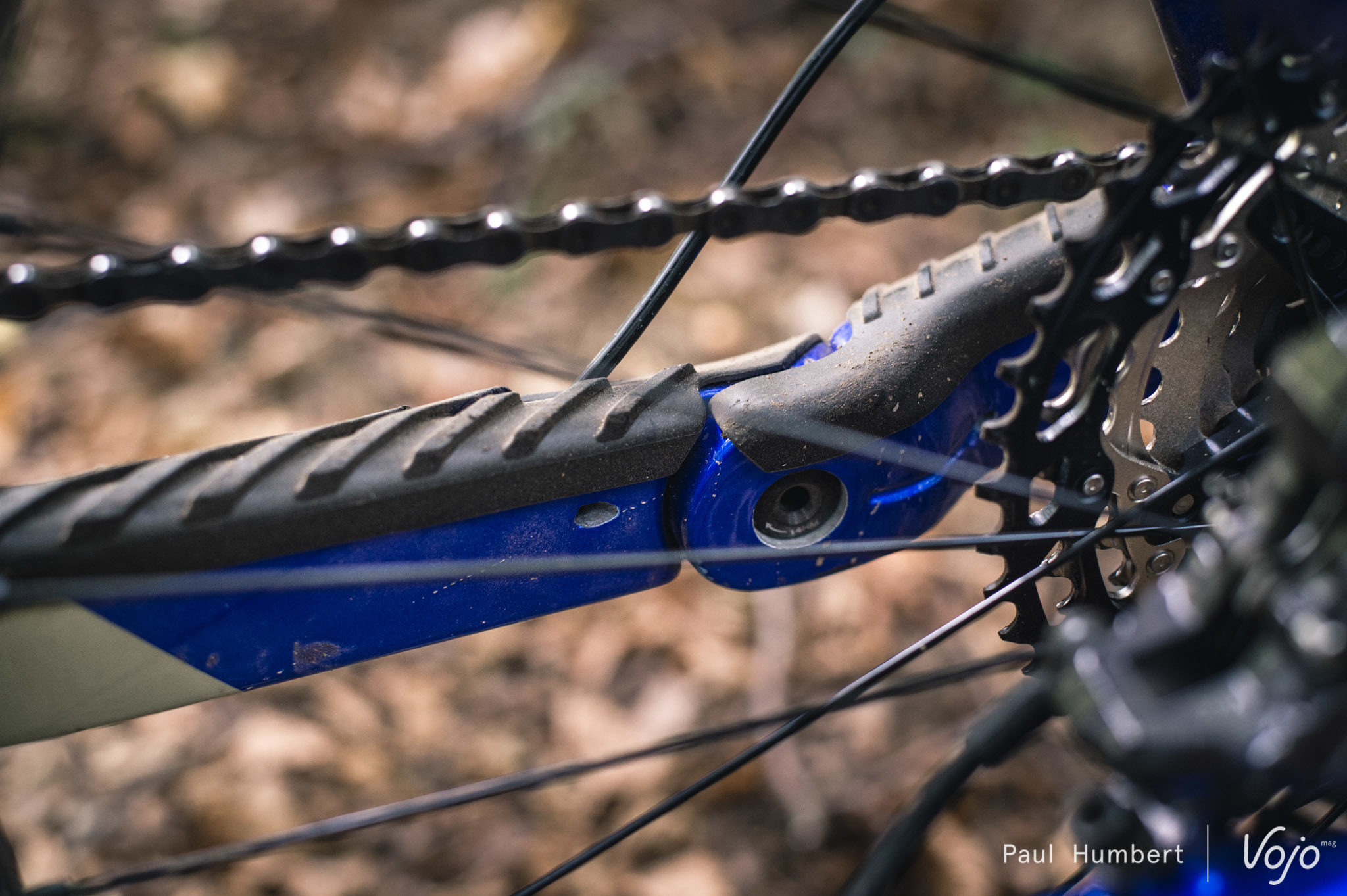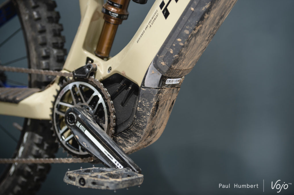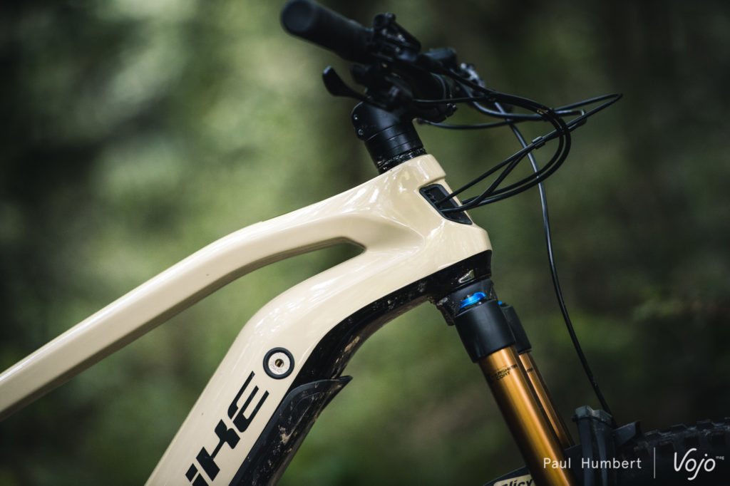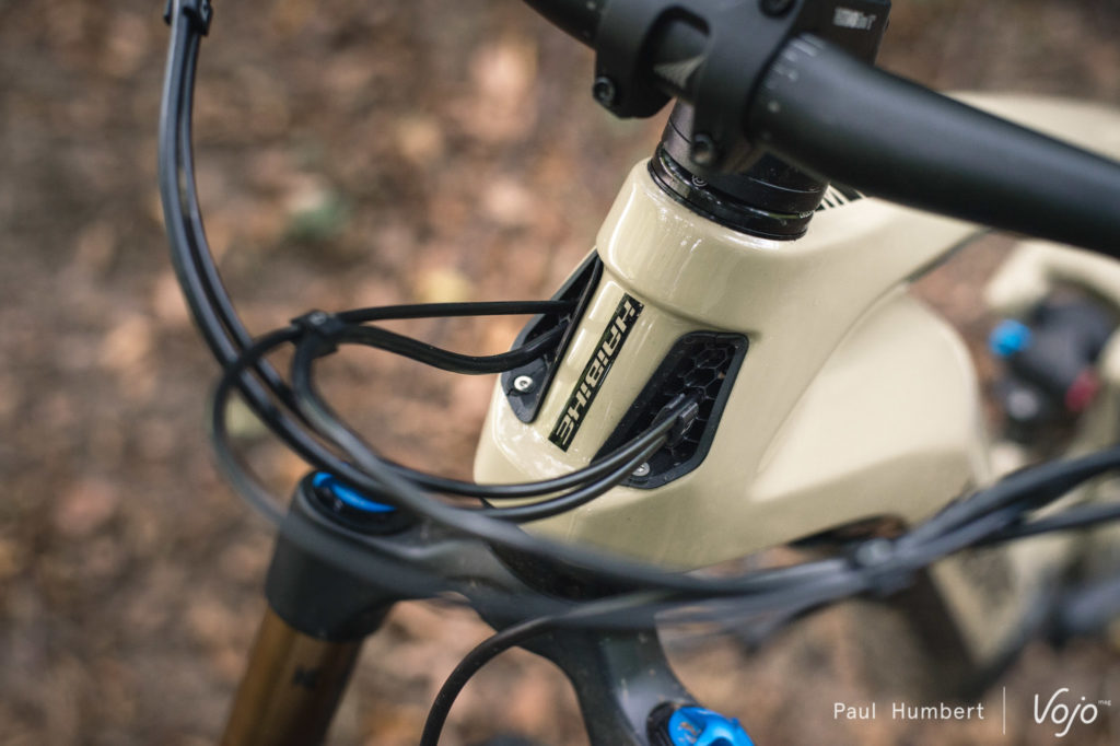 Sur le plan esthétique, le vélo se veut agressif avec des entrées de gaines en « nid d’abeille » qui rappellent les calandres de certaines voitures, une douille de direction travaillée et de généreuses protections aussi bien autour de la batterie et du moteur que sur la base droite.