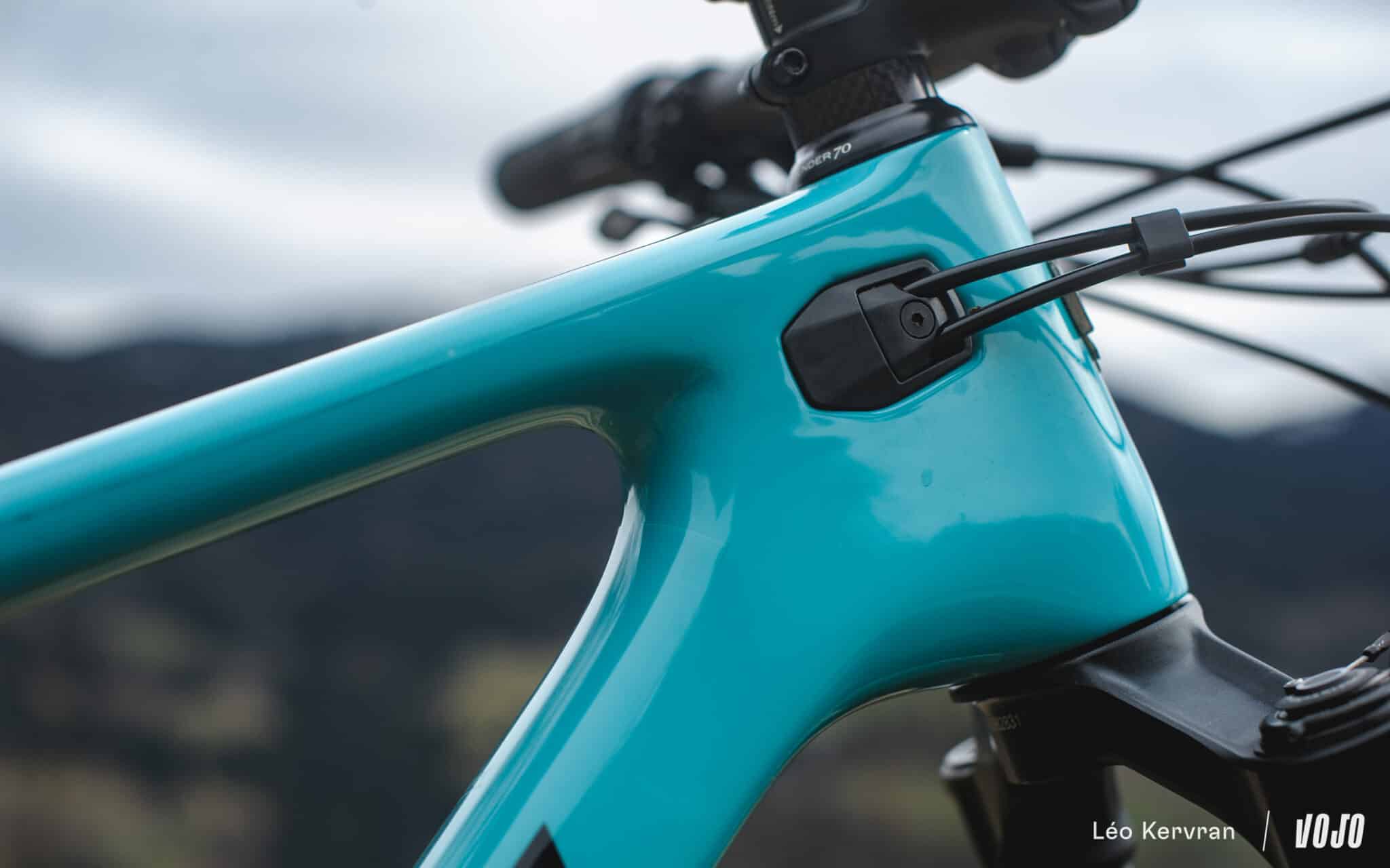 Les gaines ne sont pas guidées dans le cadre mais on trouve sous le tube diagonal une trappe de taille respectable pour gérer facilement leur passage autour de la zone critique du boîtier de pédalier. Bien vu !
