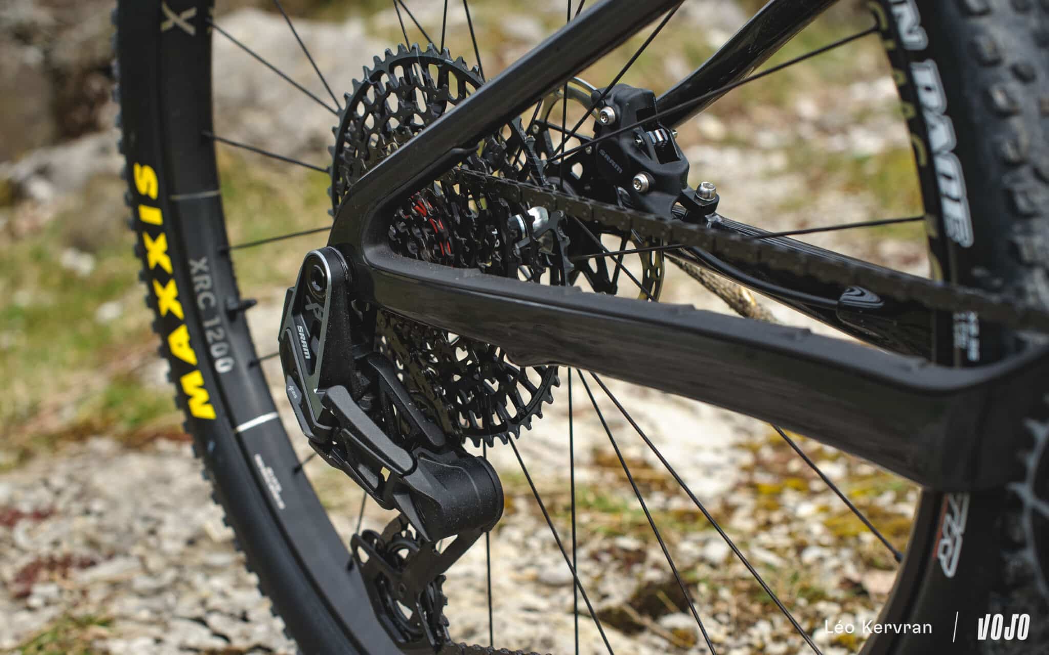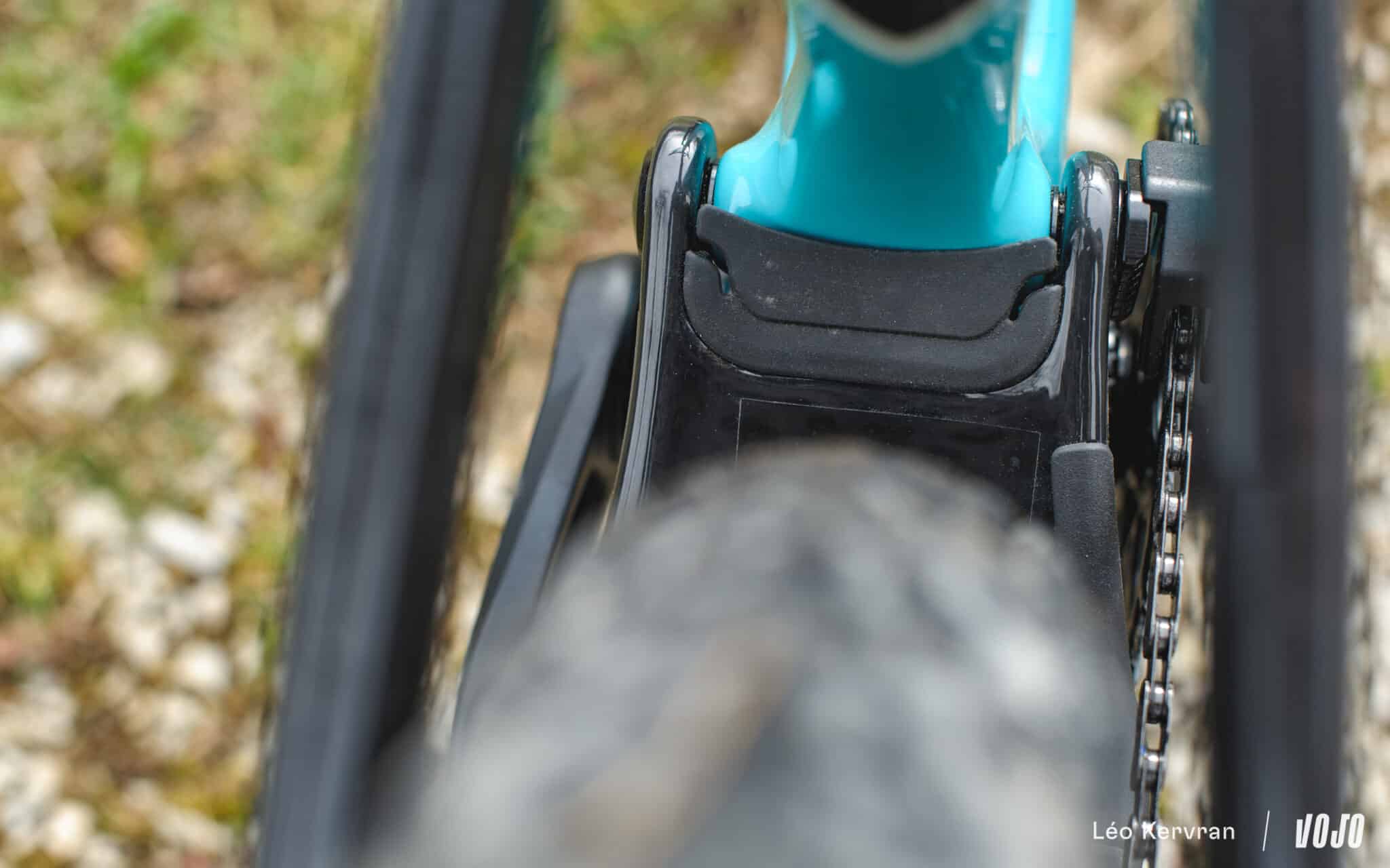On imagine que l’idée est de proposer une suspension à la fois très sensible sur les petits chocs tout en offrant suffisamment de support par la suite mais il faudra le vérifier sur le terrain. Avec ce petit volume, on se demande également ce que donnera la résistance à la chauffe sur les longues descentes comme on peut en avoir en marathon par exemple… et ce d’autant plus que la géométrie a de quoi mettre en confiance !