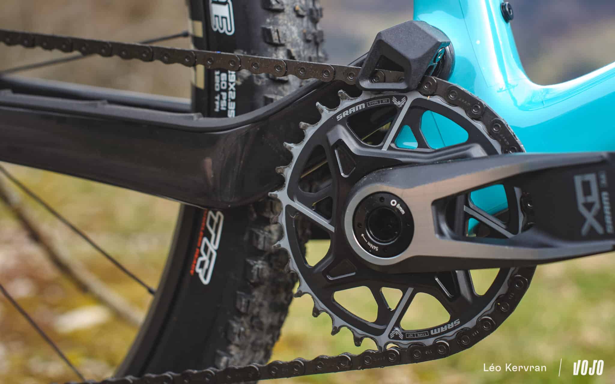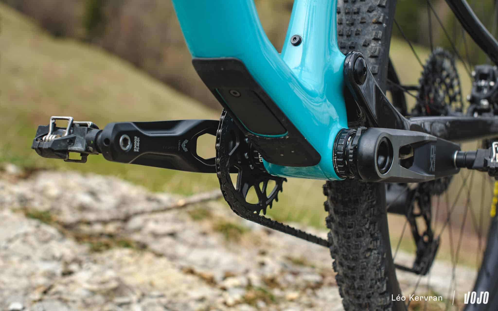 Le cadre accepte des plateaux de 28 à 36 dents, voire 38 dents à partir de la taille Medium. Vous noterez d’ailleurs sur ces photos que le vélo est équipé de série d’un petit guide-chaîne, réglable pour s’adapter à la couronne choisie. De manière générale, ce Yeti ASR est bien protégé pour un vélo de XC : protège-base très complet, petit « garde-boue » au-dessus du passage des gaines entres les bases et le triangle avant…