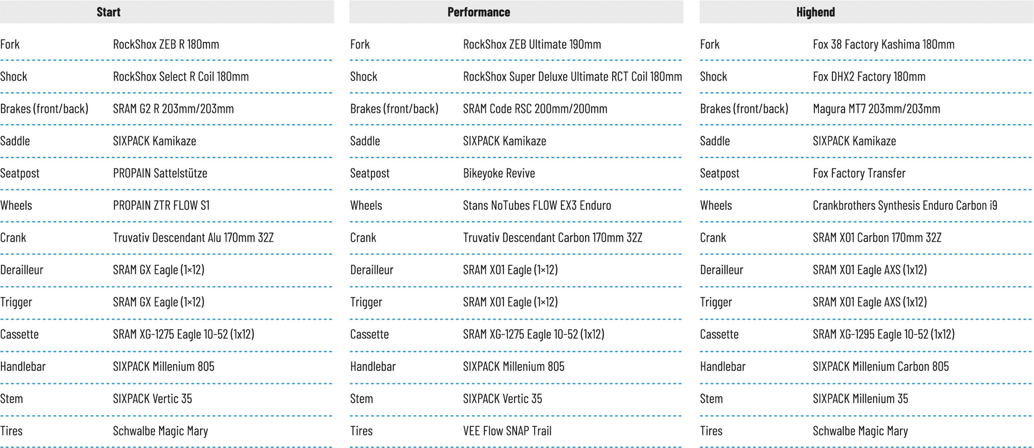 Enfin, l’équipement est comme de coutume chez Propain personnalisable via un configurateur en ligne complet et simple à utiliser qui permet de choisir ses équipements (suspensions, transmission, train roulant, freins et périphériques) mais aussi de modifier la couleur du cadre, du logo de la douille de direction et de celui du tube diagonal ainsi que de certains composants comme la selle ou les poignées.