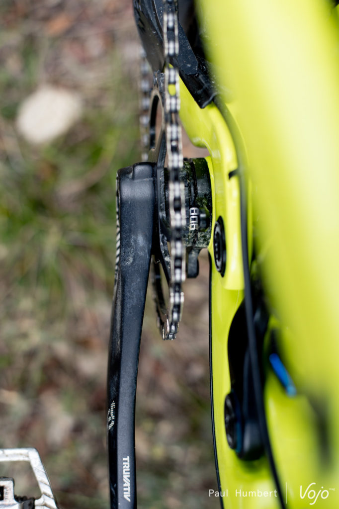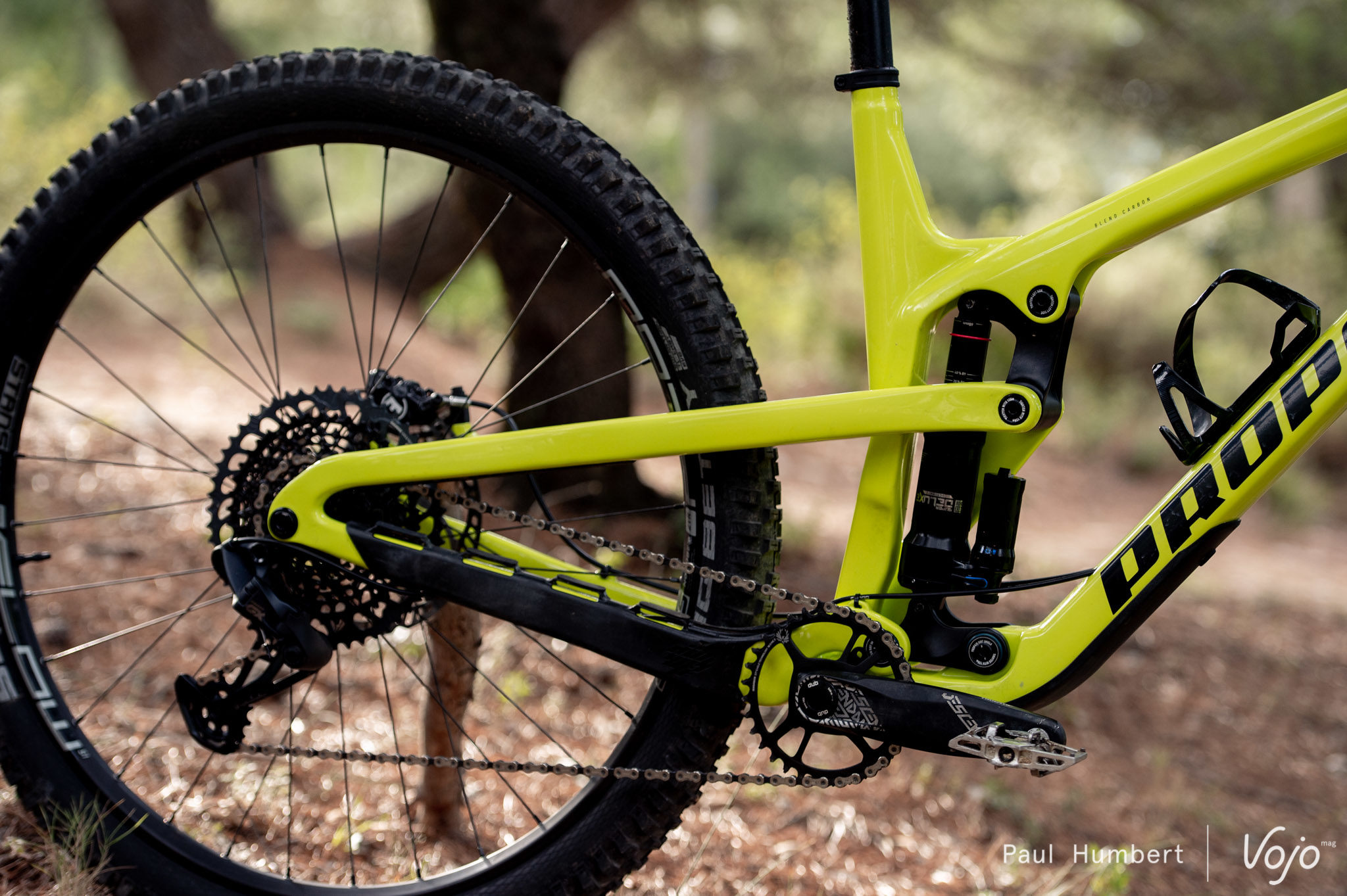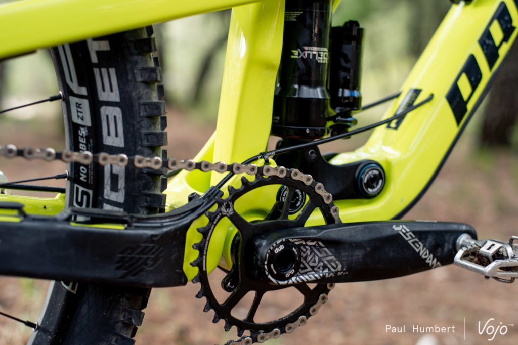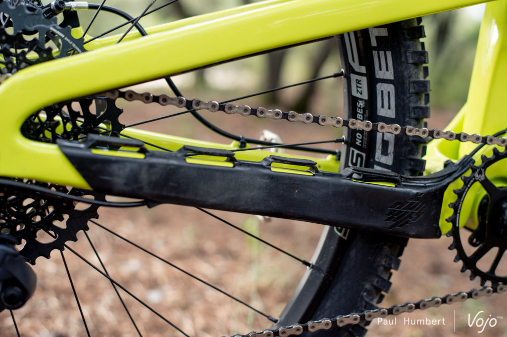 Côté suspension, la cinématique Pro10 à point de pivot virtuel et amortisseur flottant reste d’actualité mais l’amortisseur, auparavant placé entre la roue arrière et le tube de selle, migre devant ce dernier. Le triangle arrière est fermé côté gauche mais pas côté droit du fait de la transmission, d’où cet impressionnant hauban qui se projette vers l’avant. Compatible avec des amortisseurs à ressort air ou hélicoïdal, la suspension offre toujours 180 mm de débattement et peut être couplée à une fourche en 180 ou 190 mm.