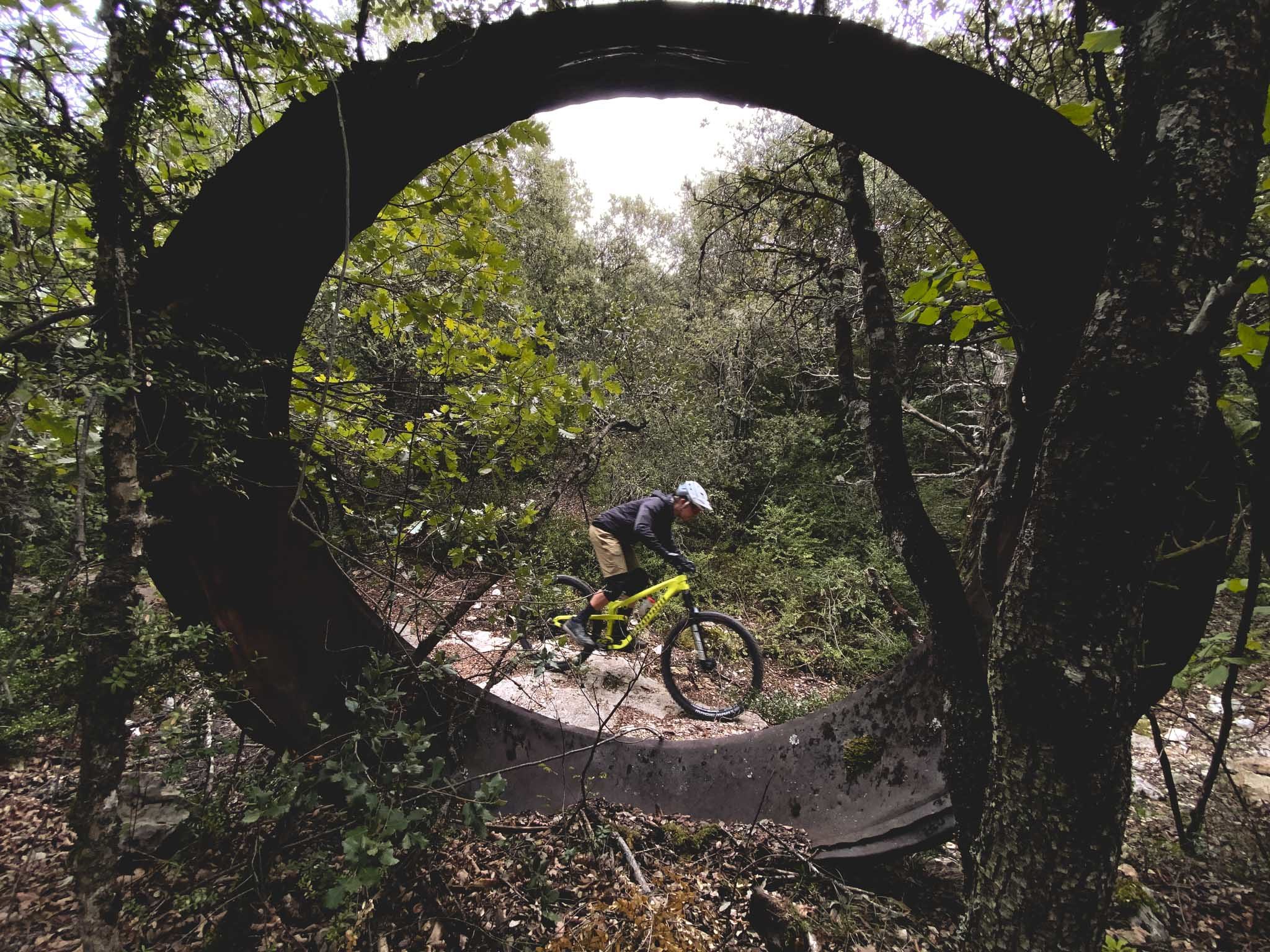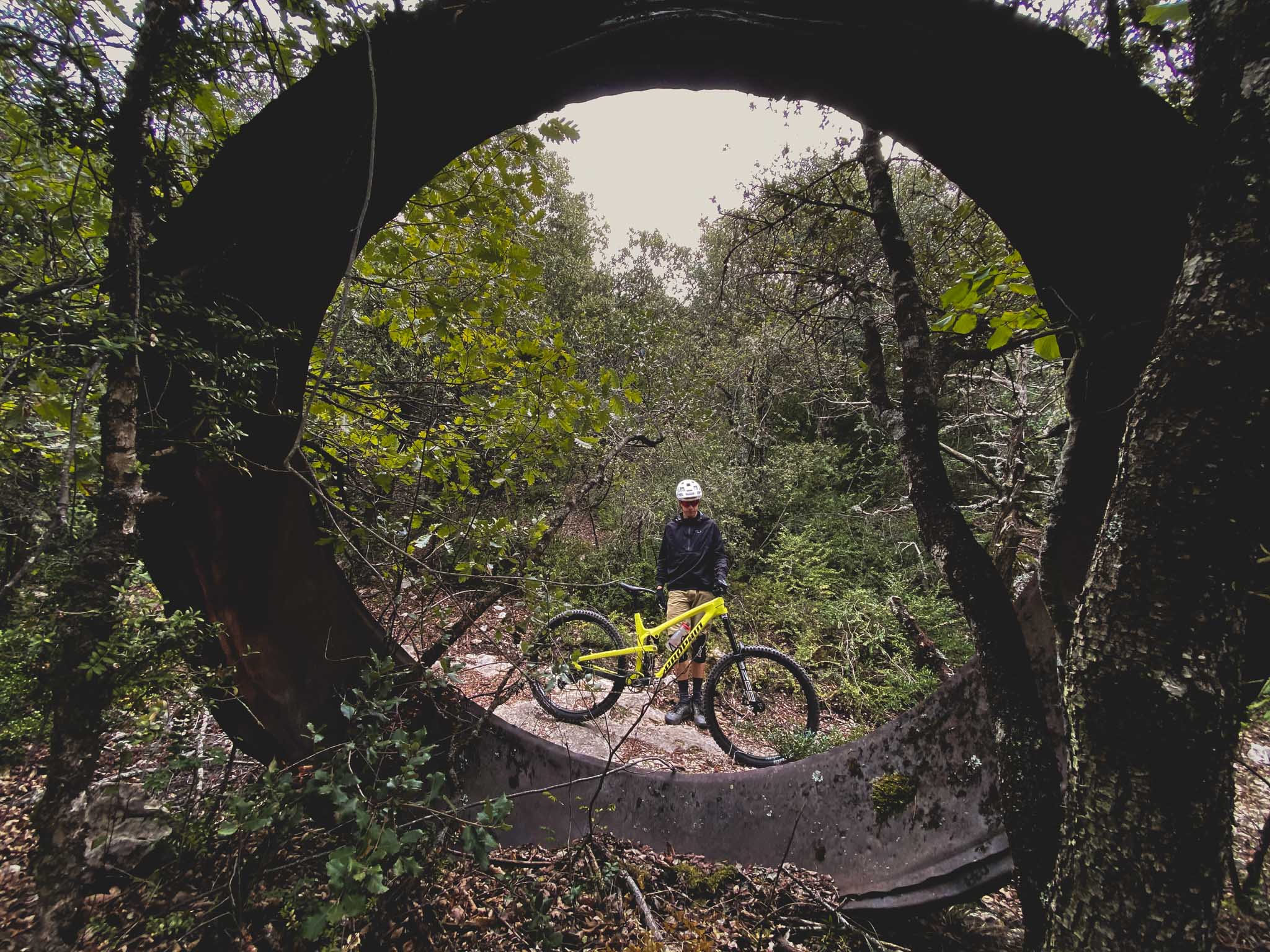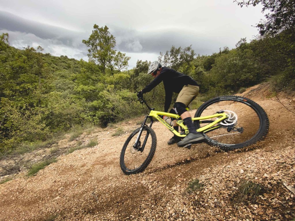 Première bonne surprise, en montée sur chemin large ou sur la route, le blocage d’amortisseur permet de monter au train particulièrement confortablement. À l’arrière, on est presque bloqué, on est assis bien droit et on monte tranquillement, et presque mieux que certains gros enduros. Ce n’est pas le coeur du programme, mais on sait déjà que grimper au départ des descente ne sera pas impossible. Dans les parties techniques le vélo a une superbe motricité, jusqu’au moment de cabrer. Sans trop de surprise, on pousse le vélo et on passe à la suite.