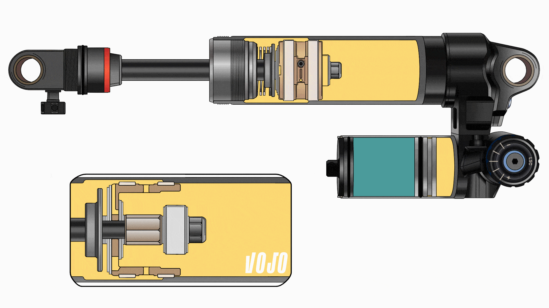 Toutefois, cette dérivation ne concerne que les premiers millimètres de la course de l’amortisseur. Au-delà, on a besoin de maintien et de contrôle ! Entre 10 et 80 % du débattement, on retrouve donc un fonctionnement normal : le diamètre du tube est moins important, l’huile ne peut plus contourner le piston et doit circuler à travers les circuits de compression hautes et basses vitesses. Enfin, sur les derniers 20 %, une butée hydraulique (présente sur le Super Deluxe depuis 2022, en violet ci-dessus) permet de contrôler précisément la fin de course, en plus de la butée en caoutchouc. Cette butée est réglable sur les versions haut de gamme Ultimate.