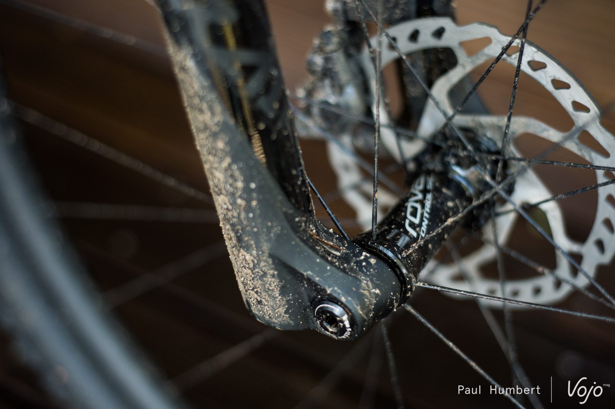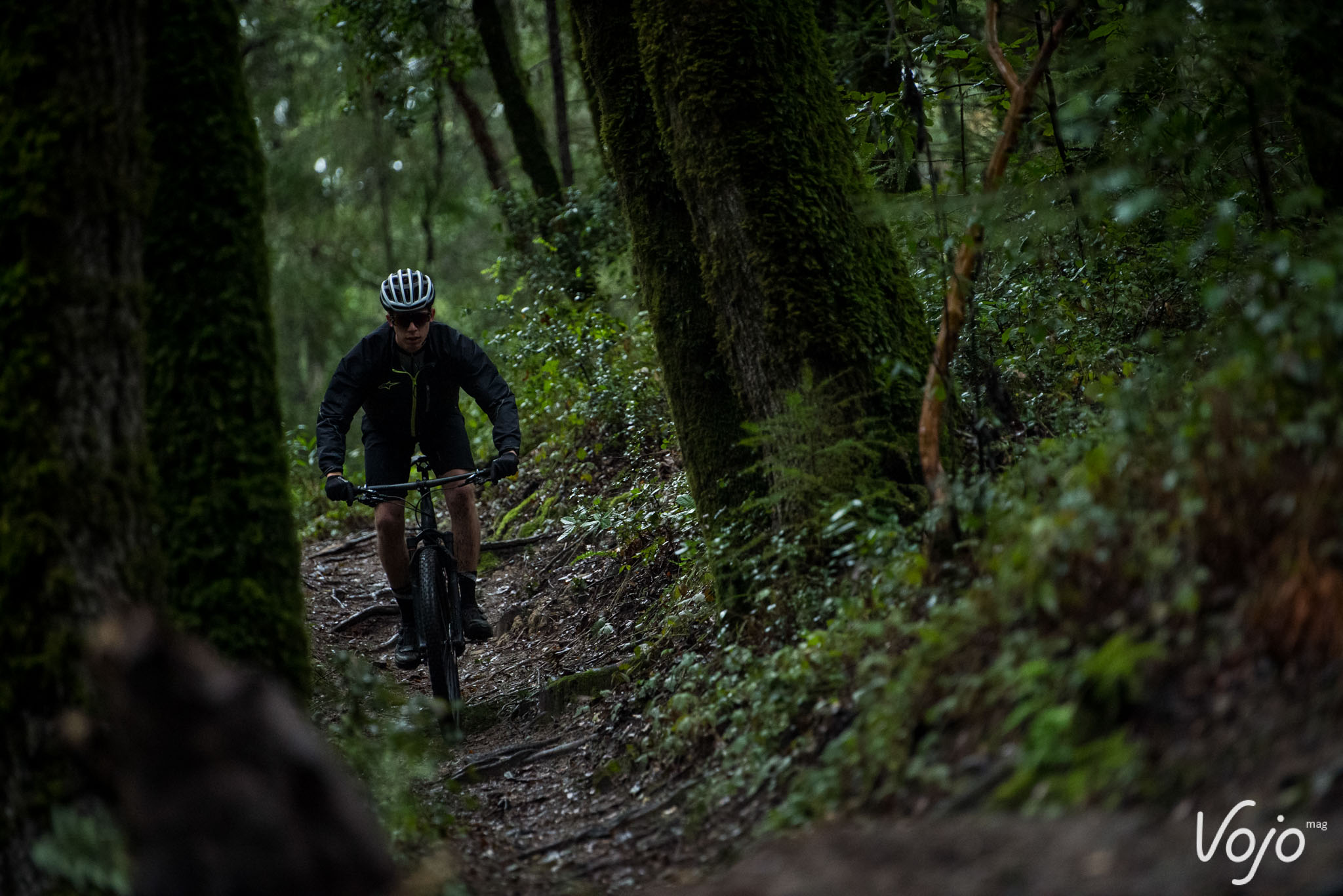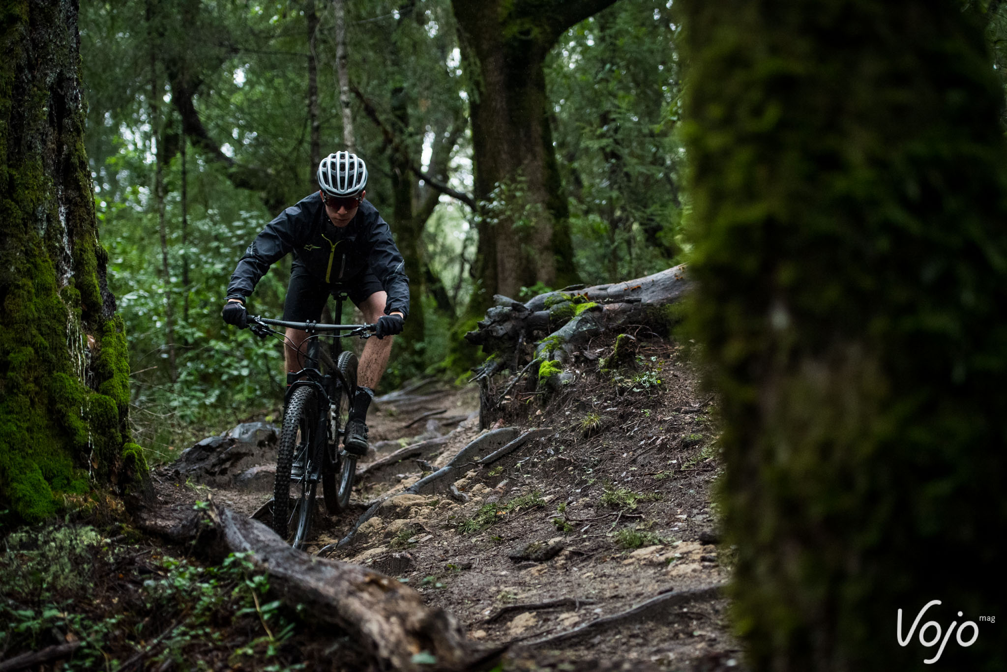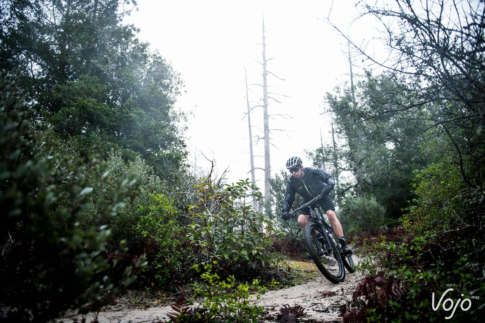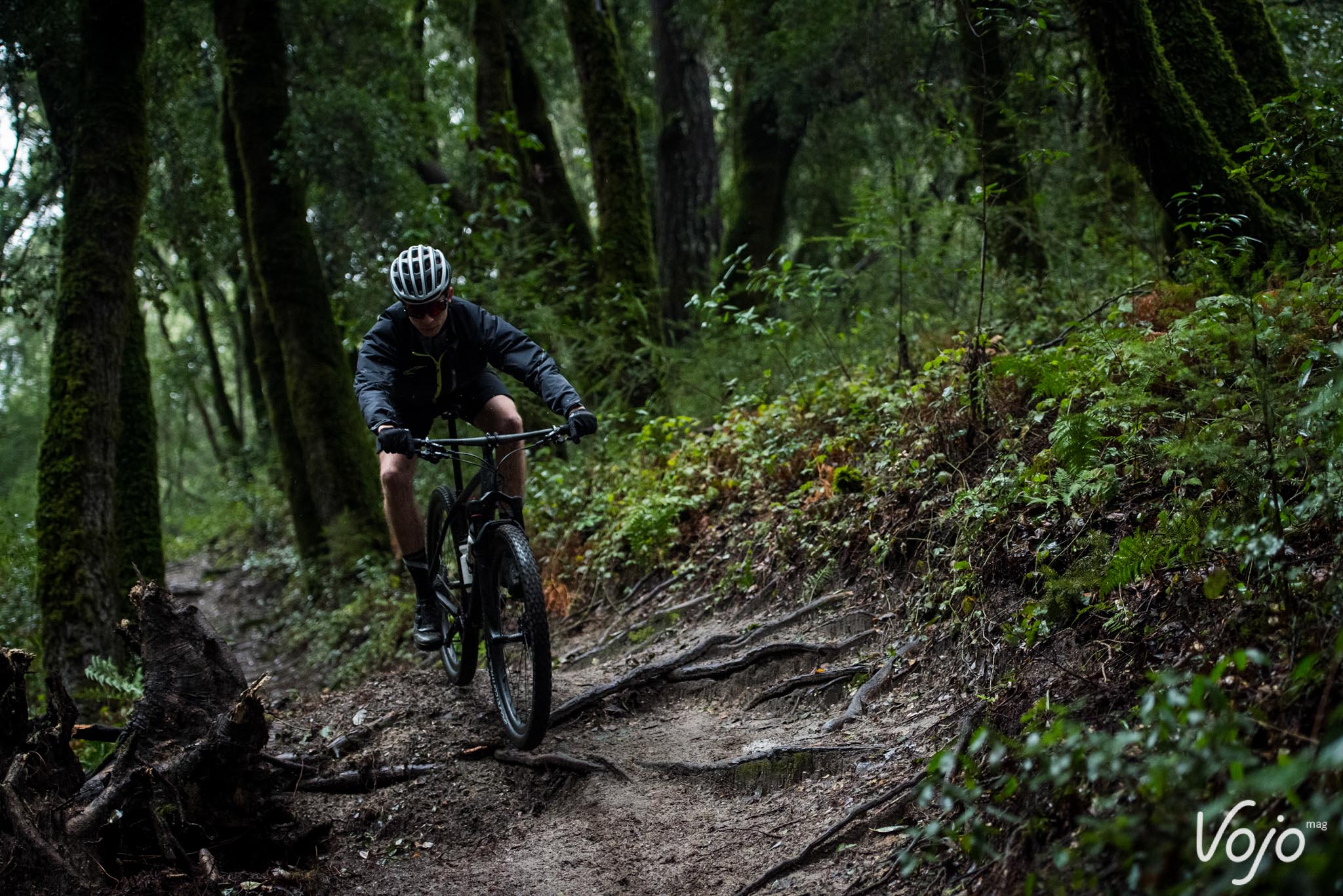 Chez Vojo, il y a plusieurs plumes, plusieurs objectifs mais aussi plusieurs riders. Moins aguerri au comportement de ces machines de XC que mon associé Olivier Béart, je retrouve toutefois un comportement au pédalage qui me semble totalement en accord avec la discipline. La traction est excellente, l’énergie est retransmise sans perturbation et les roues nous accompagnent à la moindre sollicitation. Cela en est presque grisant pour moi qui suis plus à l’aise sur des vélos à plus grand débattement. Dans des flaques et de la boue liquide, il est évidemment impossible de porter un jugement définitif après une petite sortie mais là où on peut vous assurer qu’un grand travail a été fourni, c’est quand la pente bascule dans l’autre sens. La combinaison d’une machine saine, des excellents pneus Specialized Fast track & Ground Control (2.3 de section avec gomme Gripton) et de la nouvelle paire de roue transforment l’exercice de la descente dans la boue et les racines en un véritable jeu d’enfant.