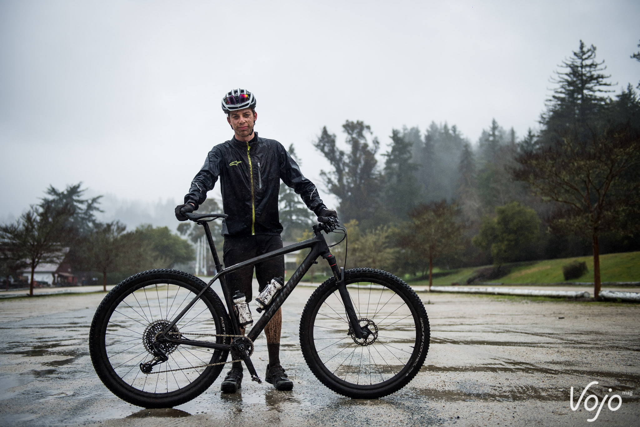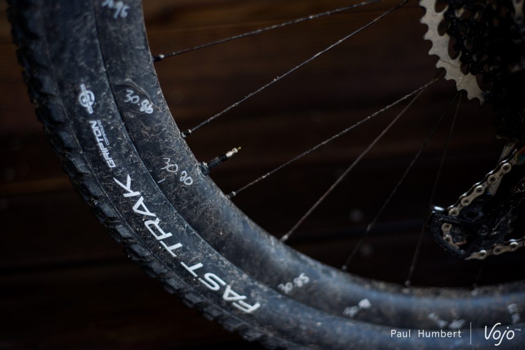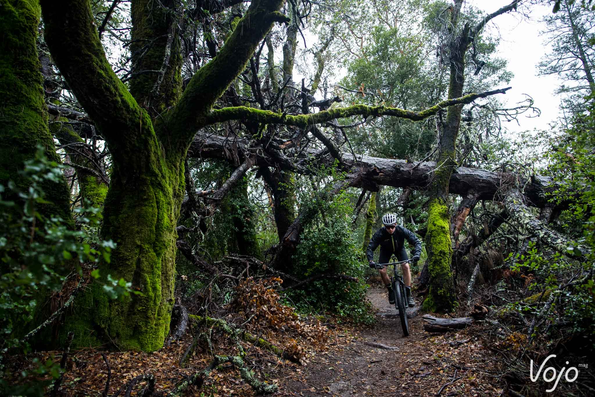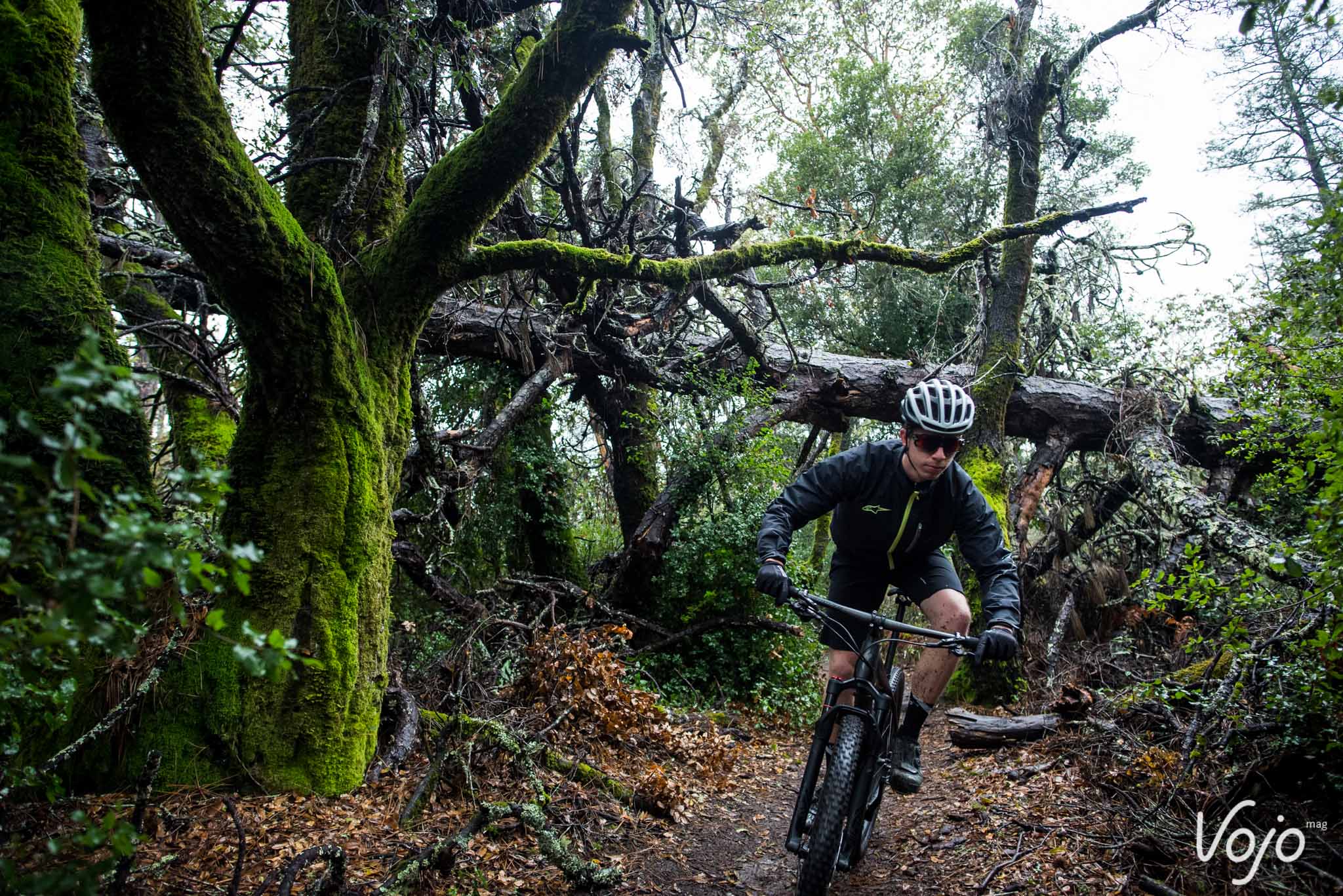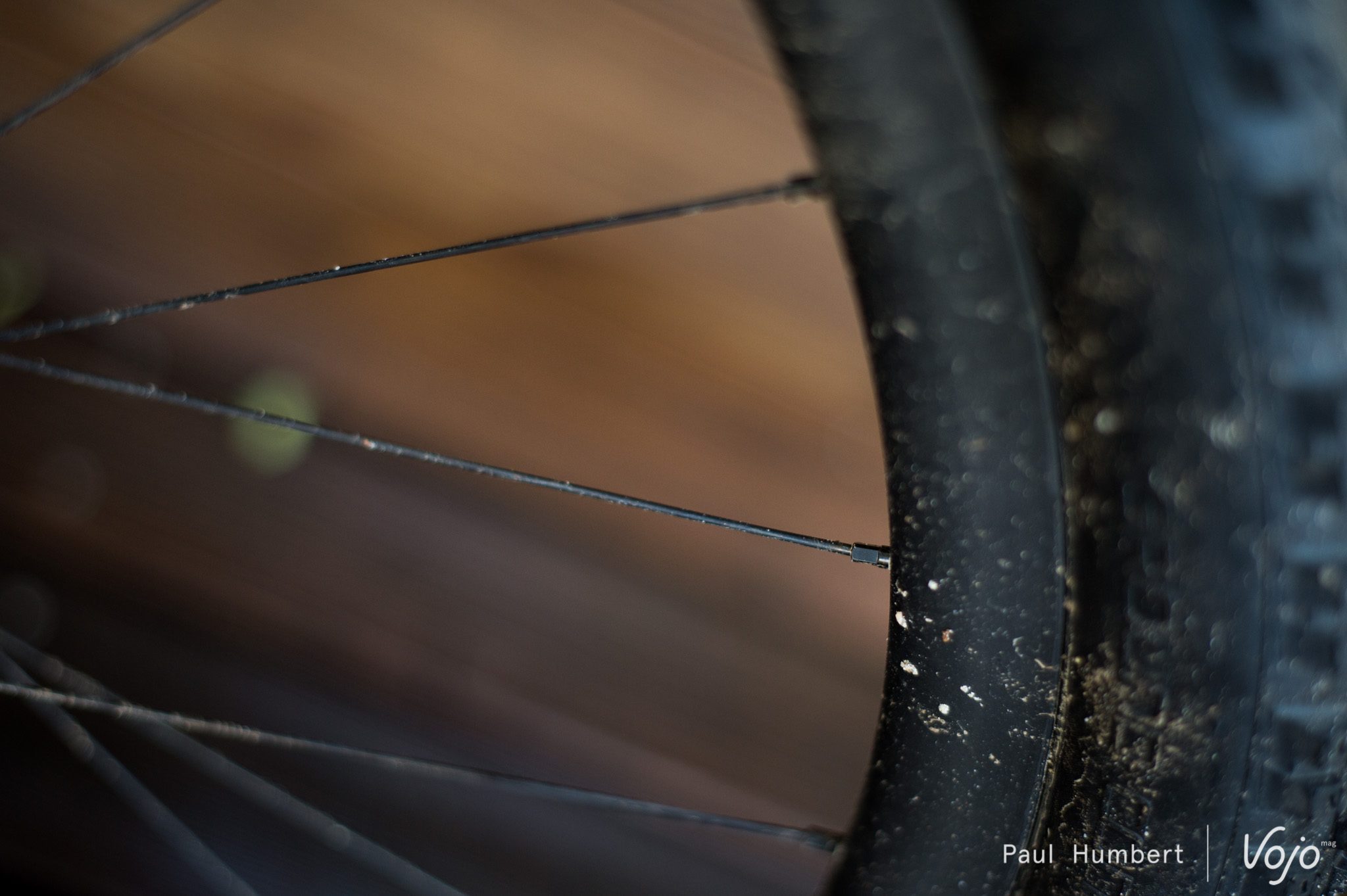 Chez Vojo, il y a plusieurs plumes, plusieurs objectifs mais aussi plusieurs riders. Moins aguerri au comportement de ces machines de XC que mon associé Olivier Béart, je retrouve toutefois un comportement au pédalage qui me semble totalement en accord avec la discipline. La traction est excellente, l’énergie est retransmise sans perturbation et les roues nous accompagnent à la moindre sollicitation. Cela en est presque grisant pour moi qui suis plus à l’aise sur des vélos à plus grand débattement. Dans des flaques et de la boue liquide, il est évidemment impossible de porter un jugement définitif après une petite sortie mais là où on peut vous assurer qu’un grand travail a été fourni, c’est quand la pente bascule dans l’autre sens. La combinaison d’une machine saine, des excellents pneus Specialized Fast track & Ground Control (2.3 de section avec gomme Gripton) et de la nouvelle paire de roue transforment l’exercice de la descente dans la boue et les racines en un véritable jeu d’enfant.