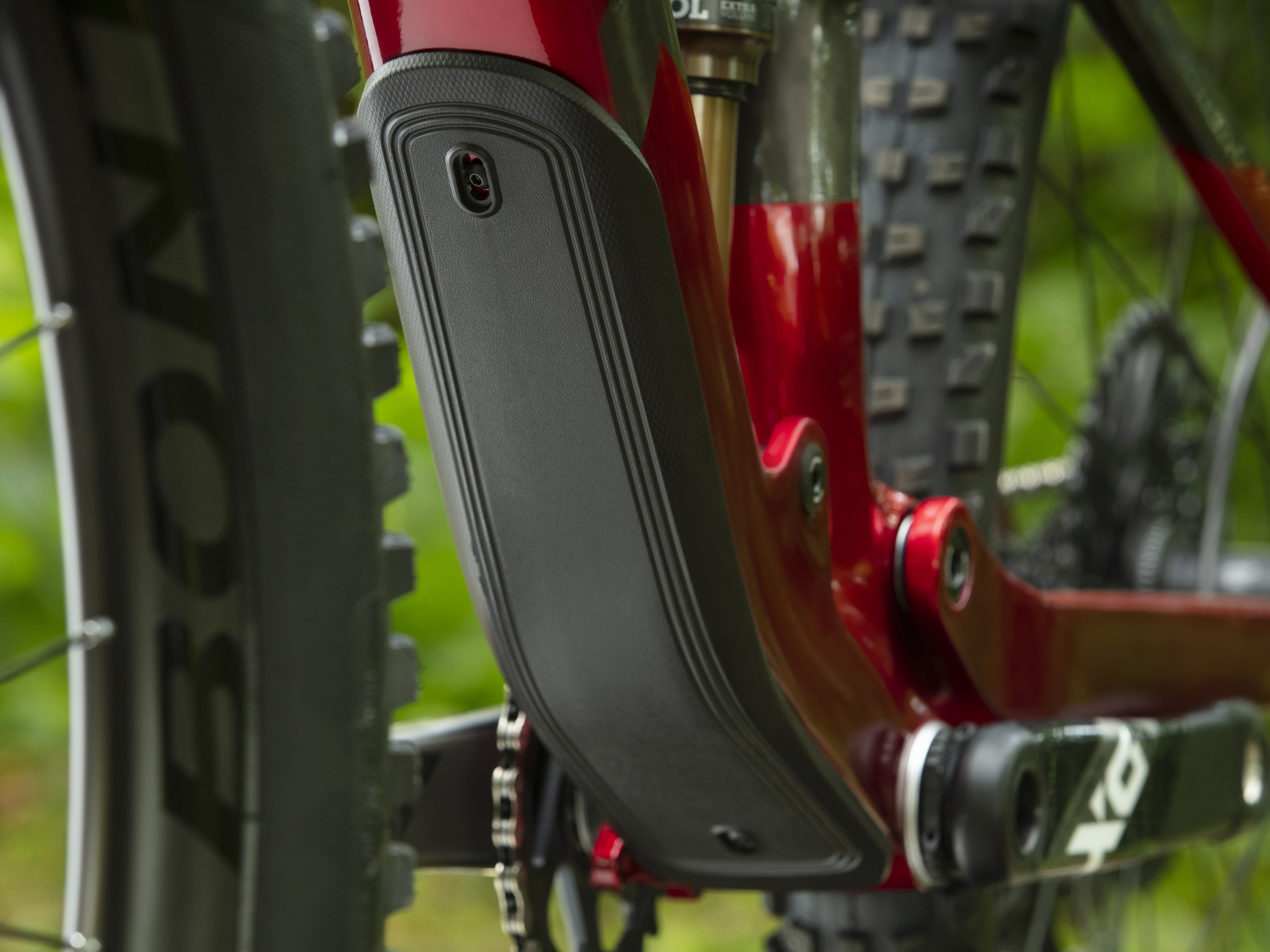 Côté construction du cadre, les versions carbone-aluminium disparaissent pour 2020. Le Fuel EX sera disponible soit en version tout carbone (triangle avant et arrière + biellette), soit en version tout aluminium (biellette en magnésium). Elles disposent toutes d’une généreuse protection vissée sur le tube diagonal, facile à remplacer en cas de problème.
